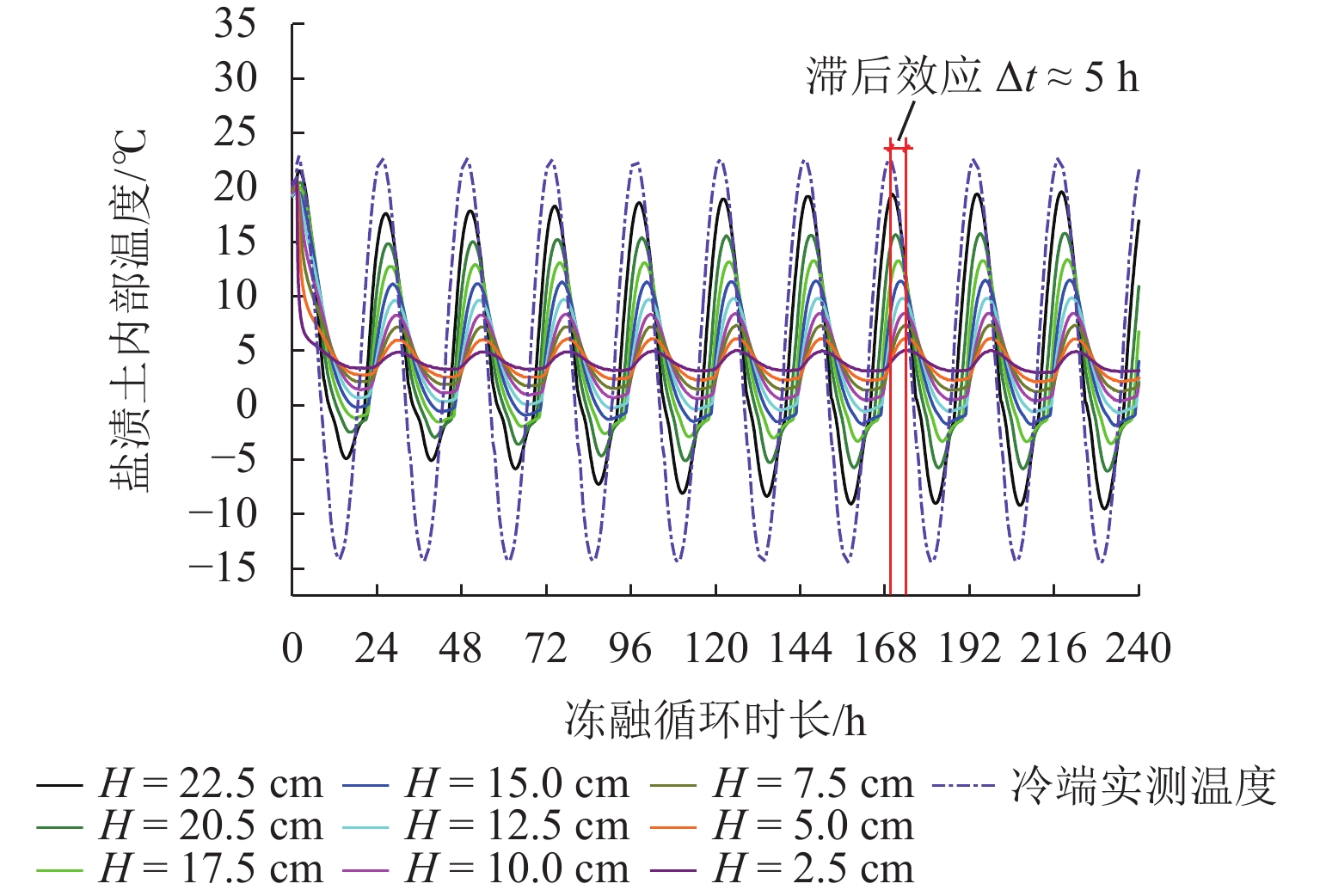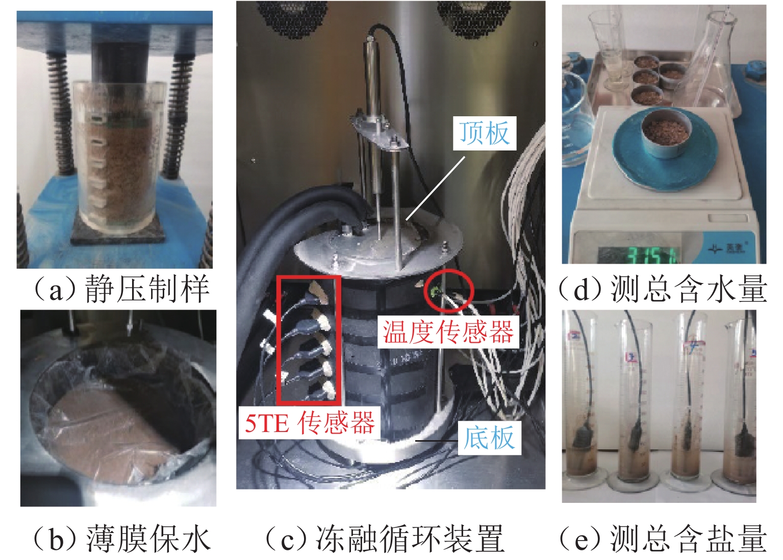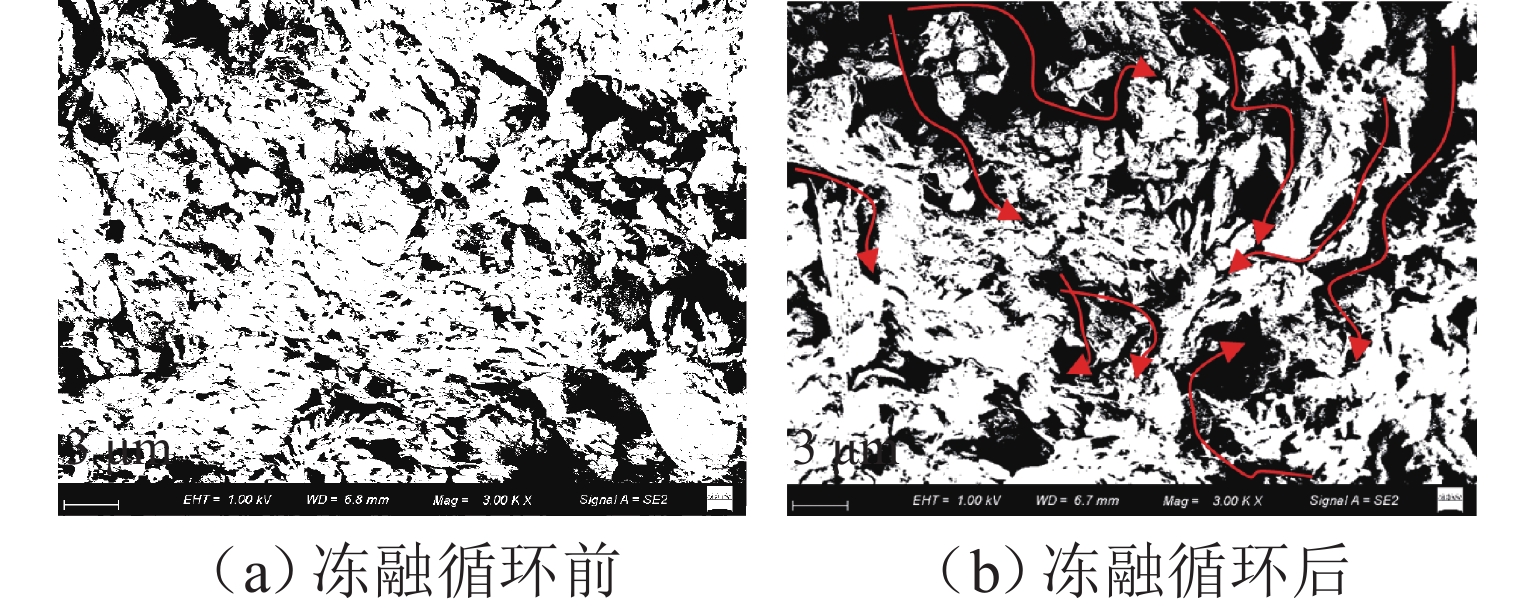 为研究冻融循环作用下硫酸盐渍土热-质迁移规律及结构损伤机理,以河西走廊盐渍土为研究对象,在无压补给条件下进行冻融循环试验,并借助核磁共振和SEM (scanning electron microscope)试验分析冻融循环前、后硫酸盐渍土的孔隙结构损伤机理. 研究表明:冻融循环作用下硫酸盐渍土内温度传递存在“深度效应”和“时间滞后效应”,时差约为5 h;冻结深度前期不断向下发展,后期逐渐趋于平稳,最大冻深为8.54 cm;溶液补给量随温度降低而增大,升高而减小;冻融循环240 h后水、盐含量在冻结区增大,非冻结区基本不变;盐渍土盐冻胀变形随温度变化呈周期性盐冻胀-融溶沉规律发展,且存在位移滞后温度效应;盐渍土经历一系列反复“冻结—冷凝—结晶—融化—溶解”过程后,中孔隙和大孔隙明显增多,并形成贯通的裂隙,土体结构由冻融前的片层状结构转变为絮状结构.