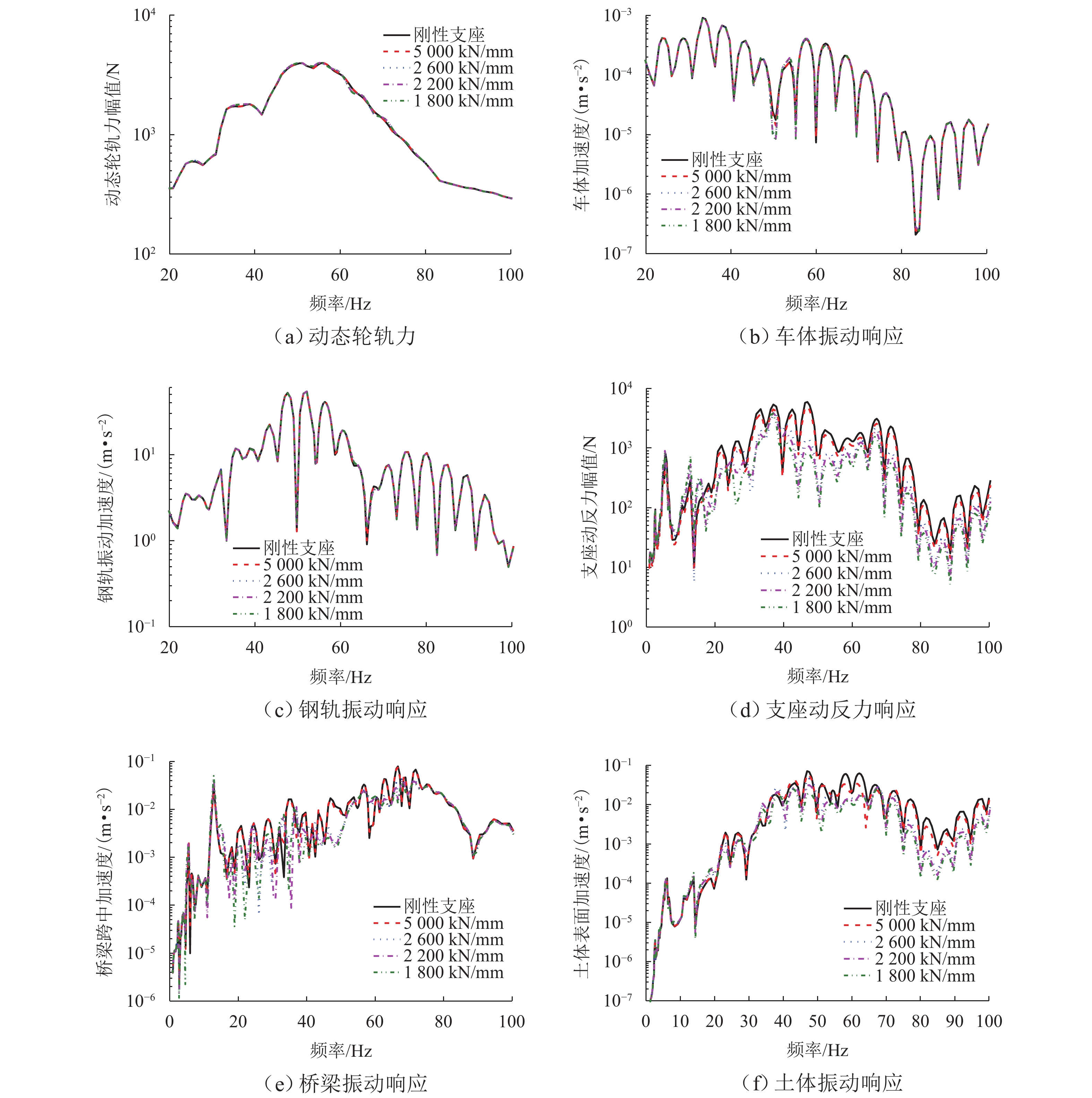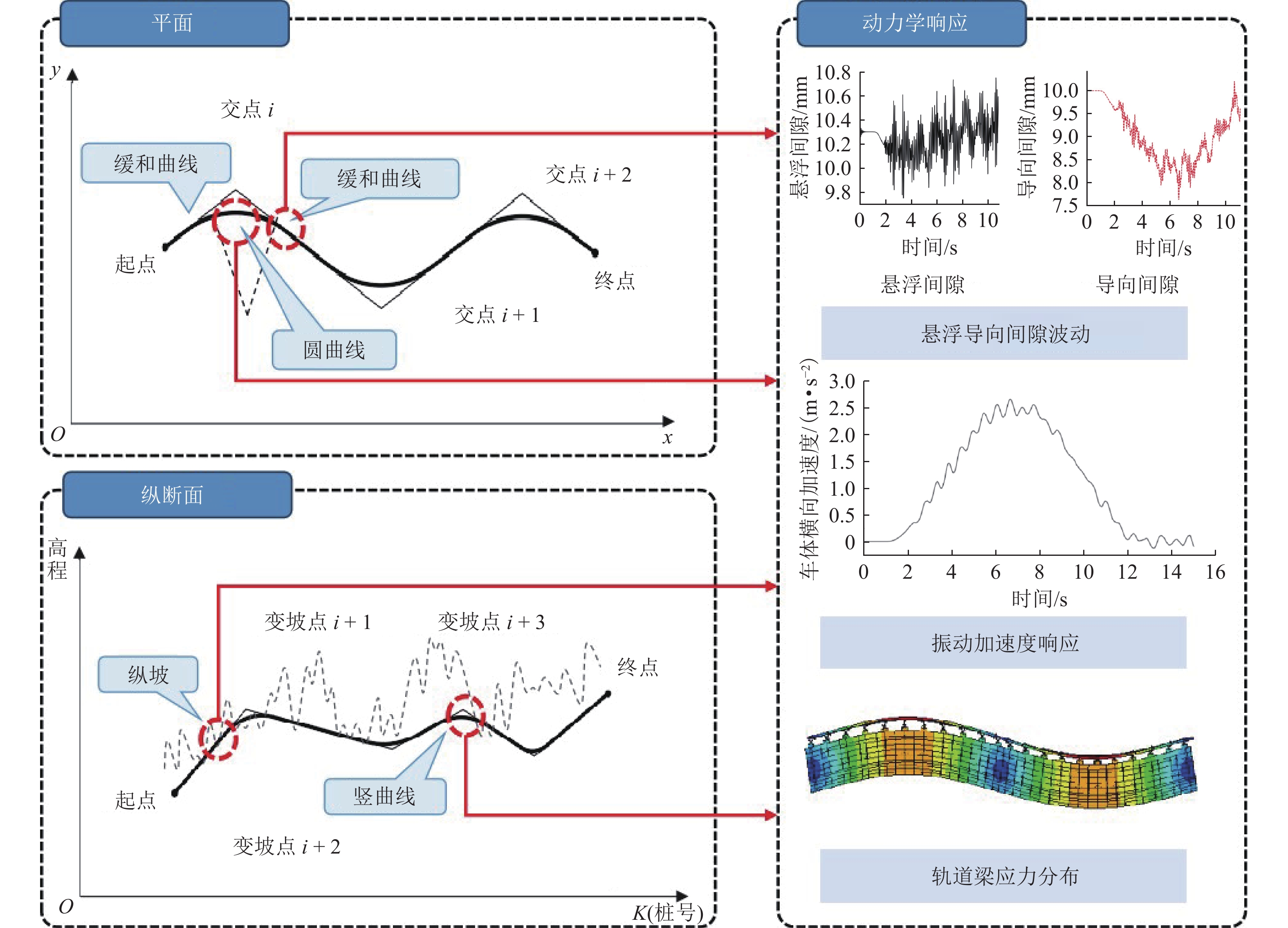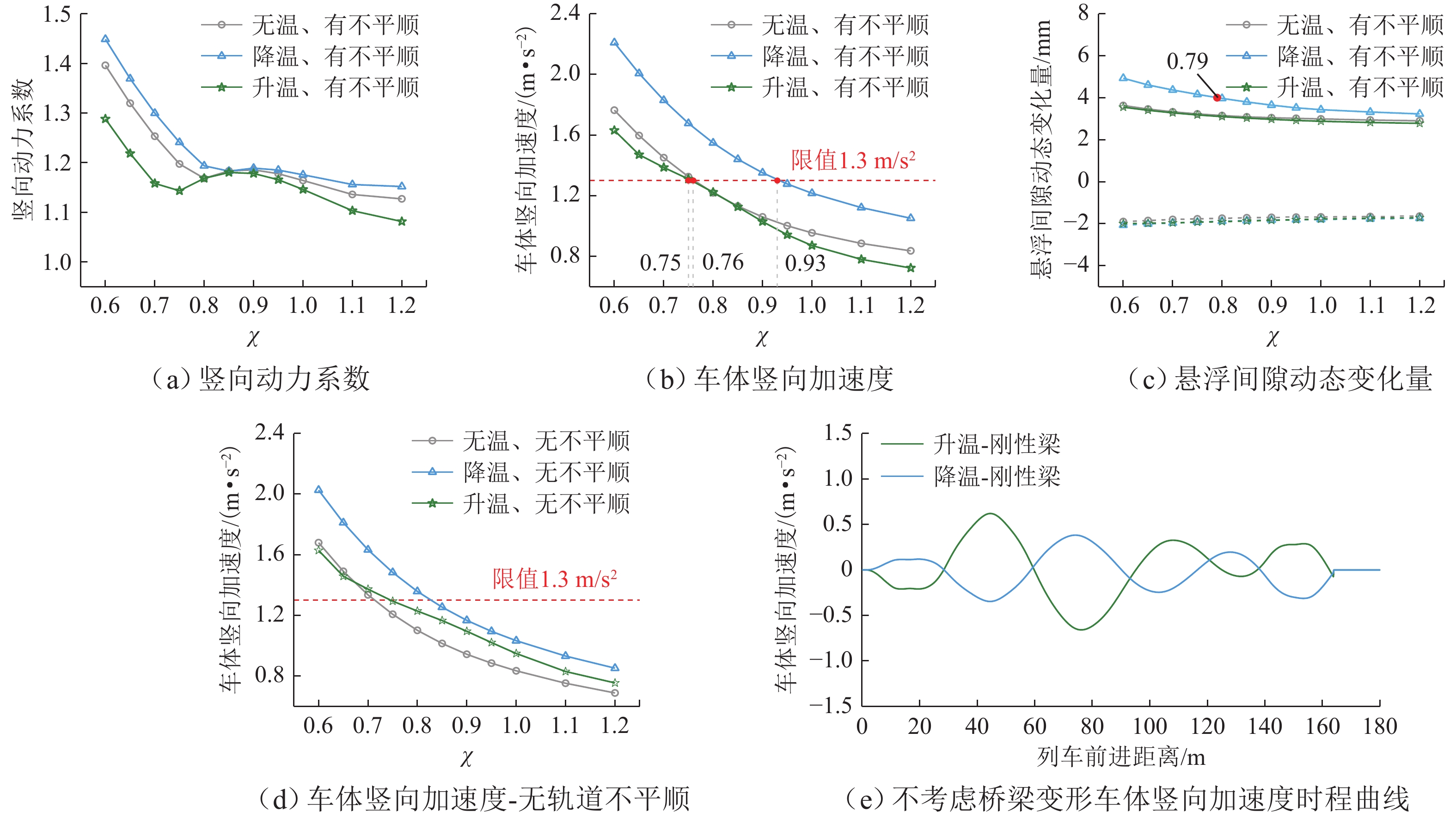 竖向刚度对保证高速磁浮列车在桥上行车安全和乘坐舒适性具有重要意义,是桥梁的重要设计指标之一. 以某3跨连续梁为研究对象,调整截面惯性矩改变桥梁竖向刚度,在不同车速、额定悬浮间隙及温度作用下进行磁浮列车-桥耦合振动分析,讨论桥梁动力系数、车体加速度和悬浮间隙动态变化量随桥梁竖向刚度调整系数的变化规律. 结果表明:刚度调整系数下降至0.75,桥梁动力系数迅速增加,车体竖向加速度相较于悬浮间隙动态变化量对桥梁竖向刚度变化更敏感;车速越大、考虑降温变形时,桥梁竖向动力响应越大,轨道不平顺和额定悬浮间隙对动力系数影响不明显;车速越大、额定悬浮间隙越小,考虑轨道不平顺和降温变形影响时,相同车辆动力响应大小对应的桥梁竖向刚度调整系数越大.