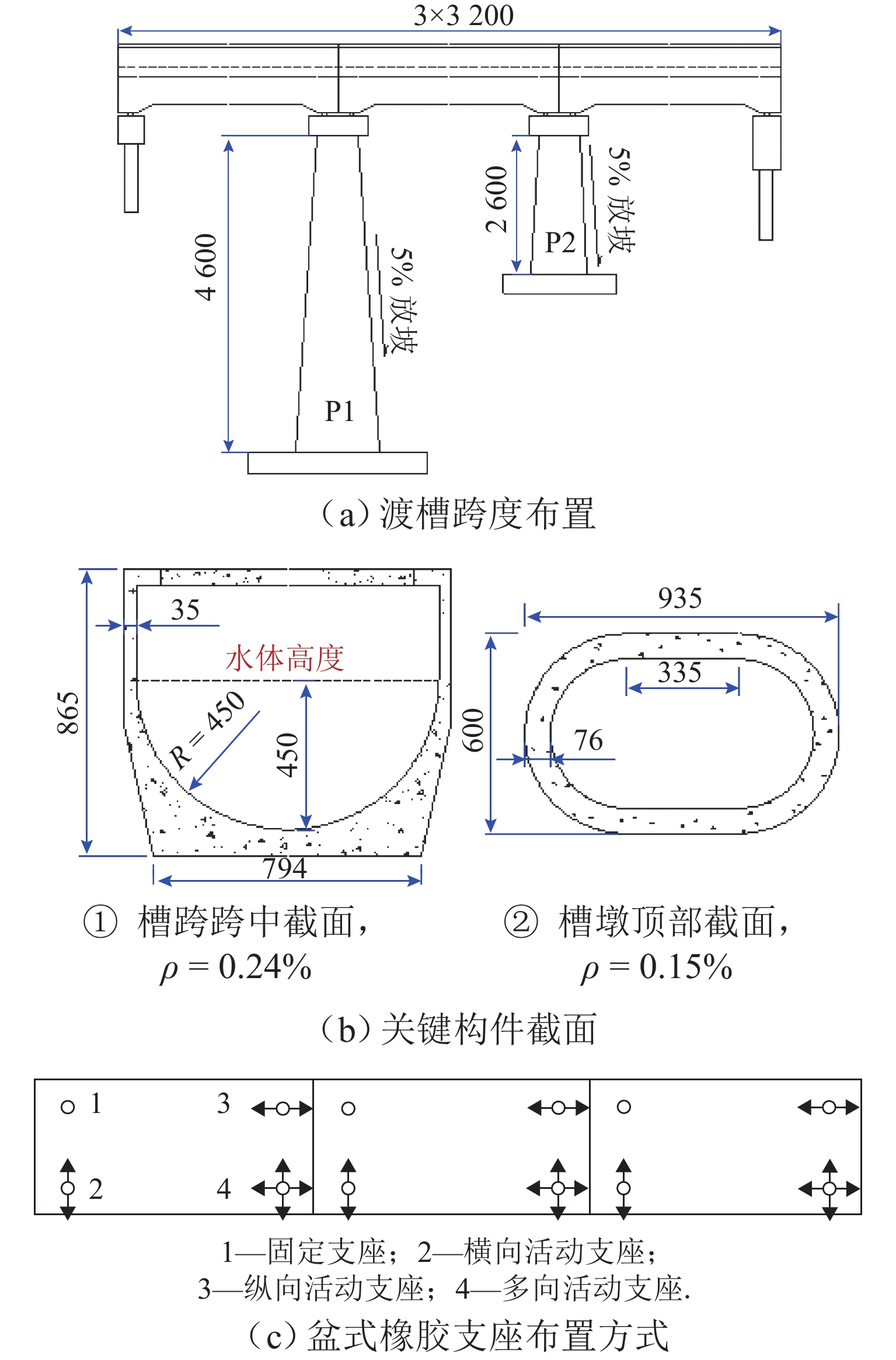 为探究地震下大型高墩渡槽止水的性能表现,基于流固耦合方法建立渡槽结构有限元模型,模拟动力效应下渡槽-水体的非线性耦合行为,通过引入止水变形失效阈值,重现槽跨间止水的失效过程,模拟止水失效后槽内水体的外溢;依托某实际高墩渡槽结构,通过非线性动力分析得到渡槽的宏细观地震响应,包括槽墩应变、支座位移、止水损伤等,揭示不同支座类型、减隔震装置对渡槽抗震性能的影响. 研究结果表明:在罕遇地震下,槽墩、槽身不会发生显著材料损伤,地震下渡槽结构安全具有保障;但设计地震下,渡槽止水即发生失效,无法保障渡槽震后保持正常引水功能;加入钢阻尼器可有效控制槽跨的变形,保障设计地震下渡槽止水不发生破坏,但罕遇地震下止水不可避免发生破坏,强震下的槽跨变形控制依然面临着挑战.