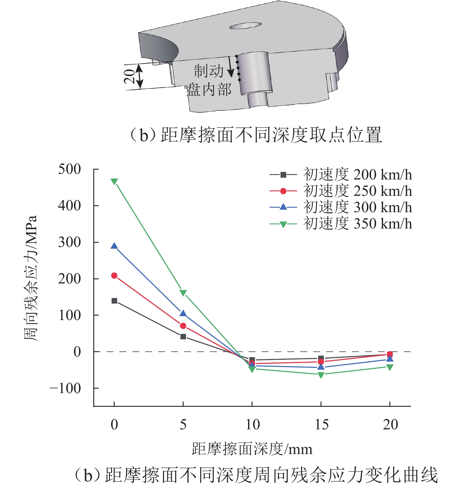 动车组制动盘在长期服役过程中会形成复杂的残余应力,进而使盘体在拆解后形成不可恢复的翘曲变形,为探究残余应力与翘曲变形对制动盘后续维修和重复利用可行性的影响,首先,通过测试动车组轮装铸钢制动盘材料不同温度下的拉伸应力-应变数据,构建对应的材料Ramberg-Osgood本构模型,在有限元软件中建立制动盘循环对称三维瞬态仿真模型;其次,针对列车不同制动初速度、不同平均减速度等制动工况,采用间接耦合方法分析制动盘表层与心部残余应力的形成与平衡过程,研究制动盘结构约束释放后的翘曲变形量变化,采用分段函数与多项式拟合制动盘变形量与制动能量、热输入功率的函数关系;最后,通过对服役后的制动盘进行翘曲变形量测量与X射线残余应力测试,对比分析了对应仿真条件时制动盘摩擦面残余应力分布规律,发现仿真结果与实测数据具有较好的数据和趋势一致性. 研究表明:制动盘翘曲变形量与制动能量、制动减速度呈正相关关系,制动工况越严苛制动盘翘曲变形量越大;仿真与实测均表明高残余拉应力位于摩擦面中部螺栓孔附近,且制动工况越严苛残余拉应力值越大.