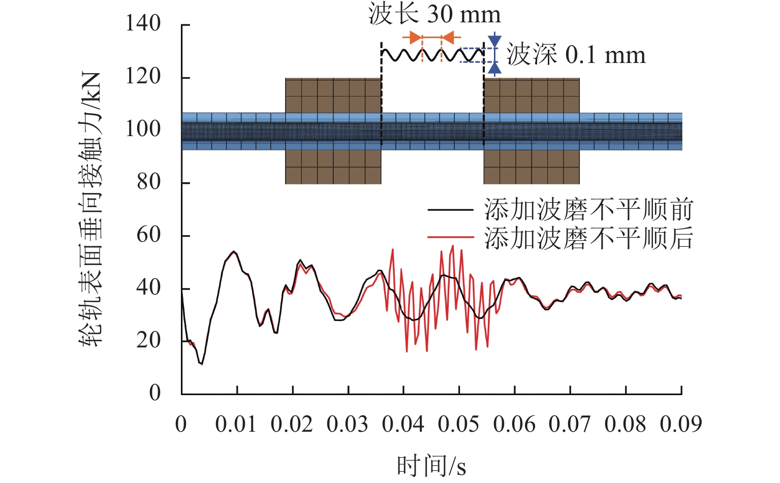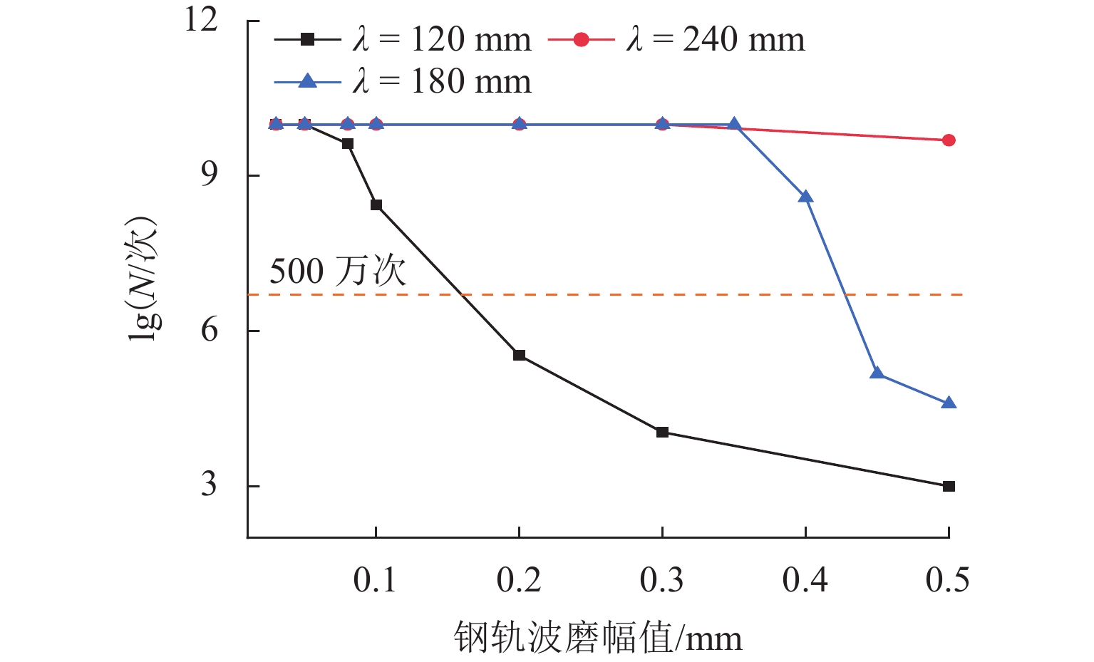 为研究地铁小半径曲线轨道上e型弹条异常断裂的原因,通过长期跟踪和测量成都地铁X号线钢轨波磨的发展情况,并基于摩擦自激振动理论,建立轮对-轨道-扣件系统的全实体单元有限元模型;采用隐式动态分析方法和谐响应分析方法,研究短波长波磨、长波长波磨对e型弹条振动疲劳寿命的影响. 研究表明:这2种类型的钢轨波磨都会导致地铁e型弹条振动疲劳寿命减小;波磨幅值越大,导致弹条振动疲劳寿命越小;钢轨波磨不仅能够引起e型弹条产生与钢轨波磨“同频”的受迫振动,还容易激发弹条产生该频率的倍频振动;对于短波长波磨而言,由于2倍频的存在,在相同波深幅值的短波长波磨影响下,25 mm 和40 mm波长的钢轨波磨最容易导致e型弹条产生振动疲劳断裂;波长为120 mm的长波长波磨的波深幅值较大时,激发出的6倍频振动导致弹条振动疲劳寿命急剧减小;由于振动强度的减弱,波长为240 mm的长波长波磨对弹条振动疲劳寿命的影响有限.