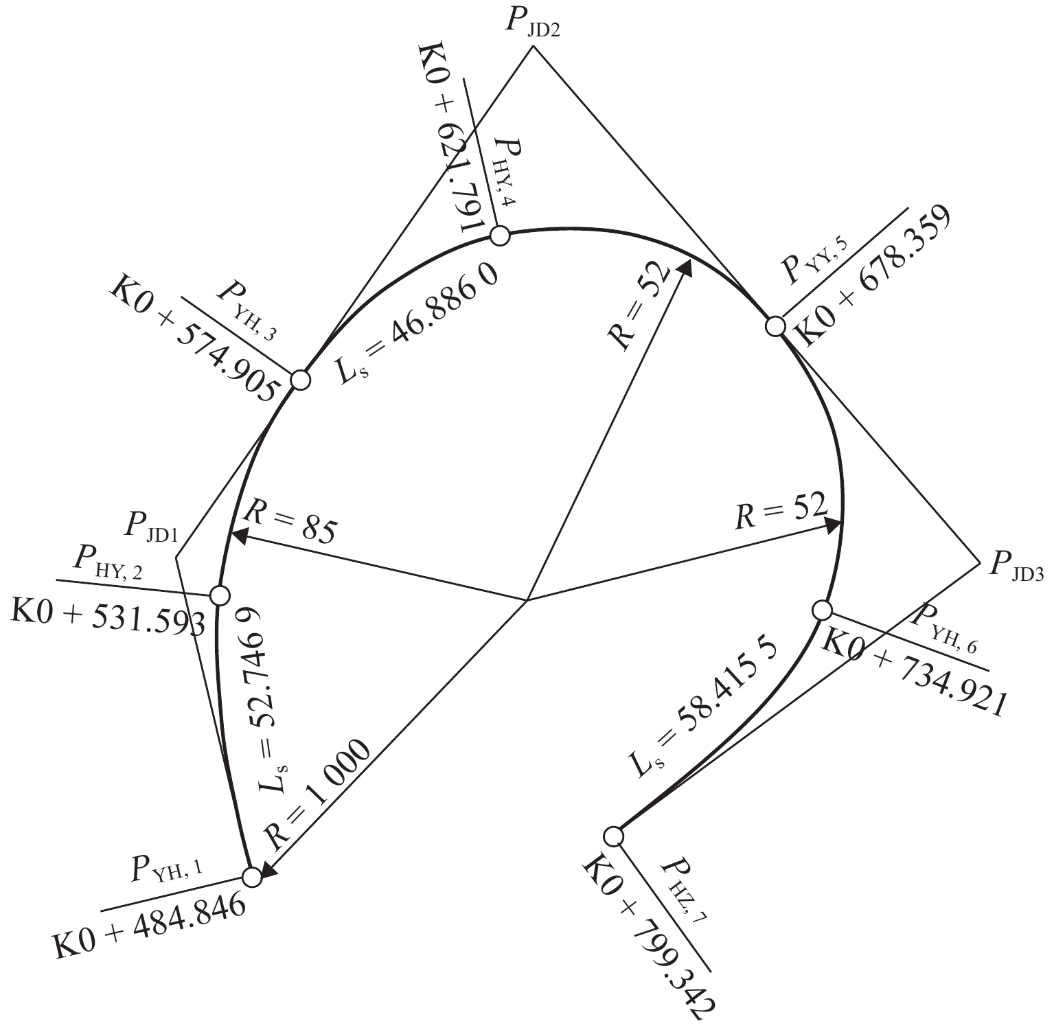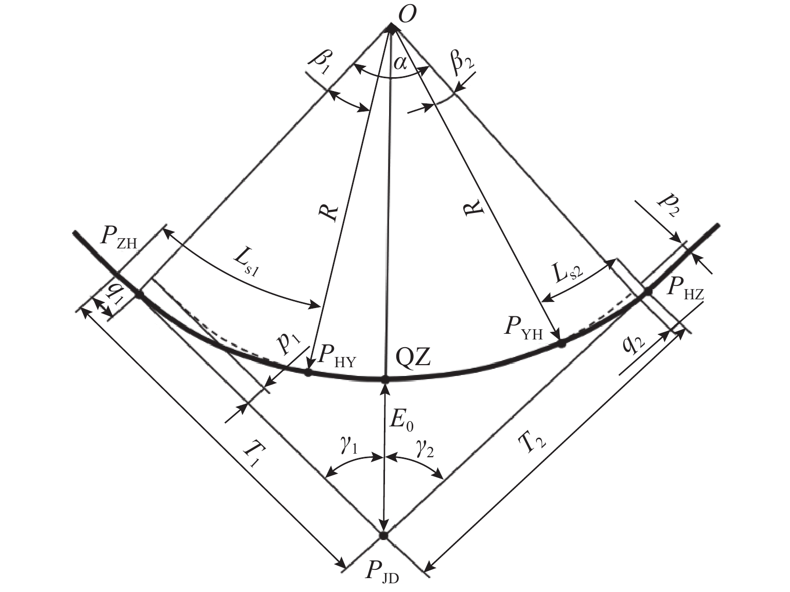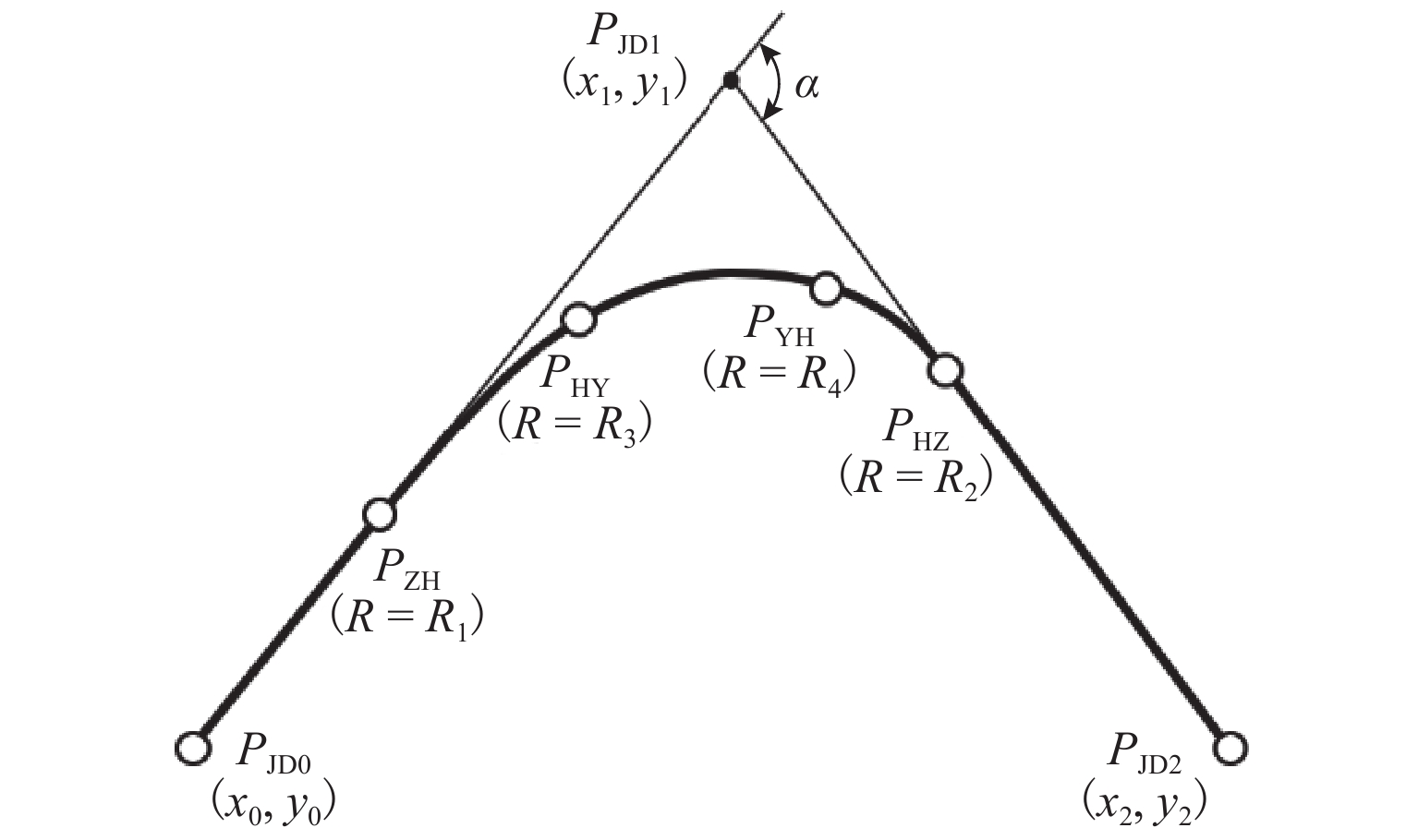 为解决公路线形设计过程中交点法依赖的“非对称基本型”计算模型,在转弯曲线包含非完整缓和曲线时出现计算失效的问题,以“非对称基本型”计算模型为基础,通过分析计算模型在解算非完整缓和曲线场景下的失效原因,对计算模型结构与求解逻辑予以优化改进,进而提出“非对称通用型”计算模型. 此模型新定义了“缓和曲线方向”,通过判断缓和曲线曲率变化趋势与路线行进方向间的关系,将缓和曲线划分为正向和逆向两类,再根据缓和曲线在单曲线中的前后关系,建立特殊局部坐标系,通过几何推导,得出非完整缓和曲线切线增长值和曲线内移值,进而可以使用“非对称基本型”计算模型进行求解. 研究表明:“非对称通用型”计算模型突破了“非对称基本型”计算模型对线形组合类型的限制,允许缓和曲线起、终点曲率半径可为任意值;通过与传统线元法对同一复杂曲线段进行解算对比,控制桩号里程值及控制桩号坐标的计算差异均小于1 mm,满足工程精度要求.