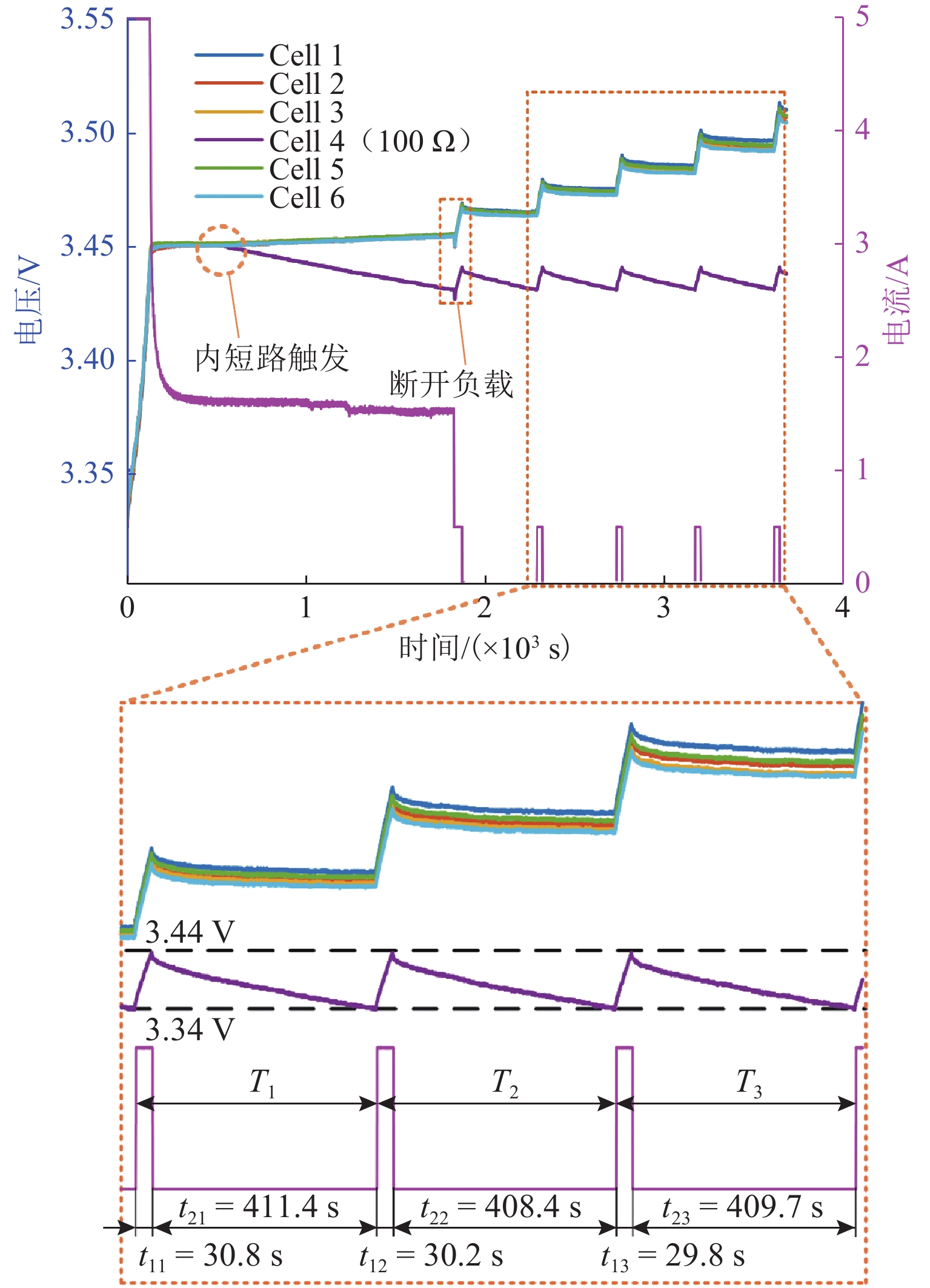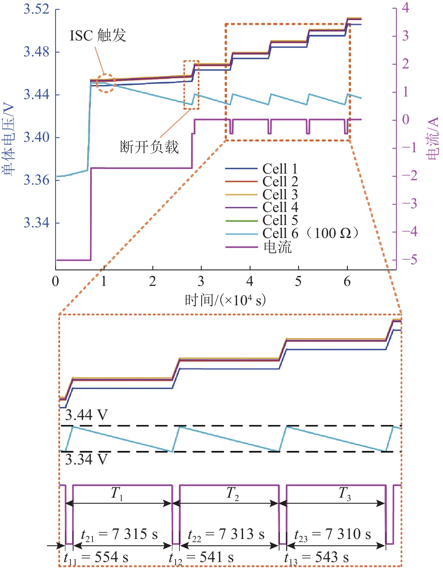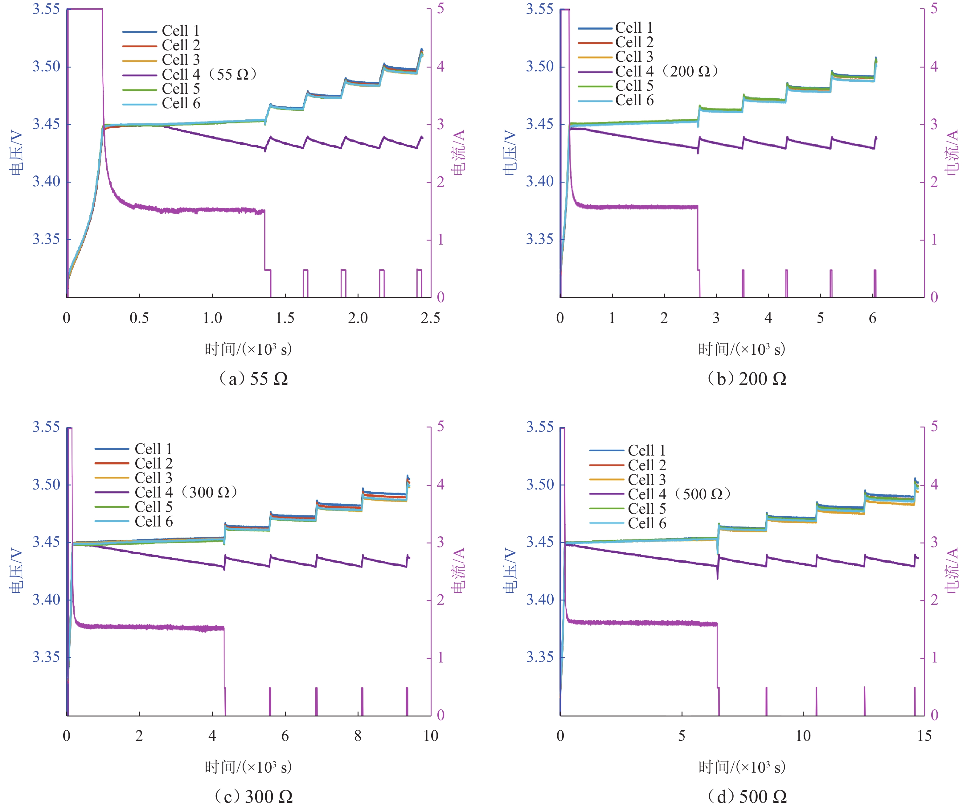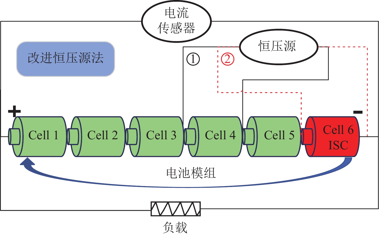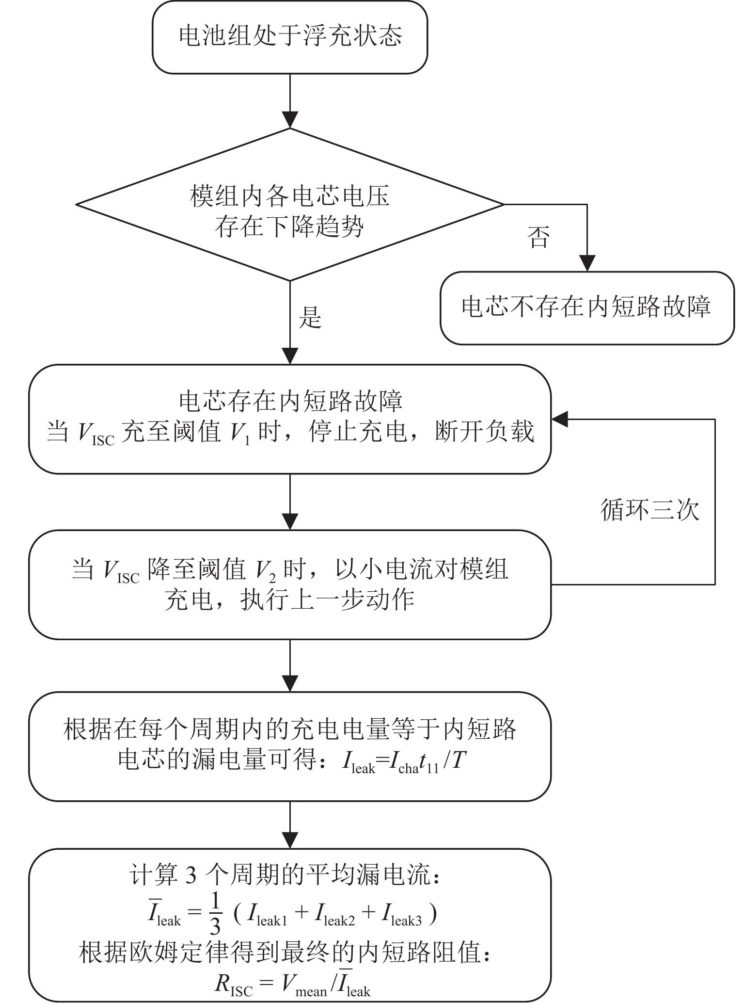 锂离子电池的浮充工况广泛存在于备用电源、通讯基站等场景,是一种状态趋于稳定的特殊工况;然而,这种稳定性却对该工况下电池内短路定量诊断带来挑战. 本文提出一种基于间歇式充电的锂离子电池组早期内短路定量诊断方法,该方法利用重复的“充电-断电”过程,根据充电电量与漏电量的关系计算出等效漏电流,实现内短路的快速定量诊断. 仿真与实验结果表明:对于500 Ω级别的电池微短路,所提出方法的诊断误差小于2%,检测时间约为33 min,实现对浮充电工况下电池内短路的早期高精度定量诊断;在诊断100 Ω级别中,所提出方法相较于常规恒压源方法内短路的精度提高超16倍以上,且计算负担非常低,对提高电池组安全性具有重要意义.