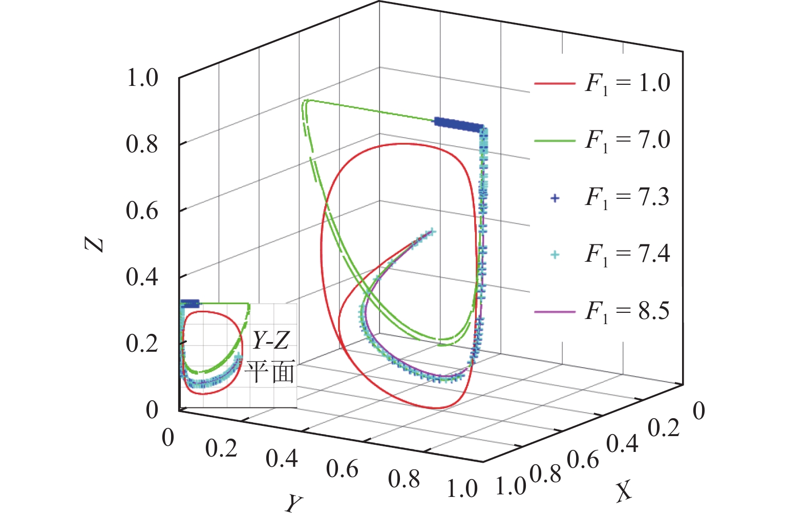 为研究碰撞振动系统的动力学演化规律和驱动性能,首先,考虑外部环境不连续力与内部非光滑碰撞,建立一类碰撞与黏滑振动驱动系统;其次,基于不连续动力系统的流转换理论与映射动力学理论,刻画系统相空间内的不连续边界和子区域映射关系,采用分段分析法描绘系统相空间运行轨迹;最后,通过数值协同仿真研究参数域内系统周期运动分布转迁机理和平均速度分布规律. 研究表明:在激励频率 、间隙 双参数平面内,系统正反向最大平均驱动速度集中于主共振区,呈现周期1-1-1(或1-1-2)运动类型;结合参数域内系统驱动方向和驱动速度与系统参数的关联关系,可通过调控系统参数与外激励频率实现宽速驱动;低频小间隙区存在2种序列擦边分岔,一种在低频区随着激励频率减小,右侧擦边分岔诱导系统碰撞次数依次增加,另一种在超低频区围绕碰撞子空间内的平衡点衍生出序列相轨迹,泛延过程中出现左侧擦边分岔,系统呈现出簇发振荡的现象.