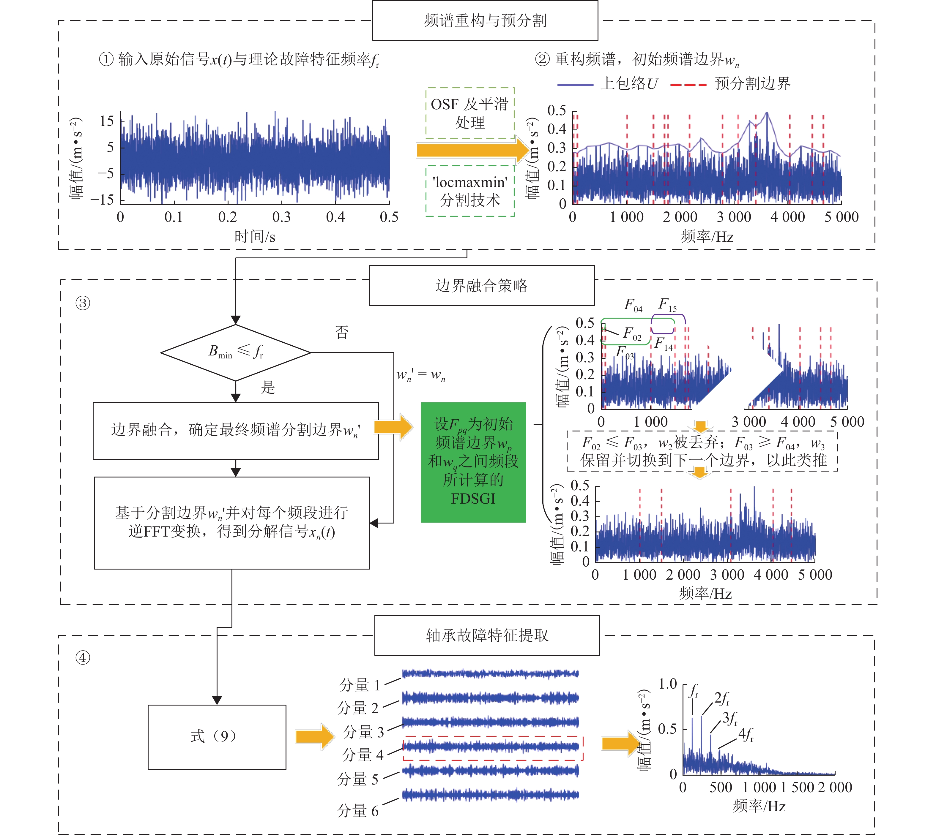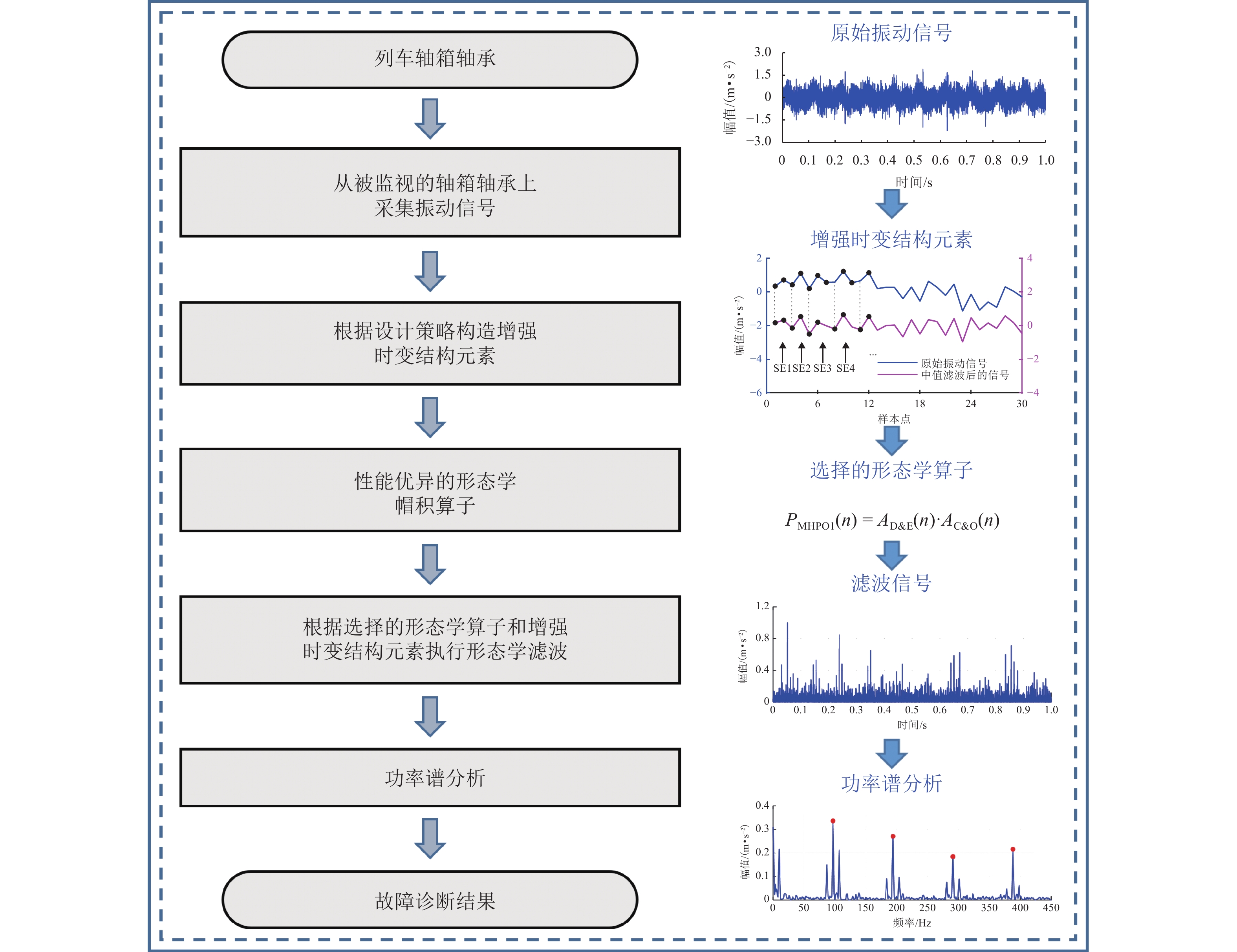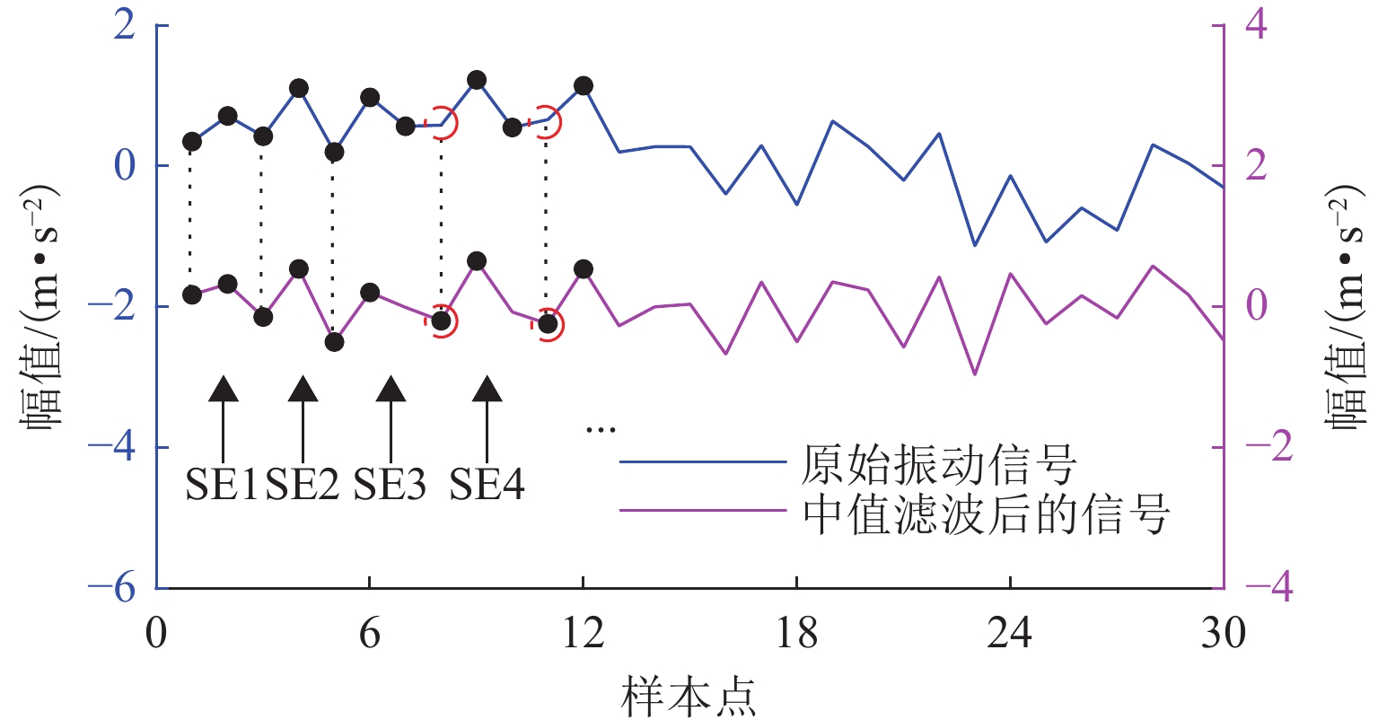 形态学滤波是一种用于轴承故障诊断的有效方法,能够从嘈杂的振动信号中恢复瞬态脉冲特征,其中结构元素形状和长度的选择对形态学滤波性能有着至关重要的影响. 为解决这个问题,提出一种基于中值滤波的增强时变结构元素,以更准确地匹配和提取隐藏在嘈杂信号中的周期性瞬态特征;此外,将功率谱(即自相关信号的频谱)应用于滤波信号,以进一步增强故障相关分量并消除宽带噪声污染;最后,提出一种结合增强时变结构元素和功率谱的轴承故障诊断方法——增强时变形态学滤波. 对仿真数据和2个铁路轴箱轴承试验台测量数据的分析结果表明:相较于对比方法,增强时变形态学滤波具有优异的故障特征提取性能,能够在复杂噪声干扰下准确识别轴承的内圈、外圈和滚动体故障,并取得更高的性能量化指标和更少的计算消耗.
