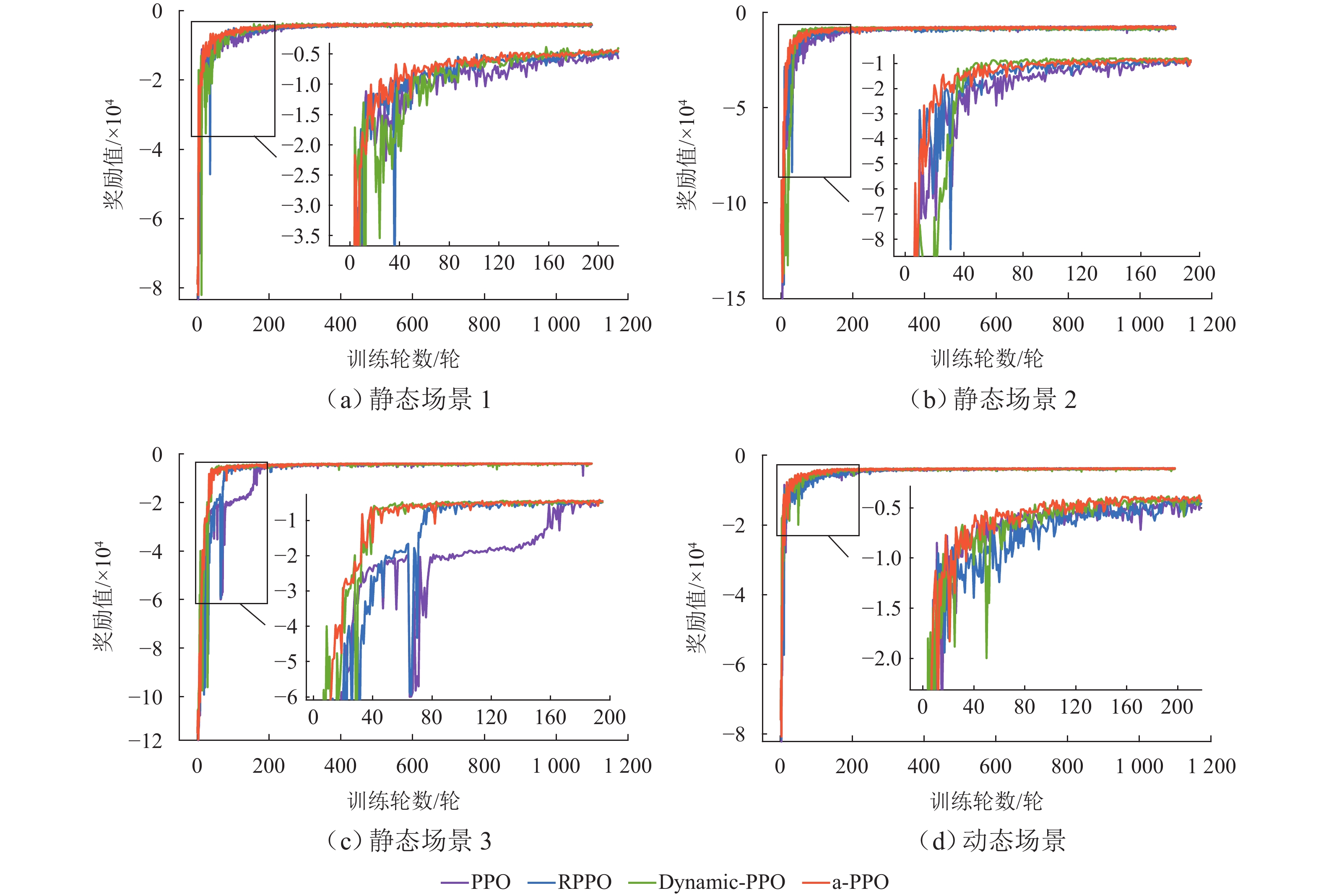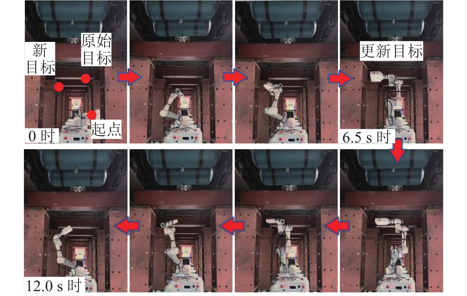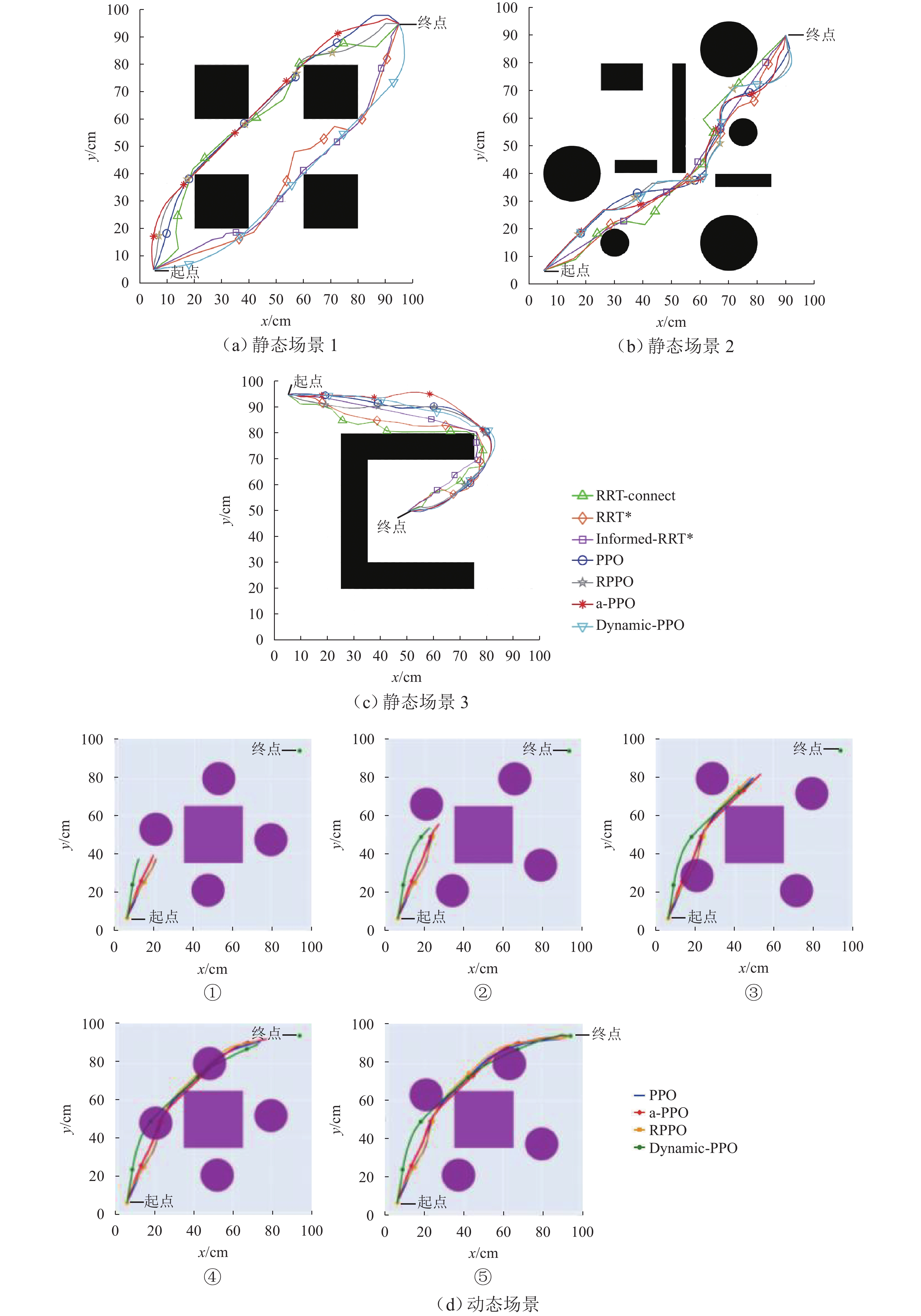 为满足列车底部场景中巡检机械臂主动配合工作人员的人机协作需求,并提高PPO(proximal policy optimization, PPO)算法的收敛速度,提出一种自适应PPO(adaptive-PPO, a-PPO)算法,并将其应用于列检机械臂的在线运动规划. 首先,设计系统模型,根据当前环境状态即刻输出策略动作;然后,引入几何强化学习构建奖励函数,通过智能体的探索不断优化奖励值分布;接着,基于策略更新前后的相似度自适应地确定裁剪值,形成a-PPO算法;最后,通过在二维地图上对比分析a-PPO算法的改进效果,并验证其在仿真和真实列车场景中的可行性和有效性. 结果表明:在二维平面仿真中,a-PPO算法在收敛速度上优于其他PPO算法,且路径稳定性显著提高,路径长度标准差平均比PPO算法低16.786%,比Informed-RRT*算法低66.179%;仿真与真实列车场景的应用实验中,机械臂可实现运动过程中动态更改目标点和主动规避动态障碍物,展现出对动态环境的适应能力.