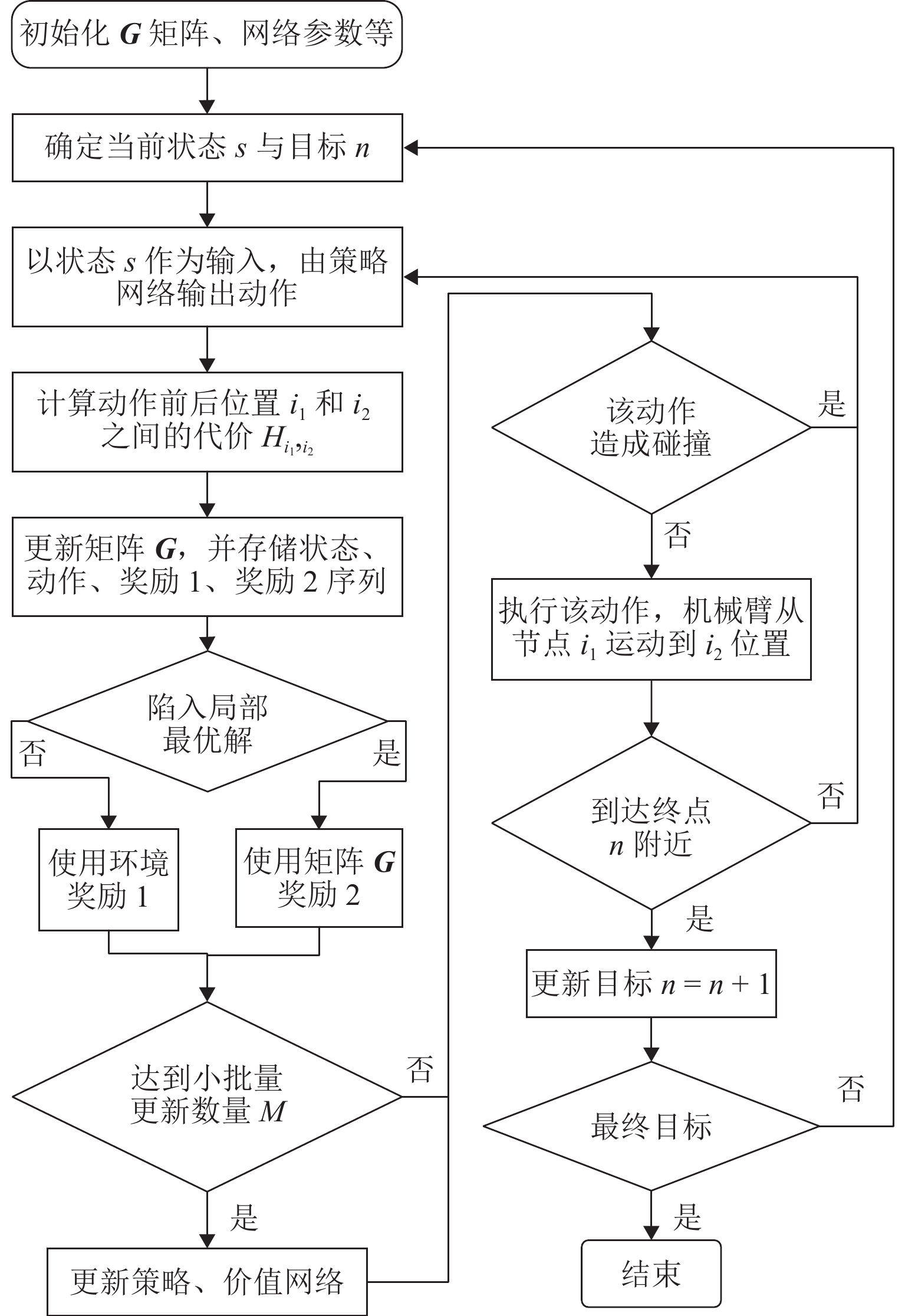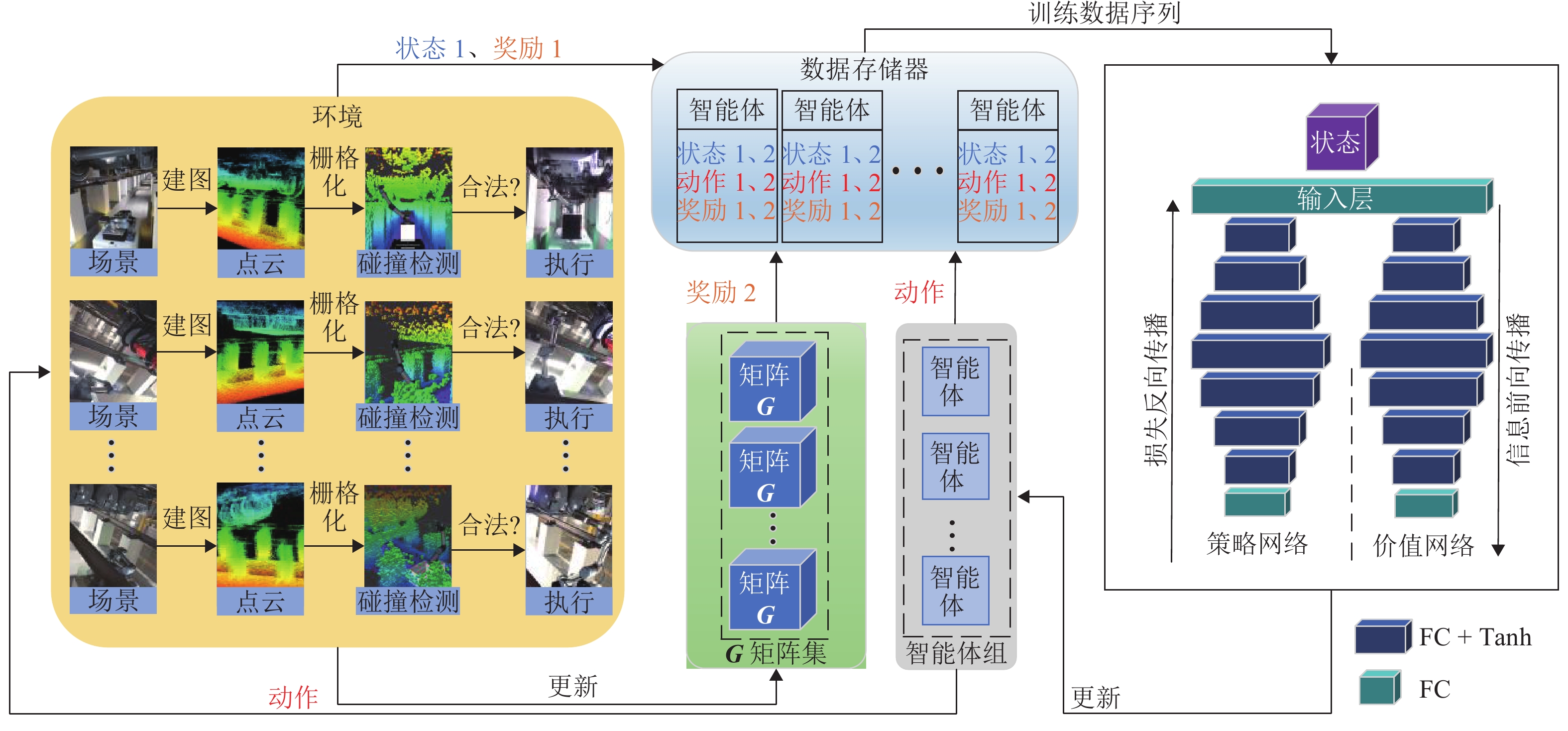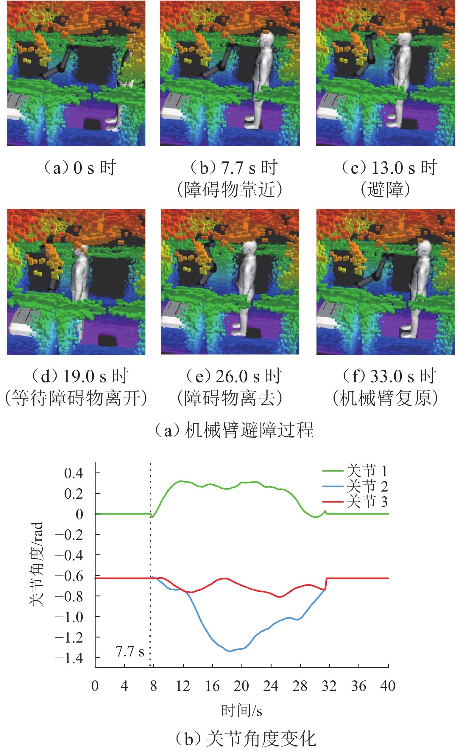 为满足列车底部场景中巡检机械臂主动配合工作人员的人机协作需求,并提高PPO(proximal policy optimization, PPO)算法的收敛速度,提出一种自适应PPO(adaptive-PPO, a-PPO)算法,并将其应用于列检机械臂的在线运动规划. 首先,设计系统模型,根据当前环境状态即刻输出策略动作;然后,引入几何强化学习构建奖励函数,通过智能体的探索不断优化奖励值分布;接着,基于策略更新前后的相似度自适应地确定裁剪值,形成a-PPO算法;最后,通过在二维地图上对比分析a-PPO算法的改进效果,并验证其在仿真和真实列车场景中的可行性和有效性. 结果表明:在二维平面仿真中,a-PPO算法在收敛速度上优于其他PPO算法,且路径稳定性显著提高,路径长度标准差平均比PPO算法低16.786%,比Informed-RRT*算法低66.179%;仿真与真实列车场景的应用实验中,机械臂可实现运动过程中动态更改目标点和主动规避动态障碍物,展现出对动态环境的适应能力.
