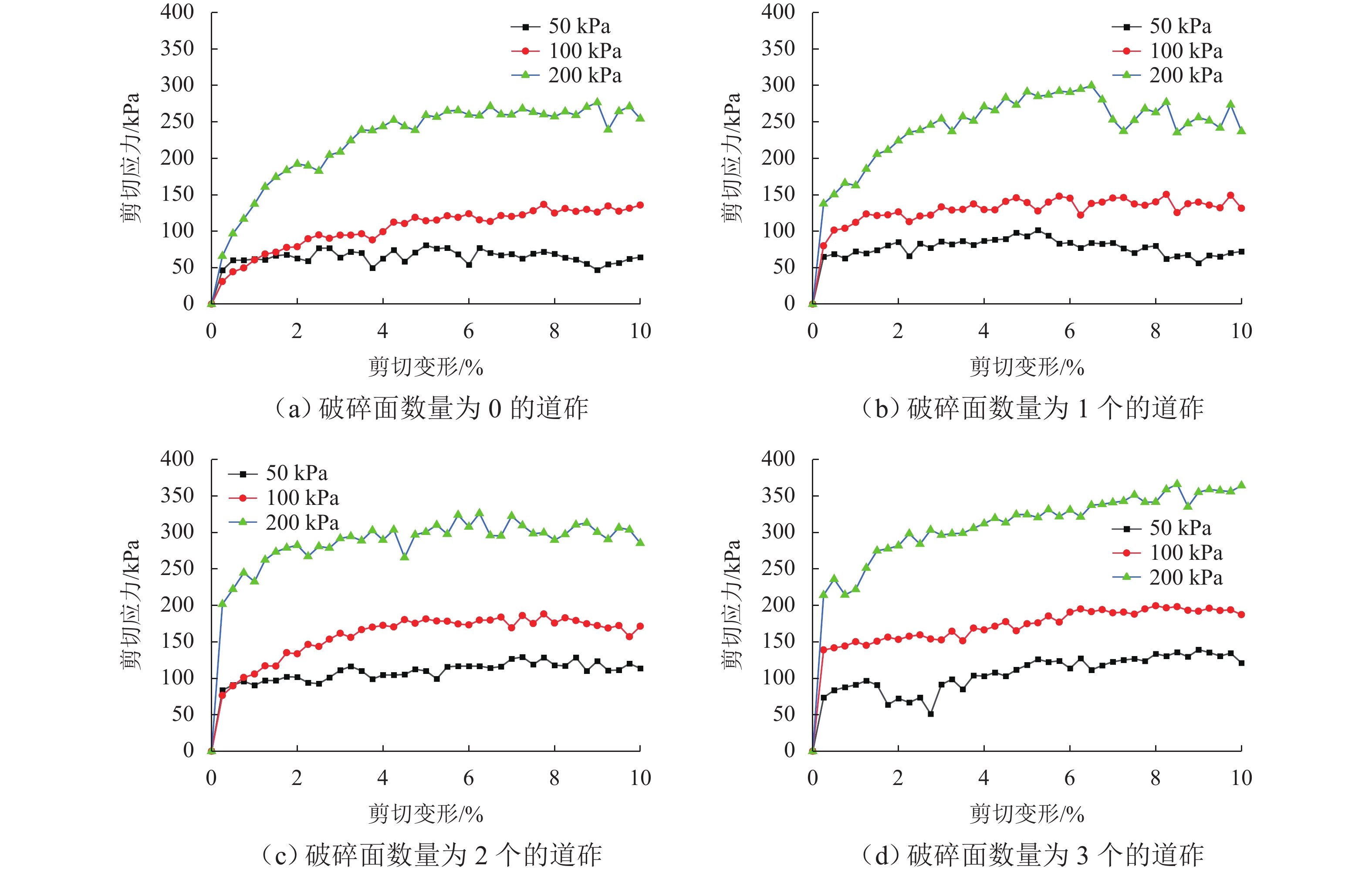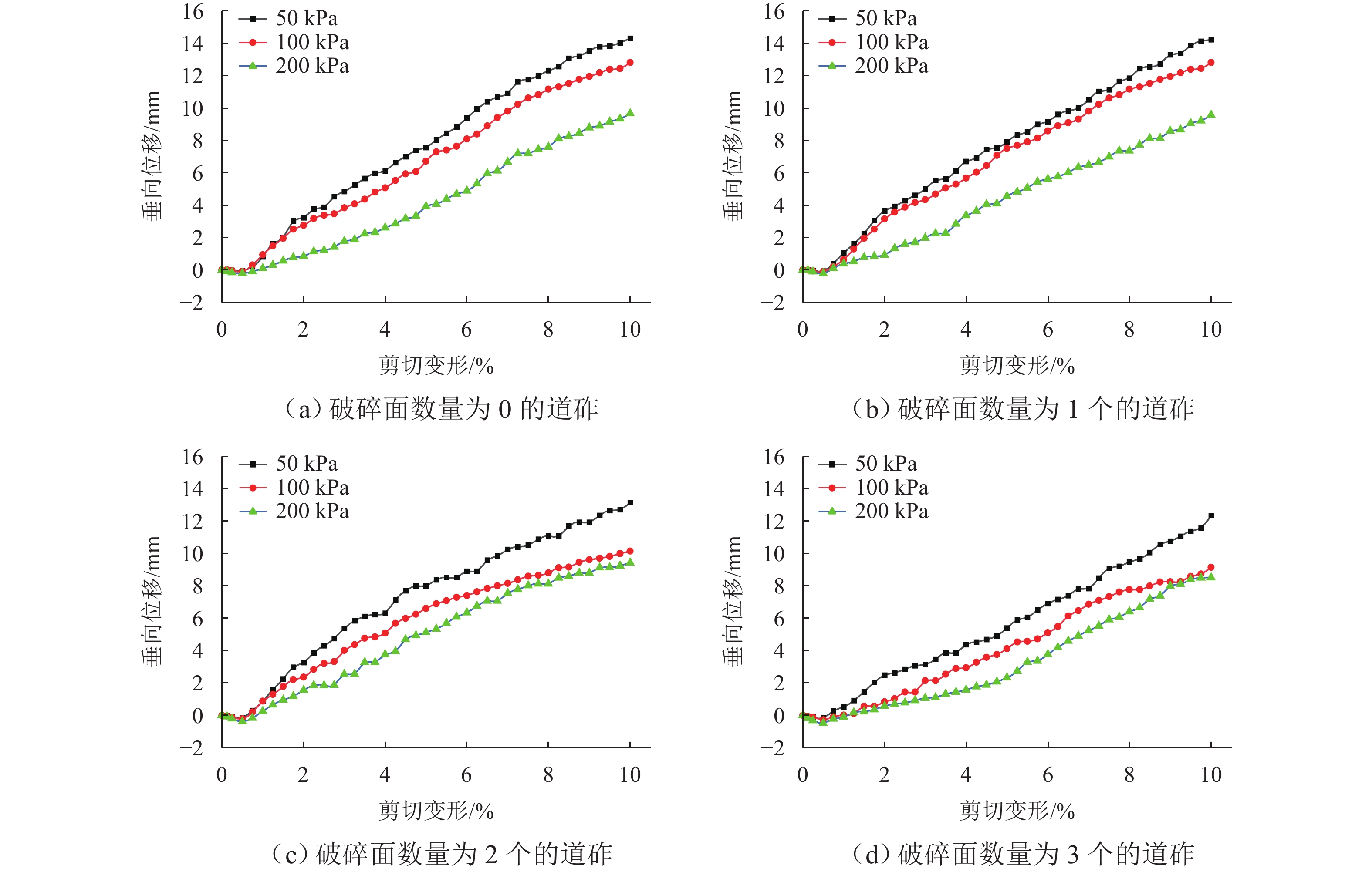 为了研究道砟颗粒的破碎面数目对道床直剪性能的影响规律,首先,对光滑的河卵石进行破碎,得到拥有不同破碎面数量的道砟集料;其次,针对以上工况在不同垂向应力下开展直剪试验,得到剪切过程中道砟集料的应力应变关系和变形特性;最后,通过公式计算,得出道砟集料的峰值抗剪强度与内摩擦角随垂向应力的变化规律. 研究结果表明:在强度特性方面,道砟破碎面数量为0、1、2、3个时,同一垂向应力下道砟集料的剪切强度和内摩擦角在一定范围内会随着道砟破碎面数量的增加而增加,剪切强度依次提升了14.7%~25.6%、12.2%~27.4%、6.0%~10.1%;对于变形特性,道砟集料的剪缩特性会随着破碎面数目的增加而增加,最大增加了76.4%,而剪胀特性会随着破碎面数目的增加而减少,最大减少了20.8%.