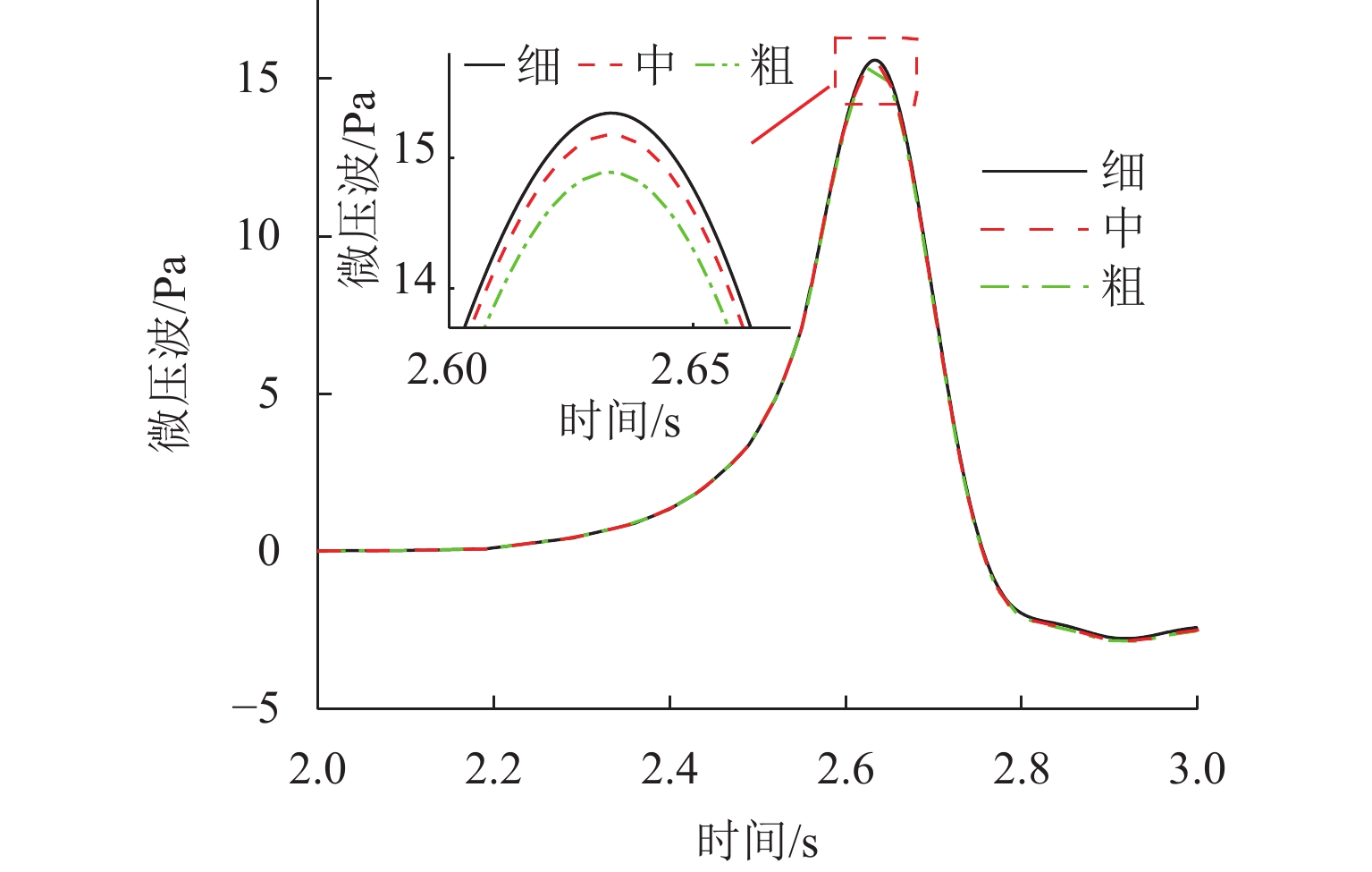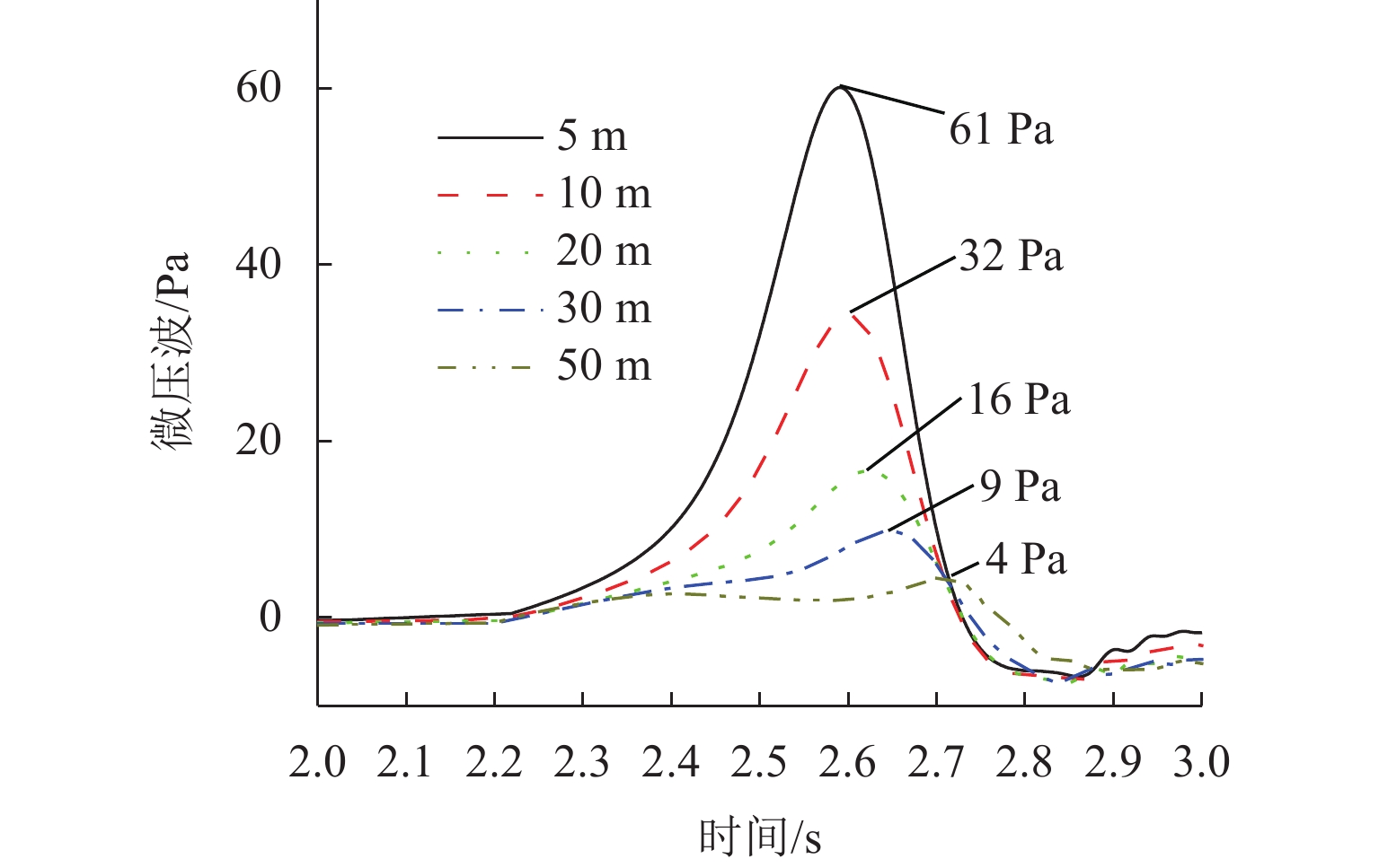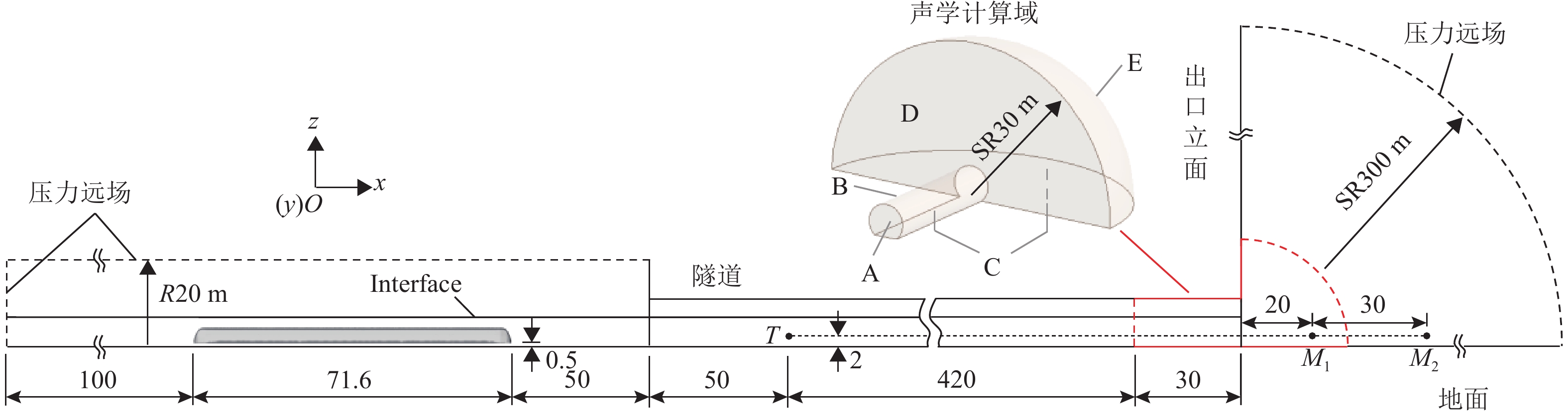 高速地铁进入隧道产生的初始压缩波传播到隧道出口时会产生微压波并引发噪声,某些情况下还会出现音爆现象,给当地居民带来严重的环境问题. 为有效控制隧道出口的微压波噪声,对微压波噪声的声学特性进行数值模拟研究,并提出一种针对低频微压波噪声的声学抑制结构. 首先,采用大涡模拟(LES)方法获取隧道出口的近场非定常流场数据,使用Ffowcs Williams-Hawkings (FW-H)声学类比来预测微压波噪声的声源类型;其次,基于非定常流场数据采用声学有限元法(AFEM)计算微压波噪声的远场辐射,并分析隧道洞口声学结构对微压波噪声的减缓效果;最后,通过动模型试验验证数值方法的准确性. 结果表明:当列车速度为160 km/h时,隧道出口微压波噪声中偶极子噪声占据主导地位;偶极子噪声以半椭球面的形式向外辐射,其能量主要集中在20 Hz频率以下,峰值频率为4 Hz;偶极子噪声沿隧道出口方向上的衰减满足指数衰减规律;隧道洞口增设声学结构后微压波噪声有明显降低,隧道洞口外不同纵向平面上的噪声声压级降低约3 dB,标准测点(20 m和50 m)处的声压级分别降低3.54 dB和2.62 dB.