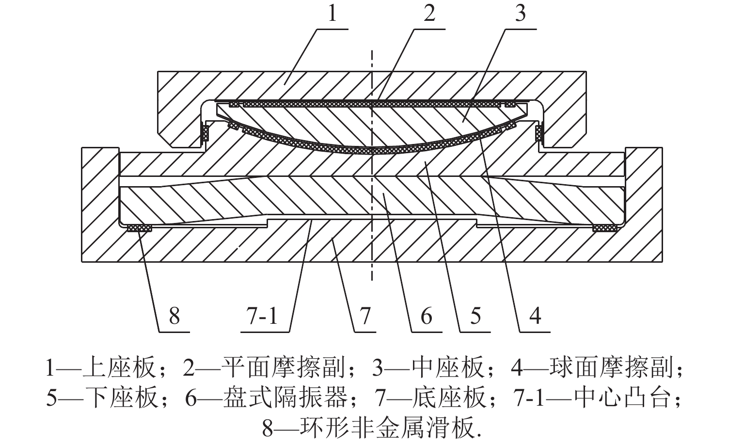 为降低高铁桥梁车致振动对周围环境的影响,首先,提出一种内置金属盘式隔振器的桥梁竖向隔振球型支座,给出支座力学本构模型和整体竖向刚度计算方法;结合仿真和试验对比研究金属盘式隔振器竖向刚度的设计符合性,并仿真分析不同摩擦支承面对金属盘式隔振器竖向刚度和应力的影响;其次,通过竖向隔振球型支座的系列试验,研究了支座的常规性能、竖向刚度、隔振荷载、动静刚度比和刚度稳定性;最后,以高速铁路32 m跨混凝土简支箱梁为背景,探究了列车作用下的支座隔振效果. 结果表明:3种不同竖向承载力设计的金属盘式隔振器的竖向刚度仿真与实测值偏差均在±10%以内;金属盘式隔振器的底部支承面摩擦系数在0.01~0.10内,竖向刚度增加2.1%,应力减小0.9%;竖向隔振球型支座样件的常规性能满足设计要求,竖向刚度和隔振荷载的试验值与设计值偏差均小于±10%;支座在过载卸载后竖向刚度保持稳定,对金属盘式隔振器起到保护作用;激励频率1~17 Hz时,支座动静刚度比的范围为1.00~1.15;支座