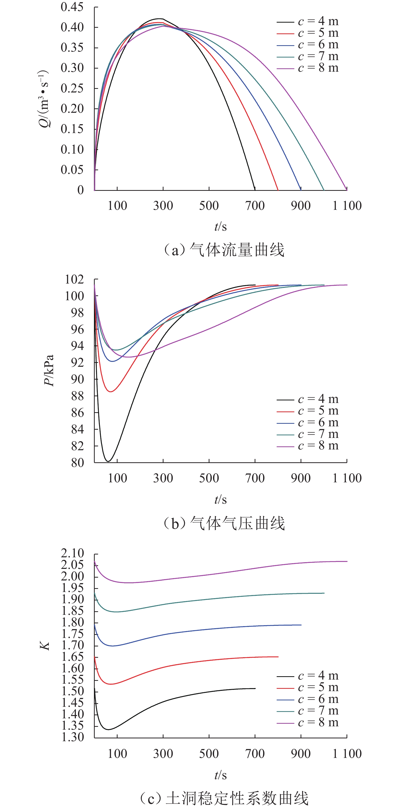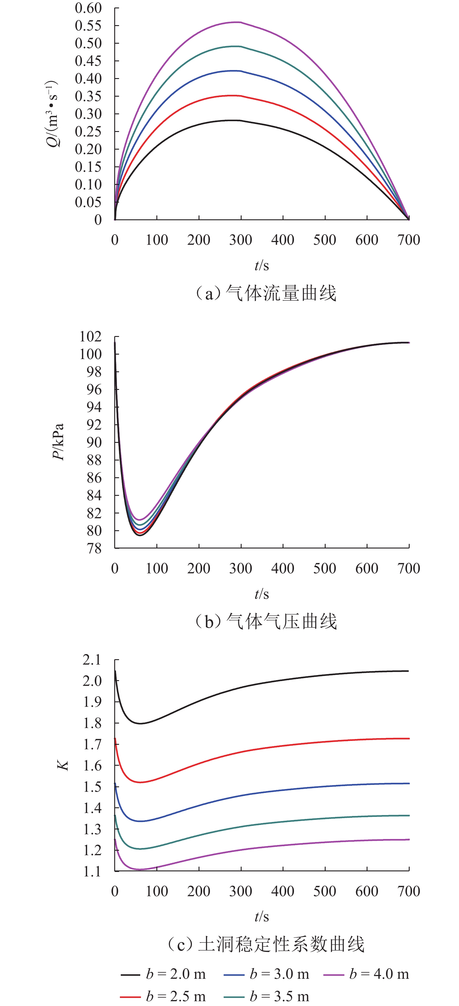 为揭示覆盖型岩溶降水引发的土洞洞内气压变化规律及其致陷机理,基于气体短管淹没出流理论,提出椭球形土洞内气体渗流流量、气压及稳定性系数的计算方法,并基于有限差分数值解编制相应的MATLAB程序;通过岩溶土洞降水致陷的室内模型试验验证计算方法的可行性. 算例分析结果表明:土洞气体状态参量(流量与气压)及其稳定性系数在降水过程中经历了从初始状态到降水前期剧变、过降水后期缓变的过程,最终逐渐恢复至起初状态;降水土洞的最大峰值流量与椭球土洞短半轴长$ b $正相关,与长、短半轴长之比($ a / b $)及拱高负相关;最小峰值气压均与$ a / b $、$ b $及拱高正相关;最小峰值气压抵达时间与拱高正相关,与$ a / b $负相关,$ b $影响甚小;降水土洞最小峰值稳定性系数与$ a / b $及拱高正相关,与$ b $负相关;最小峰值稳定性系数抵达时间与拱高正相关,与$ a / b $则负相关,$ b $影响甚微.