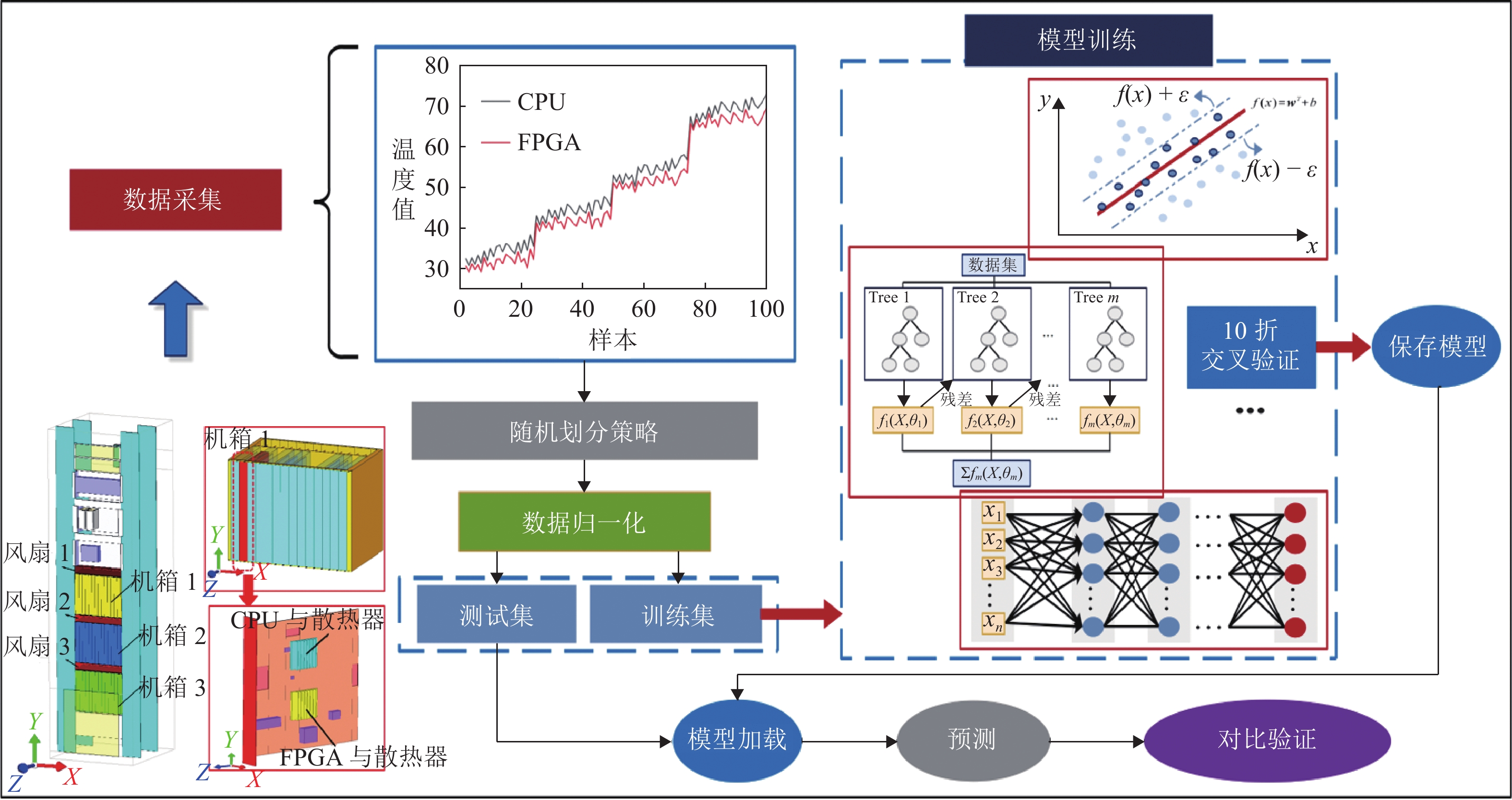为研究核安全级仪控系统中控制保护柜的内部热学特性及其关键芯片(CPU与FPGA)的稳态温度(SST)变化规律,在不同环境温度下对该控制保护柜开展了试验研究,并采用有限元方法模拟试验过程,通过对比试验结果验证了数值模型的准确性;在此基础上,利用有限元模型计算得到100组随机工况下CPU和FPGA的SST值,并采用M-SVR、XGBoost、ANN及BRR 4种算法对不同工况下CPU和FPGA的SST进行学习预测. 研究结果表明:1) 在环境温度为20 ℃时,CPU和FPGA的SST分别为37.5 ℃和33.5 ℃;当环境温度为55 ℃时,相应的SST上升至为72 ℃和68 ℃;有限元分析结果能够很好地模拟试验现象,计算所得芯片的SST同试验结果吻合较好. 2) 4种算法模型均能够对芯片SST进行预测,其中ANN算法在测试集上的预测性能最佳,其MSE值小于0.15%,