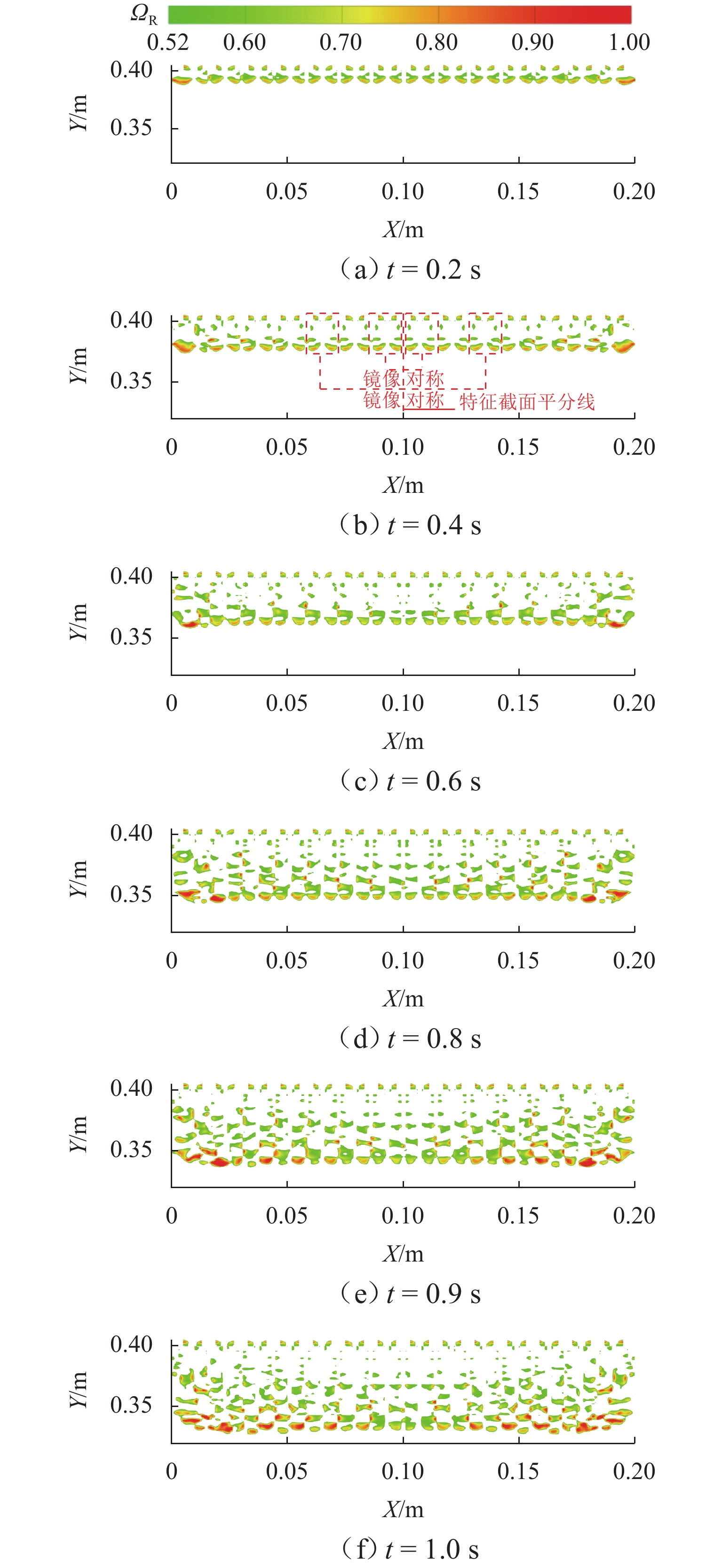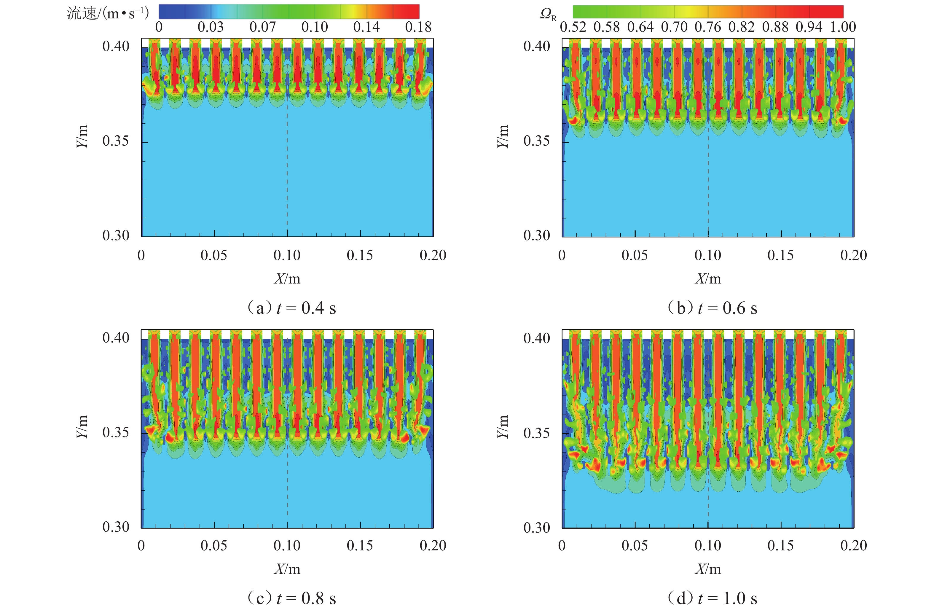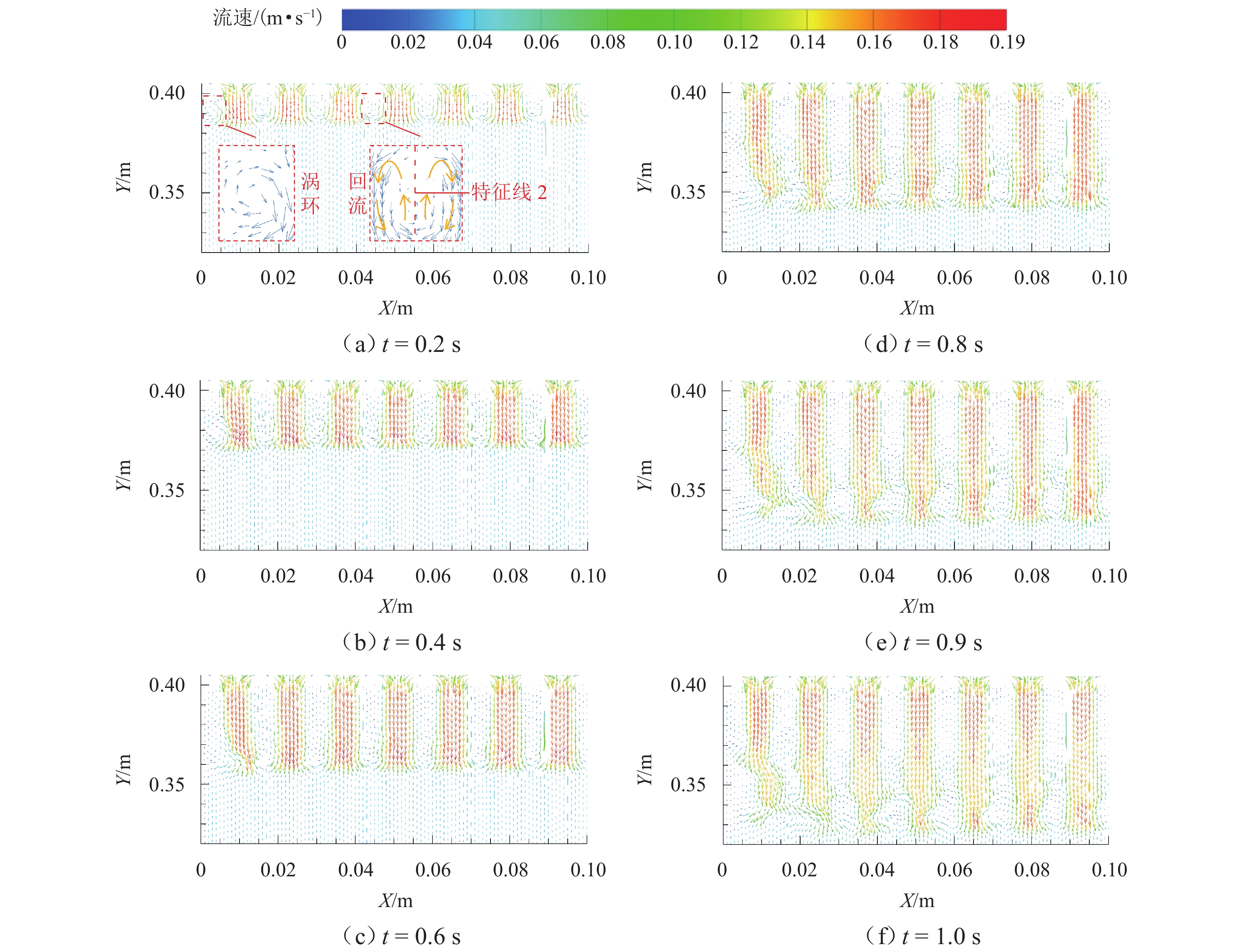 为探究网格絮凝池涡流中场射流涡结构的演化特征,采用大涡模拟(LES)对网格絮凝池涡流场进行瞬态模拟,从二维和三维的角度对网格涡流场进行研究. 结果表明:水流经过网格板后,立即在网孔后形成射流涡流场;在射流与背景流体间的剪切、卷吸和掺混作用下,格挡后方区域形成回流涡旋区,边壁处生成不断发展的涡环结构;这些涡环结构导致射流前端发生不同程度的变形与偏移,并抑其向前推进;涡旋主要分布在射流的边界层,其中射流前沿的涡结构聚集变化最快,其面积和强度最大,而靠近边壁处的涡结构强度变化最为显著,每一股射流的涡结构均关于射流轴心线呈镜像对称;此外,三维涡结构的前端形似一冠状结构,随射流向前发展,冠状结构会不断延伸、膨胀、变大,并最终离散和脱落;各时刻的涡结构分布与变化均表现出关于流场平分线的镜像对称性,且流场形态变化过程呈现出从边壁向流场中心发展的趋势.