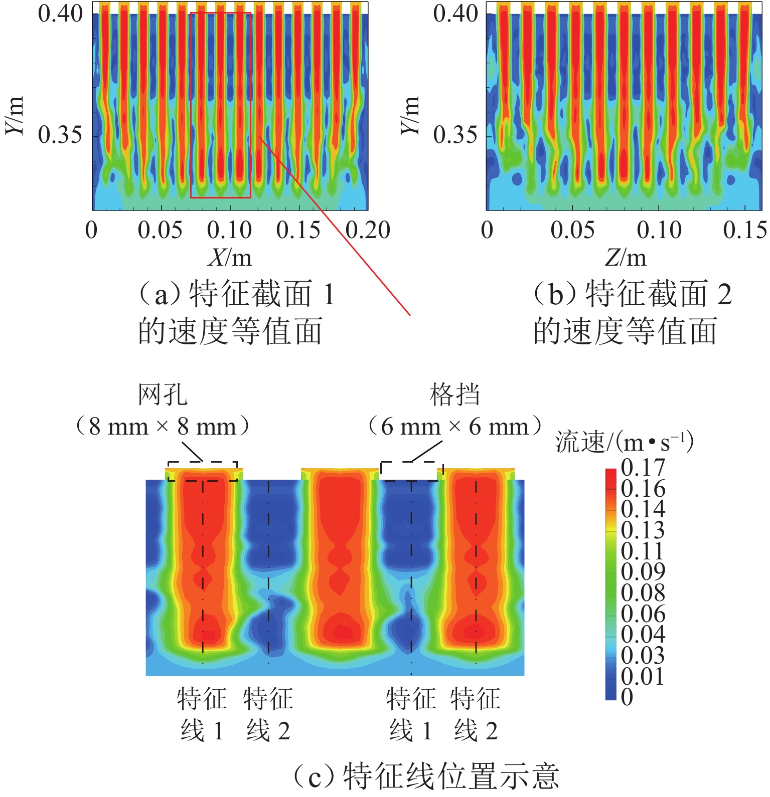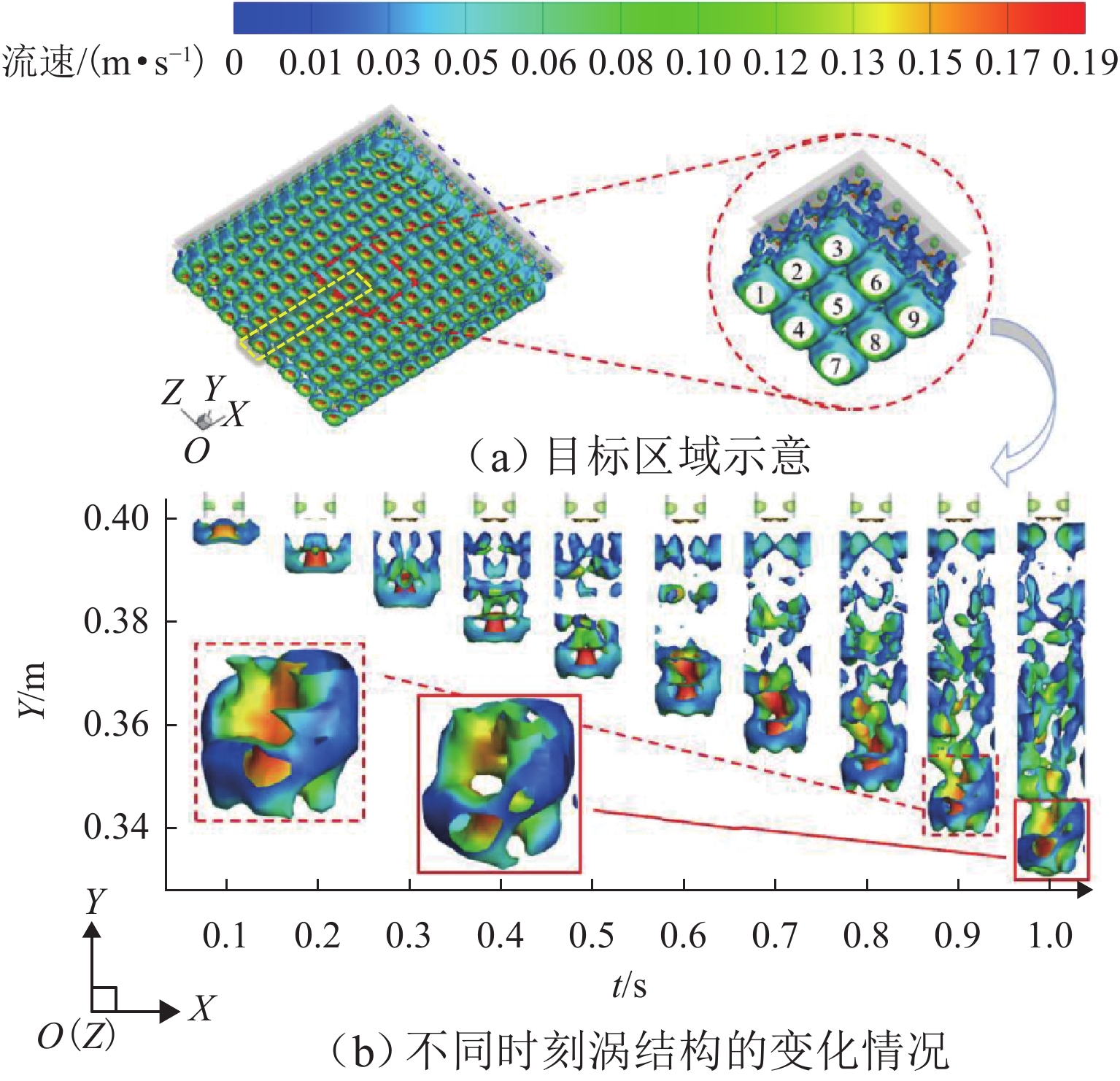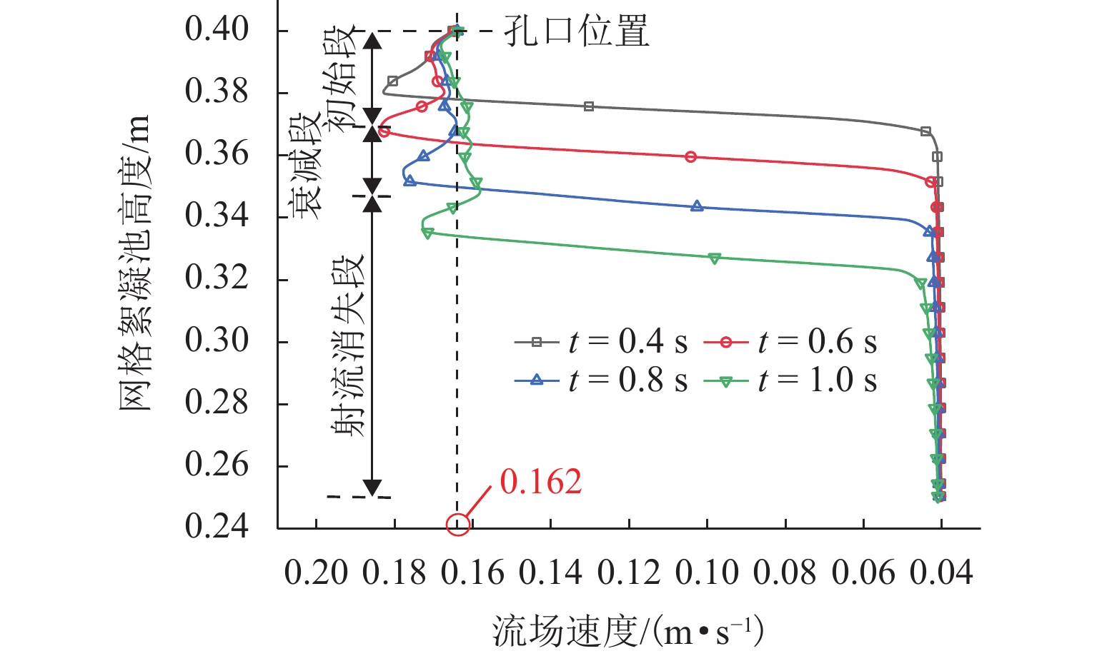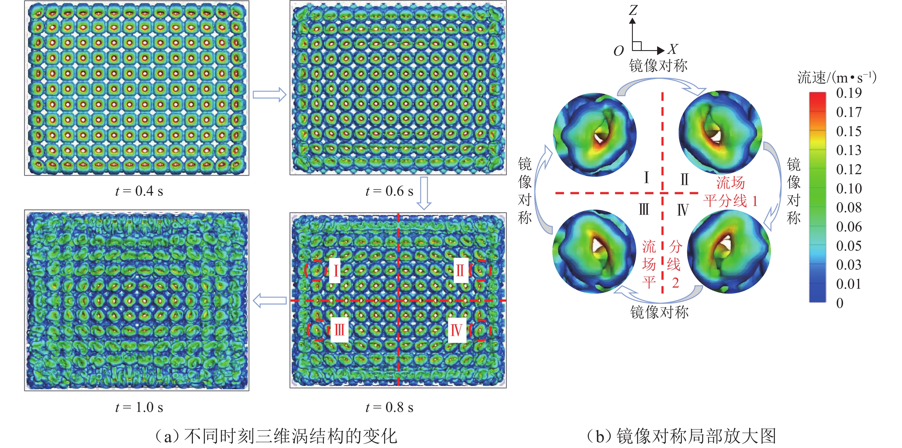 为探究网格絮凝池涡流中场射流涡结构的演化特征,采用大涡模拟(LES)对网格絮凝池涡流场进行瞬态模拟,从二维和三维的角度对网格涡流场进行研究. 结果表明:水流经过网格板后,立即在网孔后形成射流涡流场;在射流与背景流体间的剪切、卷吸和掺混作用下,格挡后方区域形成回流涡旋区,边壁处生成不断发展的涡环结构;这些涡环结构导致射流前端发生不同程度的变形与偏移,并抑其向前推进;涡旋主要分布在射流的边界层,其中射流前沿的涡结构聚集变化最快,其面积和强度最大,而靠近边壁处的涡结构强度变化最为显著,每一股射流的涡结构均关于射流轴心线呈镜像对称;此外,三维涡结构的前端形似一冠状结构,随射流向前发展,冠状结构会不断延伸、膨胀、变大,并最终离散和脱落;各时刻的涡结构分布与变化均表现出关于流场平分线的镜像对称性,且流场形态变化过程呈现出从边壁向流场中心发展的趋势.