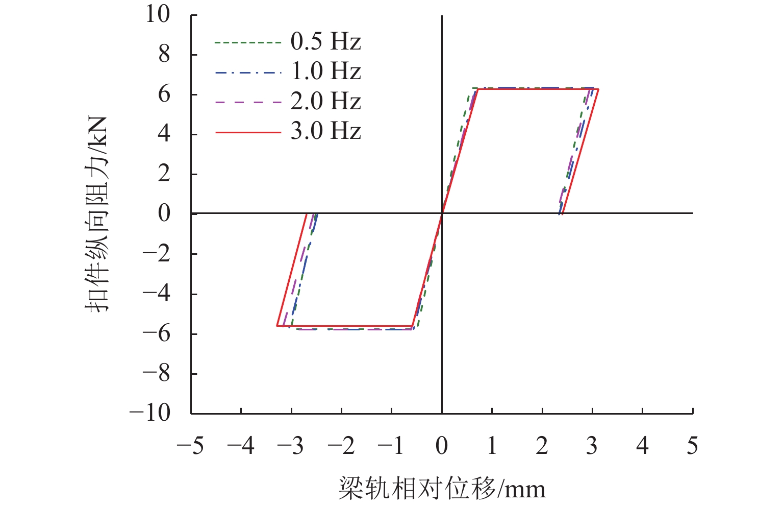 为研究地铁双层非线性减振扣件区段由钢轨波磨诱导的弹条断裂问题,以典型的GJ-Ⅲ型双层非线性减振扣件为研究对象,结合现场调研和数值仿真对该区段扣件弹条的断裂诱因及其影响因素进行分析. 首先,构建了含有钢轨波磨的轮对-钢轨-扣件系统有限元模型;然后,采用瞬时动态分析方法从共振响应角度探究了钢轨波磨区段扣件弹条的断裂诱因;接着,通过疲劳累计损伤理论从疲劳特性角度对比研究了低轨两侧弹条在有无波磨情况下的疲劳寿命;最后,进行参数化分析,探究了钢轨波磨外在激励和扣件部件内在特性对弹条疲劳寿命的影响规律. 结果表明:钢轨波磨诱导的高频激励导致了GJ-Ⅲ型扣件弹条共振,是弹条断裂的主要诱因;钢轨波磨加剧了轮轨系统的振动响应,降低了弹条的使用寿命且对低轨外侧弹条影响更为严重,使其疲劳寿命降低至2.18 × 105次,仅为弹条设计寿命的4.36%;钢轨波磨外在激励方面,波磨波深减小和波磨波长增大会使弹条疲劳寿命有所增加,且当波磨波长在40 mm以上时,其疲劳寿命提升较大;扣件部件内在特性方面,减小弹条弹性模量,增加弹条泊松比、橡胶垫板泊松比及其弹性模量,能一定程度上减少弹条的疲劳损伤,进而缓解钢轨波磨区段扣件弹条的断裂.