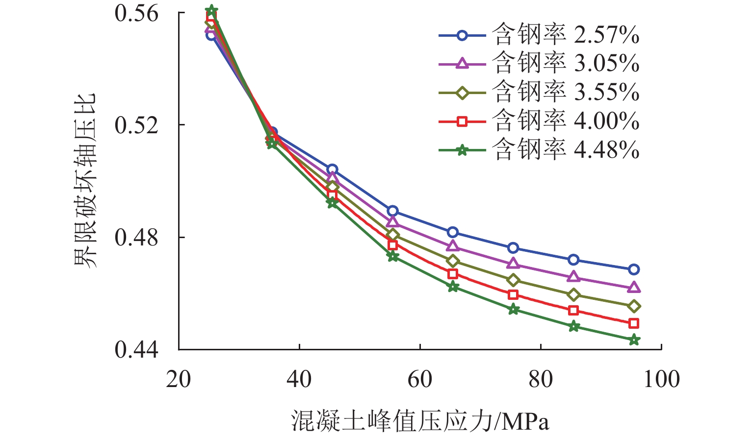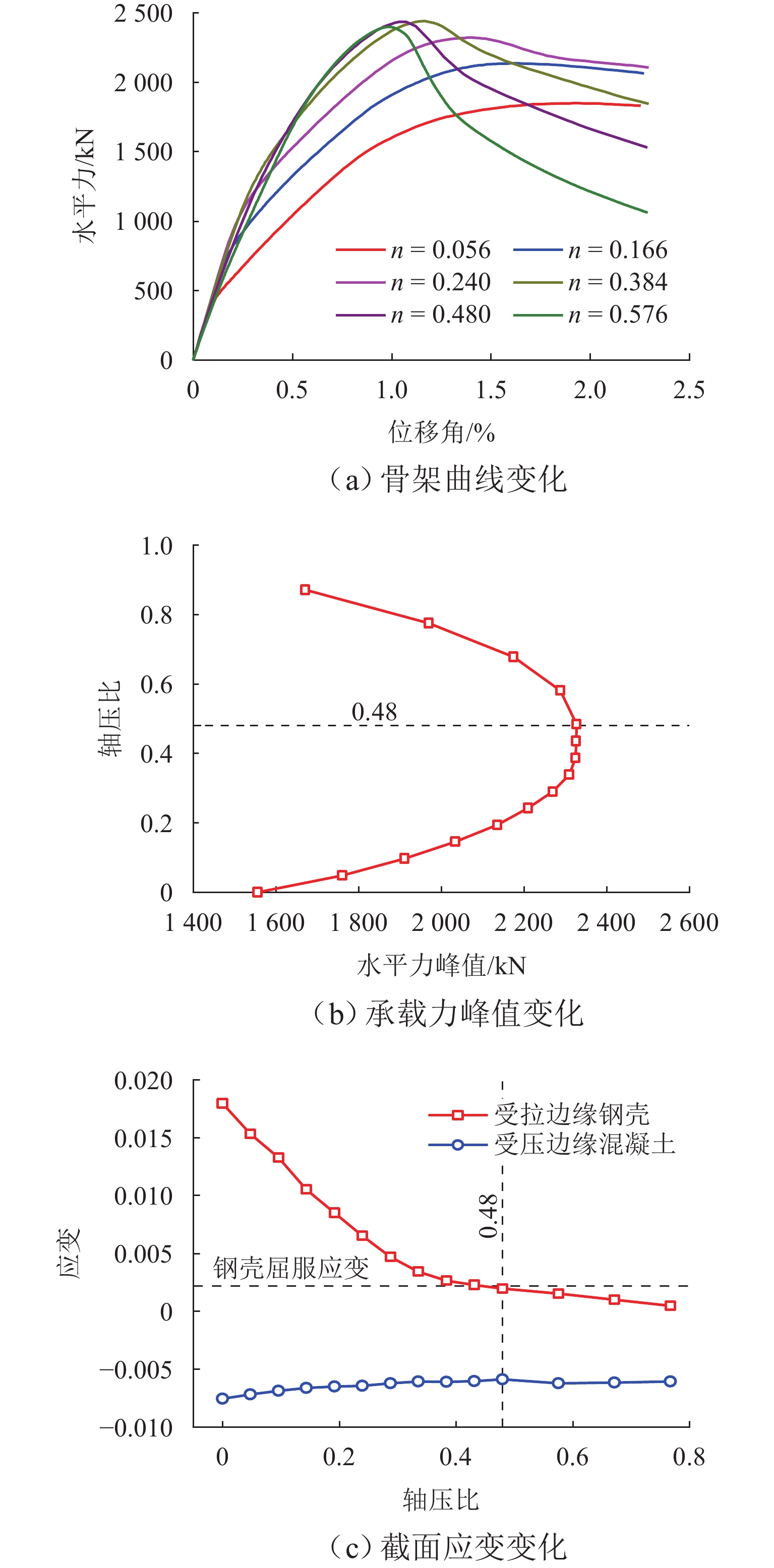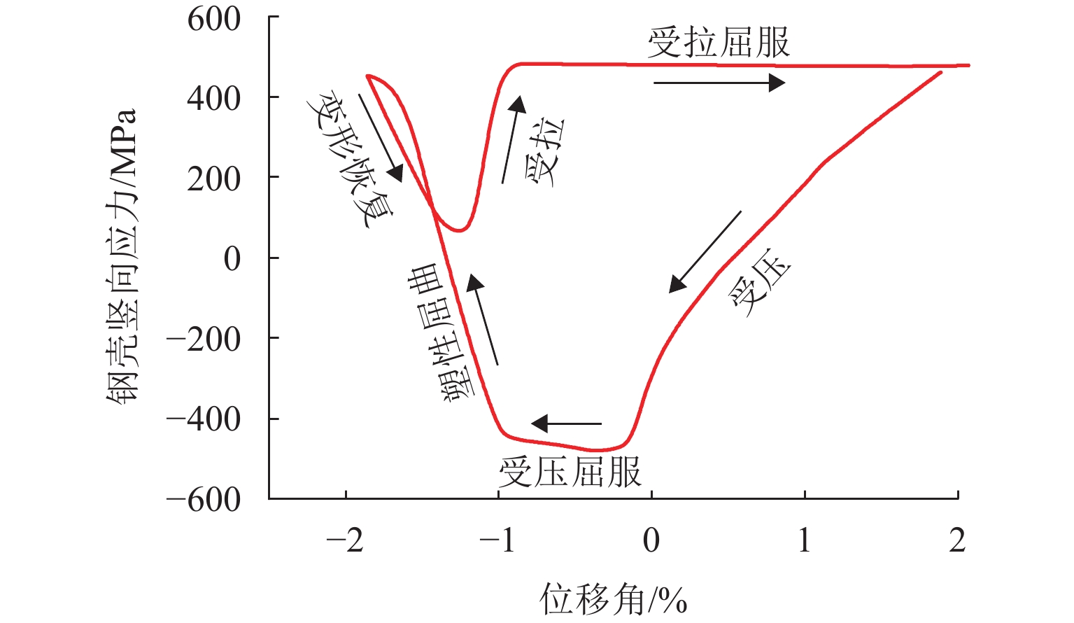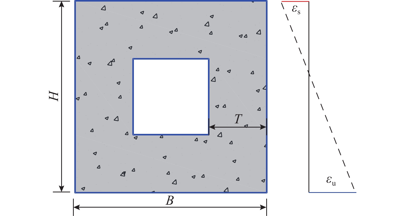 为研究轴压比对钢壳−组合索塔滞回性能的影响,基于无纵筋的组合索塔构造,以轴压比为研究参数设计3个滞回试件,测试得到各试件的滞回曲线、破坏特征以及应变发展,总结试件在大偏心破坏下的力学行为;采用ABAQUS软件建立有限元模型作进一步分析,探明索塔截面发生界限破坏的条件;提出界限破坏下截面的轴压与弯矩计算公式,并探讨截面中含钢率与混凝土强度对界限破坏轴压比的影响规律. 研究结果表明:大偏心破坏下,截面的刚度、峰值承载力和耗能性能随轴压比的增大而提升,当轴压比由0.056增大至0.166时,试件的刚度与抗弯承载力提升了20%;组合索塔截面的界限破坏条件为受拉侧边缘钢壳屈服的同时受压侧边缘混凝土压溃,界限破坏下截面具有最高的抗弯承载力与刚度;提出的计算公式能较为准确地评估界限破坏下截面的轴压比与抗弯承载力,含钢率和混凝土强度的提升均将使截面界限破坏轴压比下降;组合索塔截面界限破坏轴压比位于0.44~0.56,更适用于轴压比较大的大跨度悬索桥桥塔.