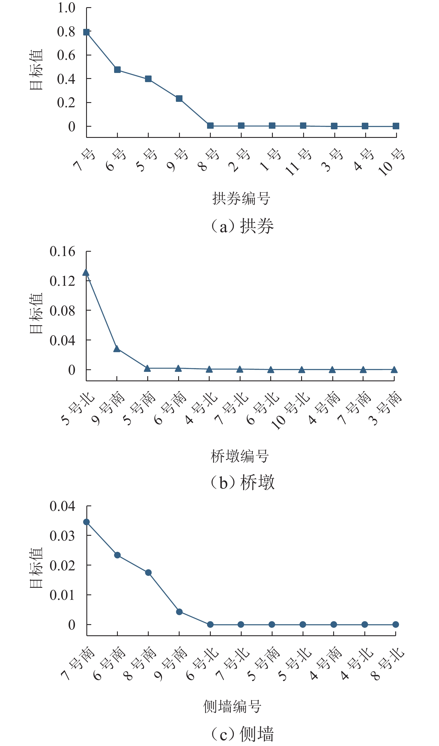 为构建古代砖石拱桥的预防性保护监测系统,开展面向风险识别的监测方法研究. 首先,采用残损评定等级、Von Mises应力和构件重要性分别作为残损最严重、受力最不利、构件最重要3项原则的量化表示;其次,基于残损矩阵、受力矩阵和重要性矩阵求解了卢沟桥64个构件的监测目标值;最后,制定卢沟桥基于三原则的传感器优化布置方案. 研究结果表明:该方法能够定位待监测的高目标值构件,并且监测信息可提取卢沟桥的结构季节性波动规律和累积损伤风险;除沉降项目基本不受季节变化影响,其余监测项目存在明显的季节性波动规律,波动波峰位于每年6月—7月,波谷位于每年1月;应变传感器的冬季与夏季峰值之比为1.577,东起第7孔位移传感器的冬季与夏季峰值之比为0.849,东起第9孔位移传感器的冬季与夏季峰值之比为1.206,横桥向倾斜传感器的冬季与夏季峰值之比为1.549,季节性波动比率平均介于20%~60%. 沉降传感器监测到东起第5桥墩沉降量为第9桥墩的1.156倍;靠近拱桥中部或位于损伤严重构件的传感器在同类型传感器中具有更大的峰值. 研究结果可为古代砖石拱桥的预防性保护监测提供科学基础.