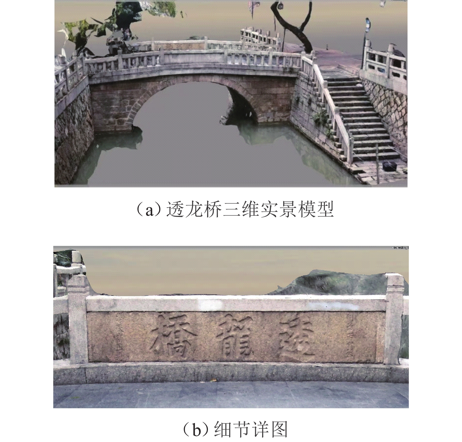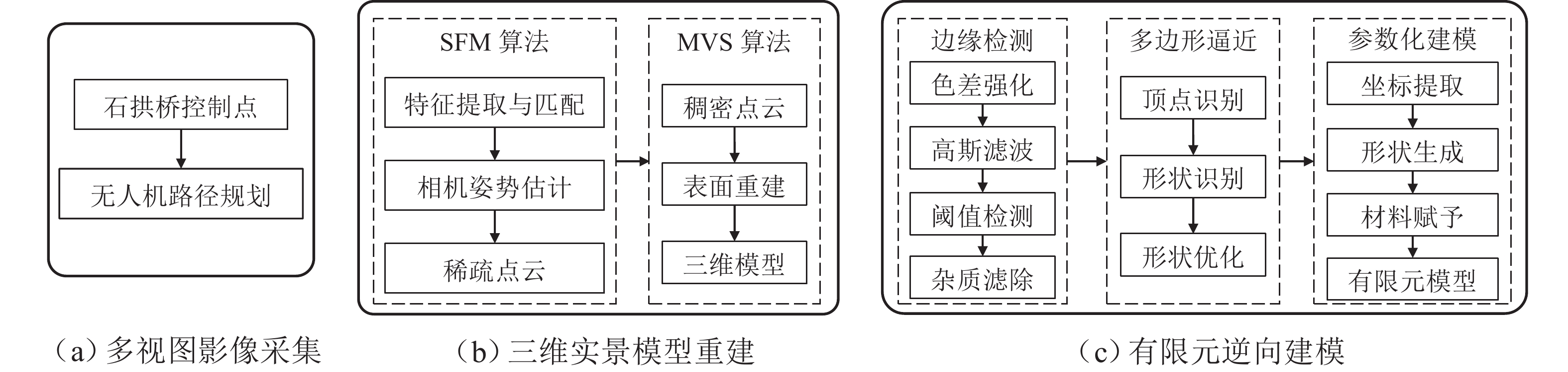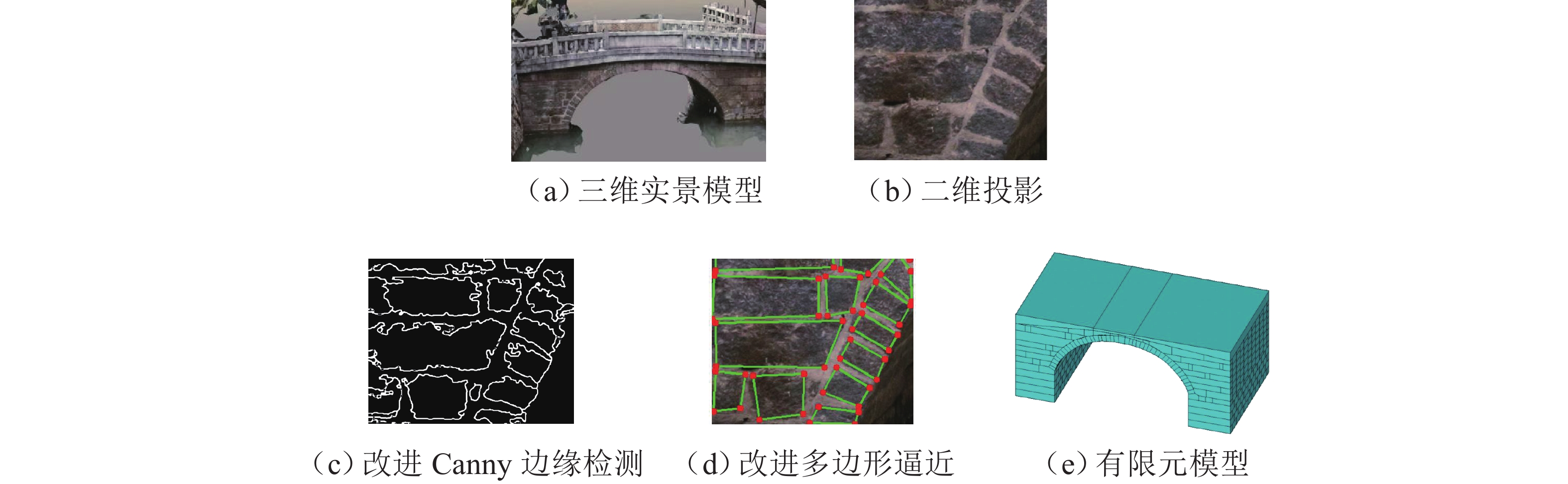 为实现古石拱桥数字化建模与性能评估,基于无人机倾斜摄影和图像轮廓提取技术开展古石拱桥逆向建模方法研究. 首先,使用无人机采集石拱桥的多视角序列图像;其次,基于运动恢复结构(SfM)和多视图立体匹配(MVS)算法,构建石拱桥的三维(3D)实景模型;接着,基于石块与砂浆存在色差和石块几何规则性的特点,提出色差强化与小面积杂质滤除策略,改进Canny边缘检测,引入循环识别四边形与形状优化改进多边形逼近算法,实现表面轮廓的自动化识别;然后,基于地面控制点标定真实尺度,利用提取的轮廓坐标参数化建模,生成有限元模型;最后,使用提出方法对透龙桥进行建模和性能分析,并与试验结果进行对比. 研究结果表明:透龙桥3D实景模型表面未检出明显病害,最大尺寸误差为0.8%;有限元模型的挠度最大计算误差为2.1%. 该方法能够准确反映古石拱桥的几何形态和力学性能,为其数字化保护与性能评估提供技术支持.