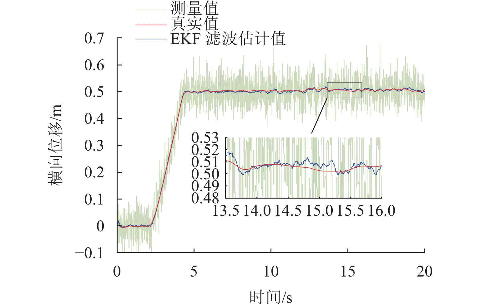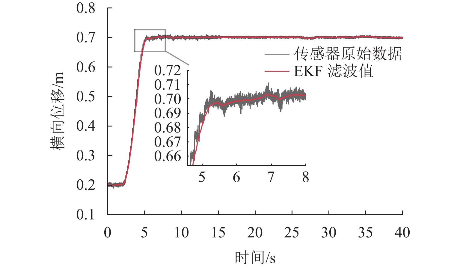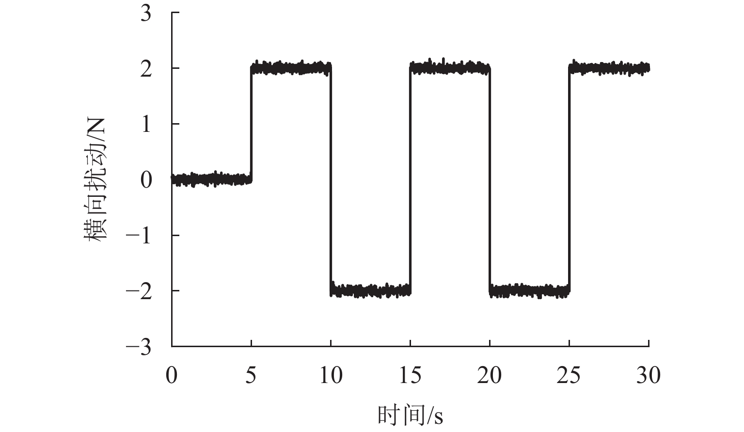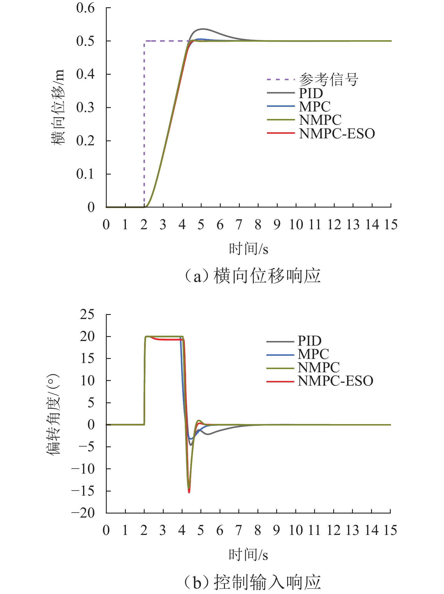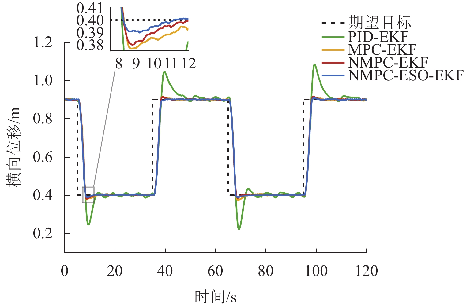 ResultsThe simulation results show that under the disturbance-free condition, the system can effectively realize the lateral trajectory tracking control function under PID, MPC, NMPC, and NMPC-ESO control strategies. The response speeds of the various controllers are relatively similar. The PID controller exhibits the largest overshoot, while MPC experiences some overshoot, though significantly smaller than that of PID. Both NMPC and NMPC-ESO have minimal overshoot, with their response curves closely resembling each other, indicating that ESO has no noticeable effect. Under external disturbance conditions, the addition of ESO significantly improves the anti-disturbance ability of NMPC. The lateral displacement fluctuations are minimal for NMPC-ESO, and the system recovery time is the shortest. When sensor measurement noise is introduced, the system can stably control within a range close to the target position under NMPC control, but there is still an error compared to the target position. Due to the excessive sensitivity of ESO to the noise, it overcompensates the deflection angle, leading to instability in the NMPC-ESO control after ESO’s application. To address this issue, an EKF is introduced to suppress the impact of internal noise on ESO’s disturbance estimation. Under both internal and external disturbance conditions, NMPC-ESO-EKF significantly improves the lateral trajectory tracking accuracy by 89.77% and greatly enhances the anti-disturbance ability, demonstrating the necessity of incorporating EKF. The experimental results indicate that the error between the values filtered by EKF and the true values is very small. PID-EKF exhibits significant overshoot and oscillation under various operating conditions, which poses safety concerns in practical engineering applications. Under short-distance constant reference signals, compared to PID-EKF control, NMPC-ESO-EKF reduces the overshoot by 98.90% to 2.12 mm, with the shortest system settling time of 4.7 s, which is reduced by 47.78%. Under square wave reference signals, the trajectory tracking curves of MPC-EKF, NMPC-EKF, and NMPC-ESO-EKF are all relatively stable, with NMPC-ESO-EKF showing the smallest average overshoot and tracking error, improving performance by 93.77% and 36.13%, respectively, compared to PID-EKF. Under long-distance constant reference signals, larger overshoots are observed across all controllers. After applying continuous disturbances, each controller can make the system return to the stable target value. After stabilization, the input deflection angle fluctuates around −10° to continuously resist external disturbance; the displacement fluctuation amplitude of MPC-EKF is the largest, with the longest recovery time; the anti-disturbance ability of NMPC-ESO-EKF is optimal, with the fluctuation amplitude reduced by 34.51% and the recovery time shortened by 42.08% compared to PID-EKF.