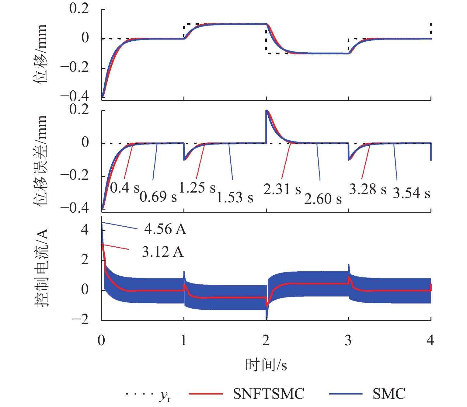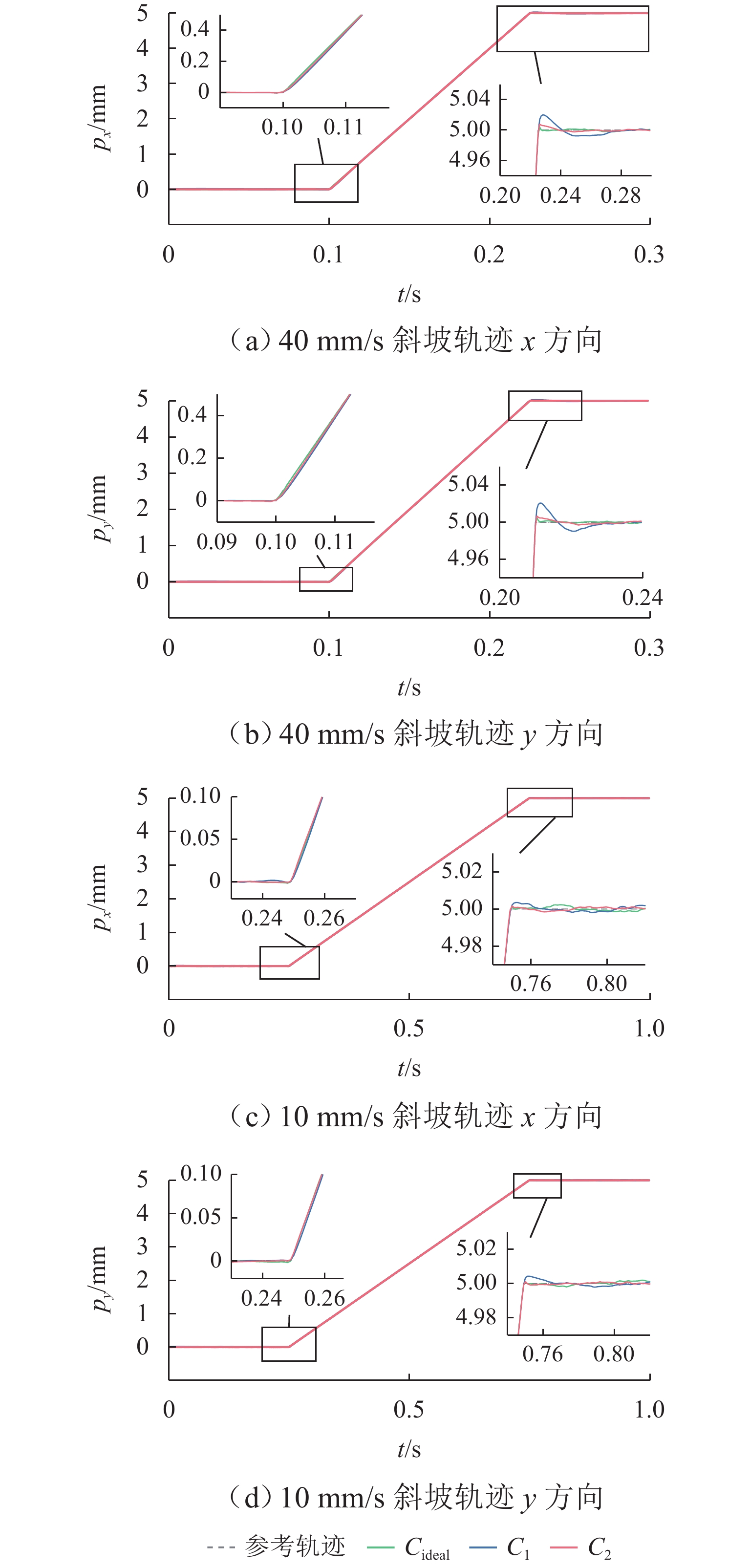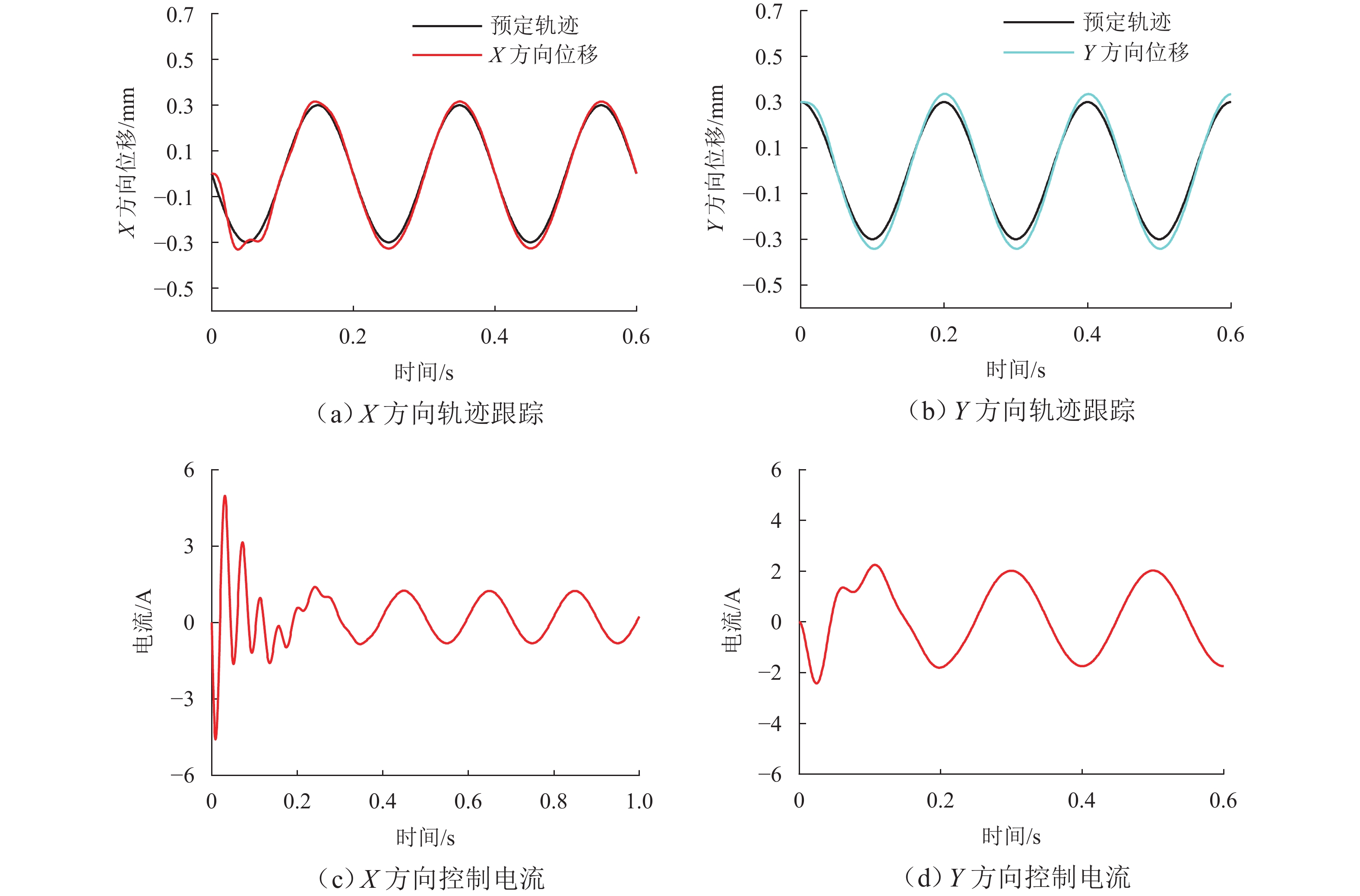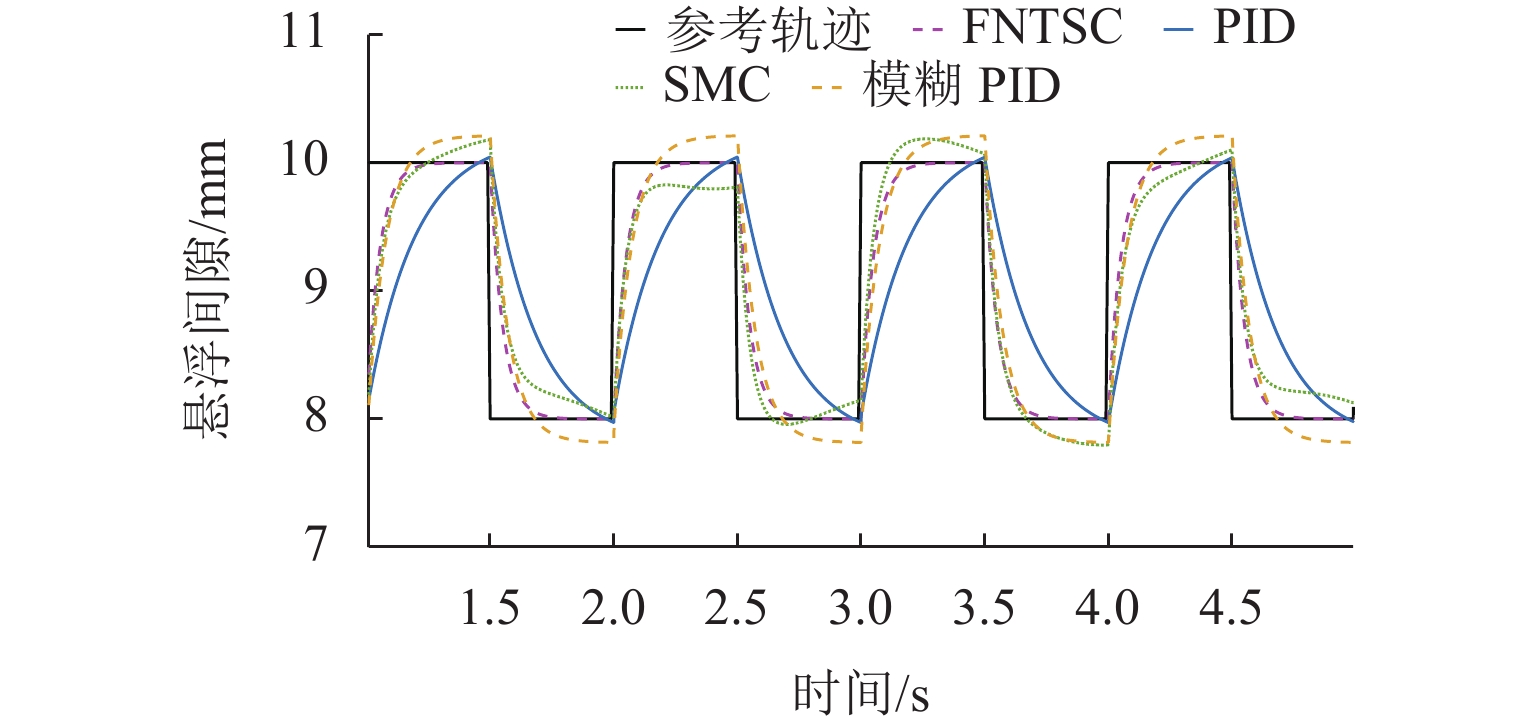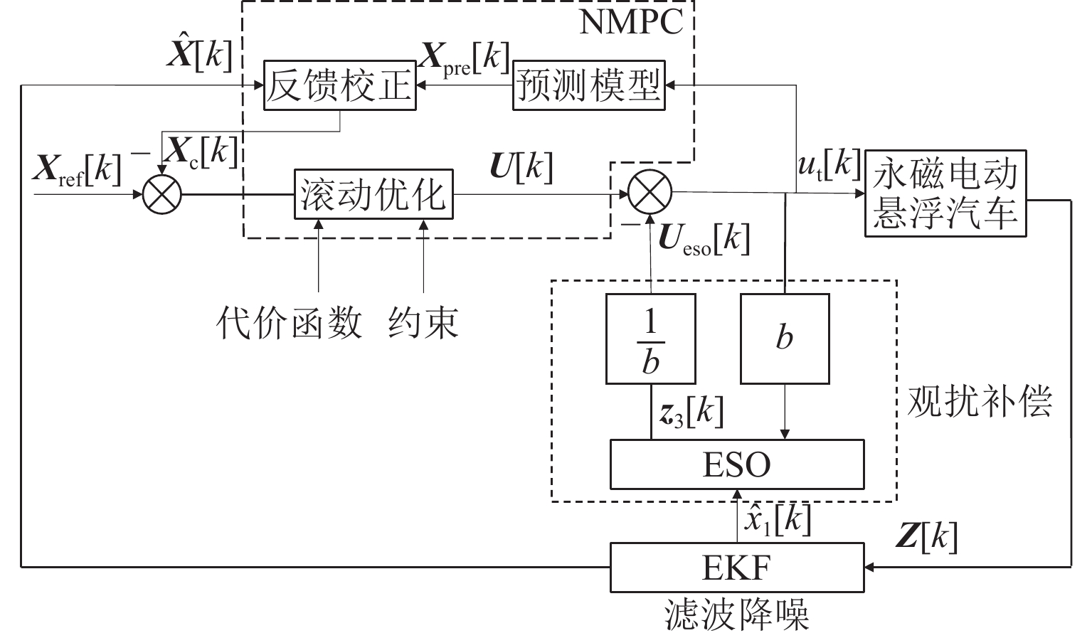 ResultsThe simulation results show that under the disturbance-free condition, the system can effectively realize the lateral trajectory tracking control function under PID, MPC, NMPC, and NMPC-ESO control strategies. The response speeds of the various controllers are relatively similar. The PID controller exhibits the largest overshoot, while MPC experiences some overshoot, though significantly smaller than that of PID. Both NMPC and NMPC-ESO have minimal overshoot, with their response curves closely resembling each other, indicating that ESO has no noticeable effect. Under external disturbance conditions, the addition of ESO significantly improves the anti-disturbance ability of NMPC. The lateral displacement fluctuations are minimal for NMPC-ESO, and the system recovery time is the shortest. When sensor measurement noise is introduced, the system can stably control within a range close to the target position under NMPC control, but there is still an error compared to the target position. Due to the excessive sensitivity of ESO to the noise, it overcompensates the deflection angle, leading to instability in the NMPC-ESO control after ESO’s application. To address this issue, an EKF is introduced to suppress the impact of internal noise on ESO’s disturbance estimation. Under both internal and external disturbance conditions, NMPC-ESO-EKF significantly improves the lateral trajectory tracking accuracy by 89.77% and greatly enhances the anti-disturbance ability, demonstrating the necessity of incorporating EKF. The experimental results indicate that the error between the values filtered by EKF and the true values is very small. PID-EKF exhibits significant overshoot and oscillation under various operating conditions, which poses safety concerns in practical engineering applications. Under short-distance constant reference signals, compared to PID-EKF control, NMPC-ESO-EKF reduces the overshoot by 98.90% to 2.12 mm, with the shortest system settling time of 4.7 s, which is reduced by 47.78%. Under square wave reference signals, the trajectory tracking curves of MPC-EKF, NMPC-EKF, and NMPC-ESO-EKF are all relatively stable, with NMPC-ESO-EKF showing the smallest average overshoot and tracking error, improving performance by 93.77% and 36.13%, respectively, compared to PID-EKF. Under long-distance constant reference signals, larger overshoots are observed across all controllers. After applying continuous disturbances, each controller can make the system return to the stable target value. After stabilization, the input deflection angle fluctuates around −10° to continuously resist external disturbance; the displacement fluctuation amplitude of MPC-EKF is the largest, with the longest recovery time; the anti-disturbance ability of NMPC-ESO-EKF is optimal, with the fluctuation amplitude reduced by 34.51% and the recovery time shortened by 42.08% compared to PID-EKF.