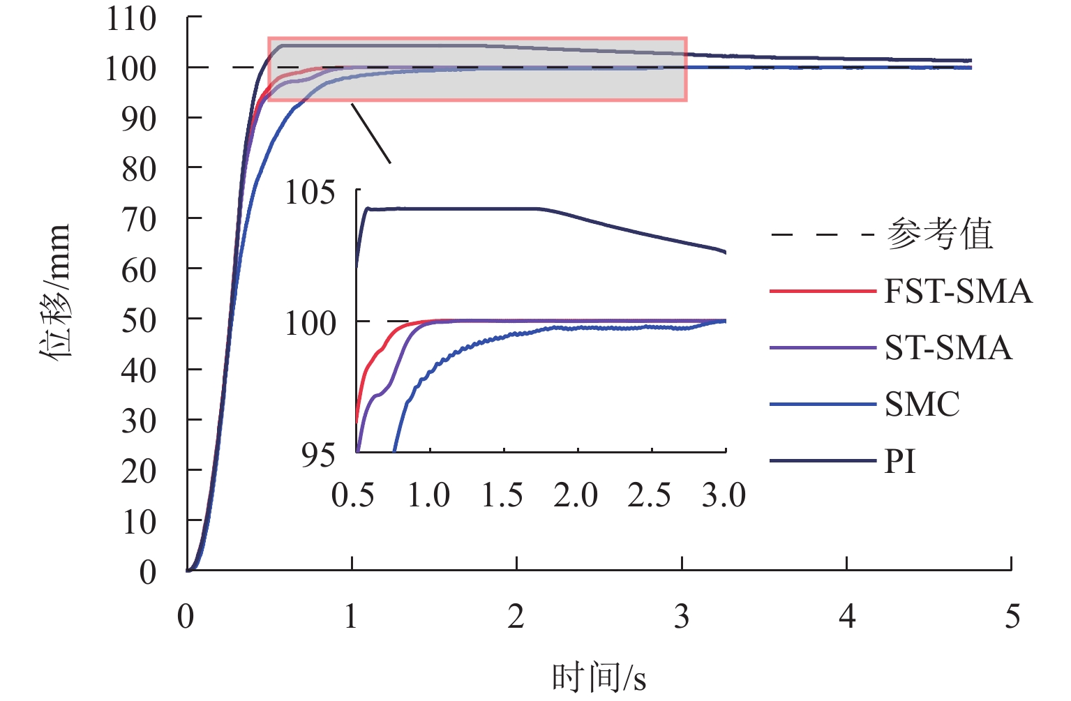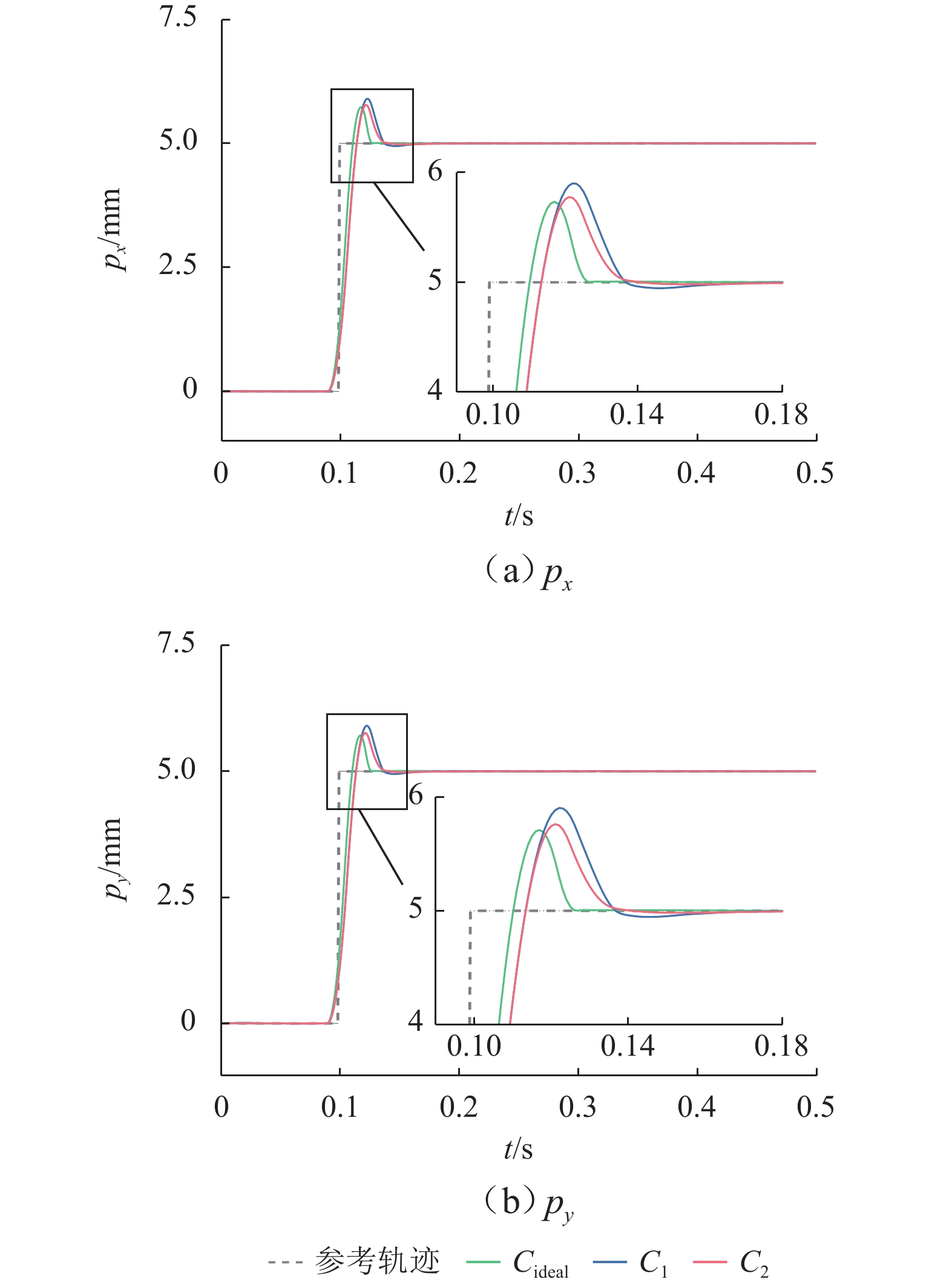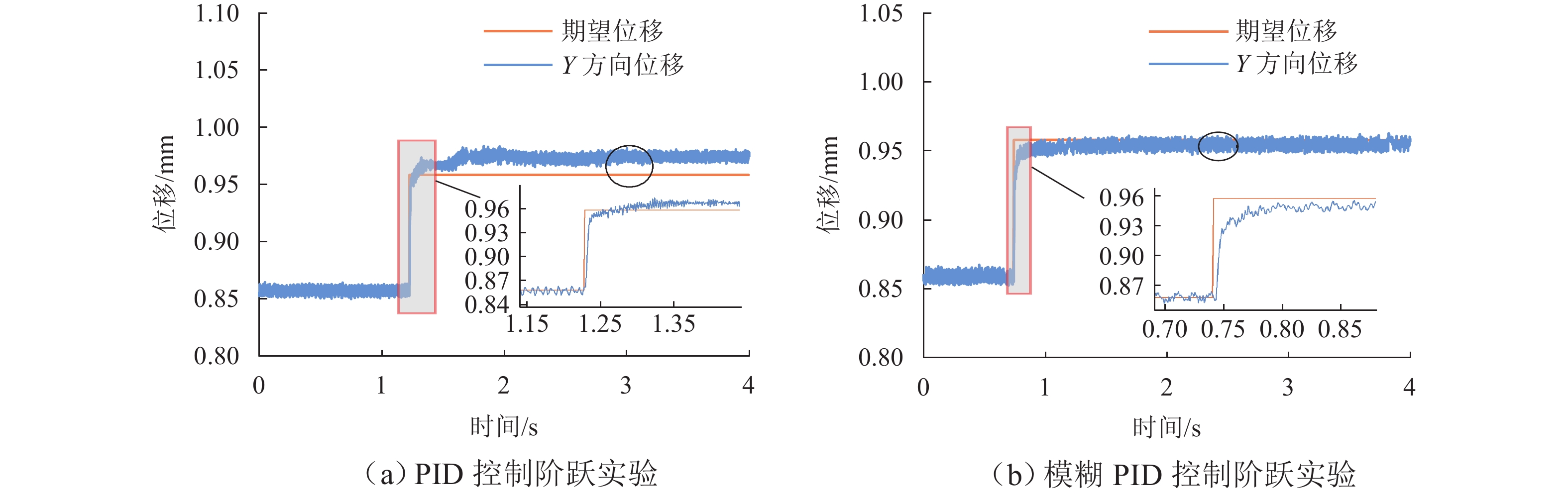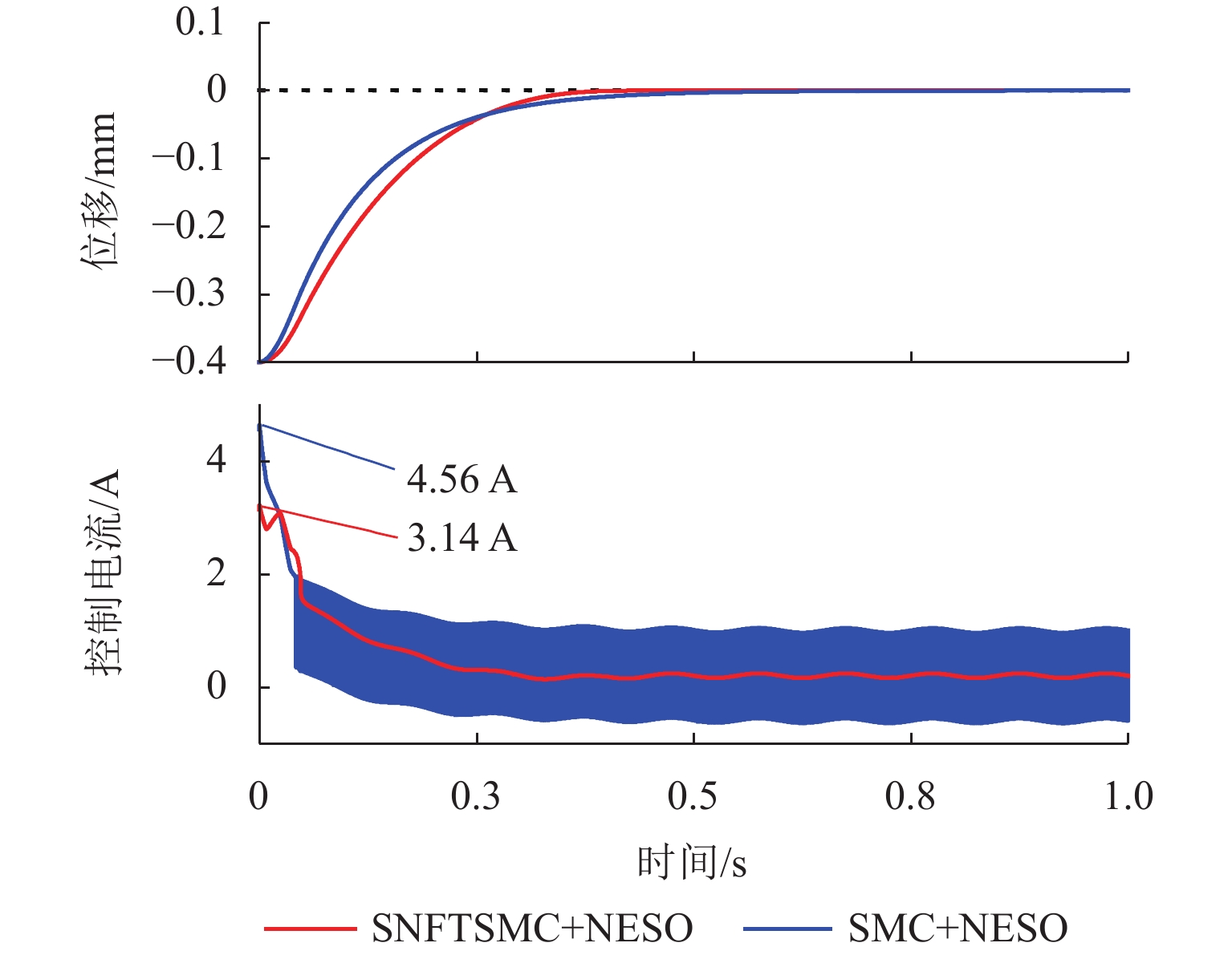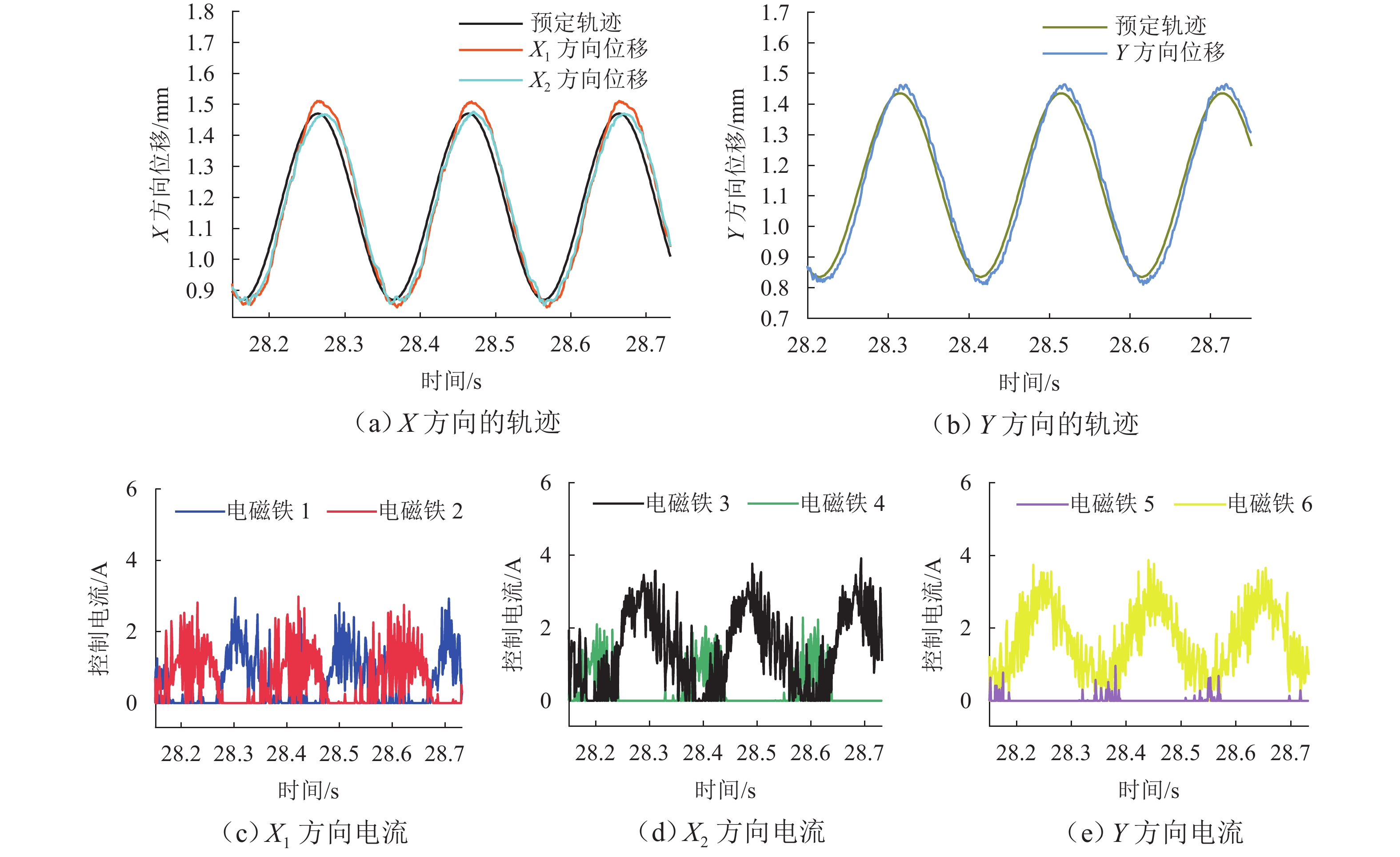 ResultsThe simulation results show that under the disturbance-free condition, the system can effectively realize the lateral trajectory tracking control function under PID, MPC, NMPC, and NMPC-ESO control strategies. The response speeds of the various controllers are relatively similar. The PID controller exhibits the largest overshoot, while MPC experiences some overshoot, though significantly smaller than that of PID. Both NMPC and NMPC-ESO have minimal overshoot, with their response curves closely resembling each other, indicating that ESO has no noticeable effect. Under external disturbance conditions, the addition of ESO significantly improves the anti-disturbance ability of NMPC. The lateral displacement fluctuations are minimal for NMPC-ESO, and the system recovery time is the shortest. When sensor measurement noise is introduced, the system can stably control within a range close to the target position under NMPC control, but there is still an error compared to the target position. Due to the excessive sensitivity of ESO to the noise, it overcompensates the deflection angle, leading to instability in the NMPC-ESO control after ESO’s application. To address this issue, an EKF is introduced to suppress the impact of internal noise on ESO’s disturbance estimation. Under both internal and external disturbance conditions, NMPC-ESO-EKF significantly improves the lateral trajectory tracking accuracy by 89.77% and greatly enhances the anti-disturbance ability, demonstrating the necessity of incorporating EKF. The experimental results indicate that the error between the values filtered by EKF and the true values is very small. PID-EKF exhibits significant overshoot and oscillation under various operating conditions, which poses safety concerns in practical engineering applications. Under short-distance constant reference signals, compared to PID-EKF control, NMPC-ESO-EKF reduces the overshoot by 98.90% to 2.12 mm, with the shortest system settling time of 4.7 s, which is reduced by 47.78%. Under square wave reference signals, the trajectory tracking curves of MPC-EKF, NMPC-EKF, and NMPC-ESO-EKF are all relatively stable, with NMPC-ESO-EKF showing the smallest average overshoot and tracking error, improving performance by 93.77% and 36.13%, respectively, compared to PID-EKF. Under long-distance constant reference signals, larger overshoots are observed across all controllers. After applying continuous disturbances, each controller can make the system return to the stable target value. After stabilization, the input deflection angle fluctuates around −10° to continuously resist external disturbance; the displacement fluctuation amplitude of MPC-EKF is the largest, with the longest recovery time; the anti-disturbance ability of NMPC-ESO-EKF is optimal, with the fluctuation amplitude reduced by 34.51% and the recovery time shortened by 42.08% compared to PID-EKF.