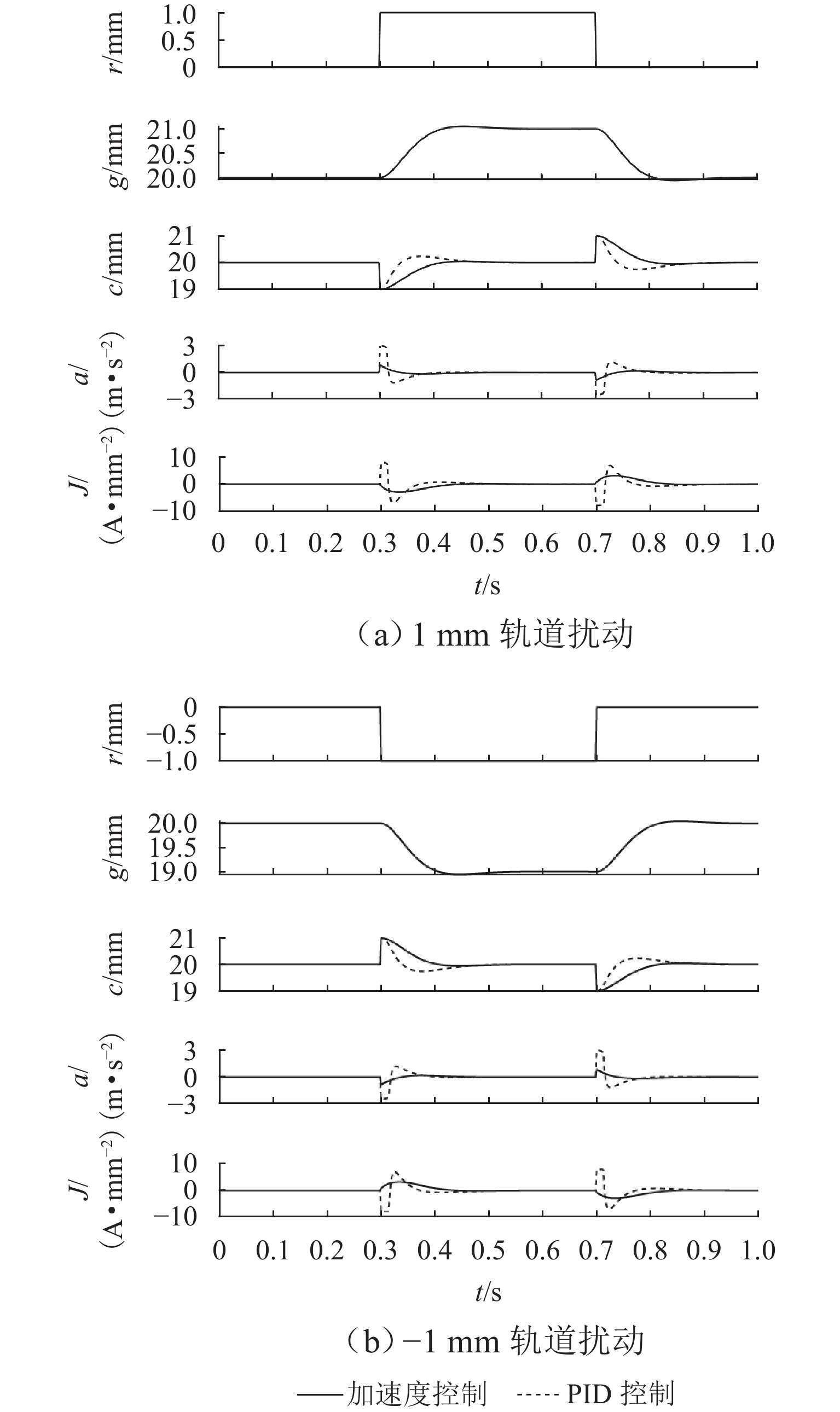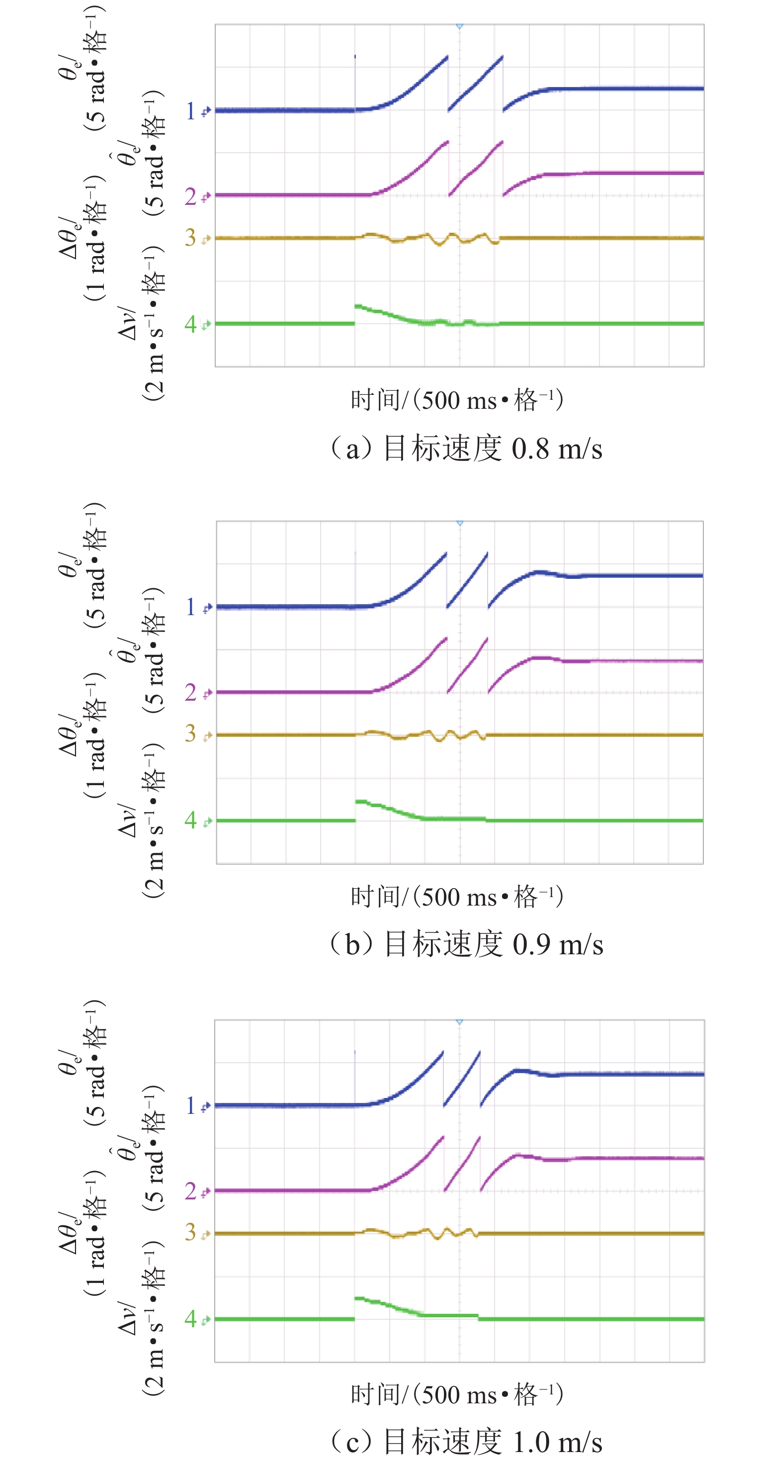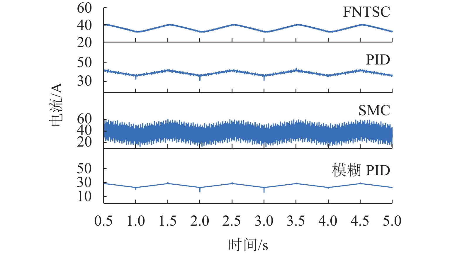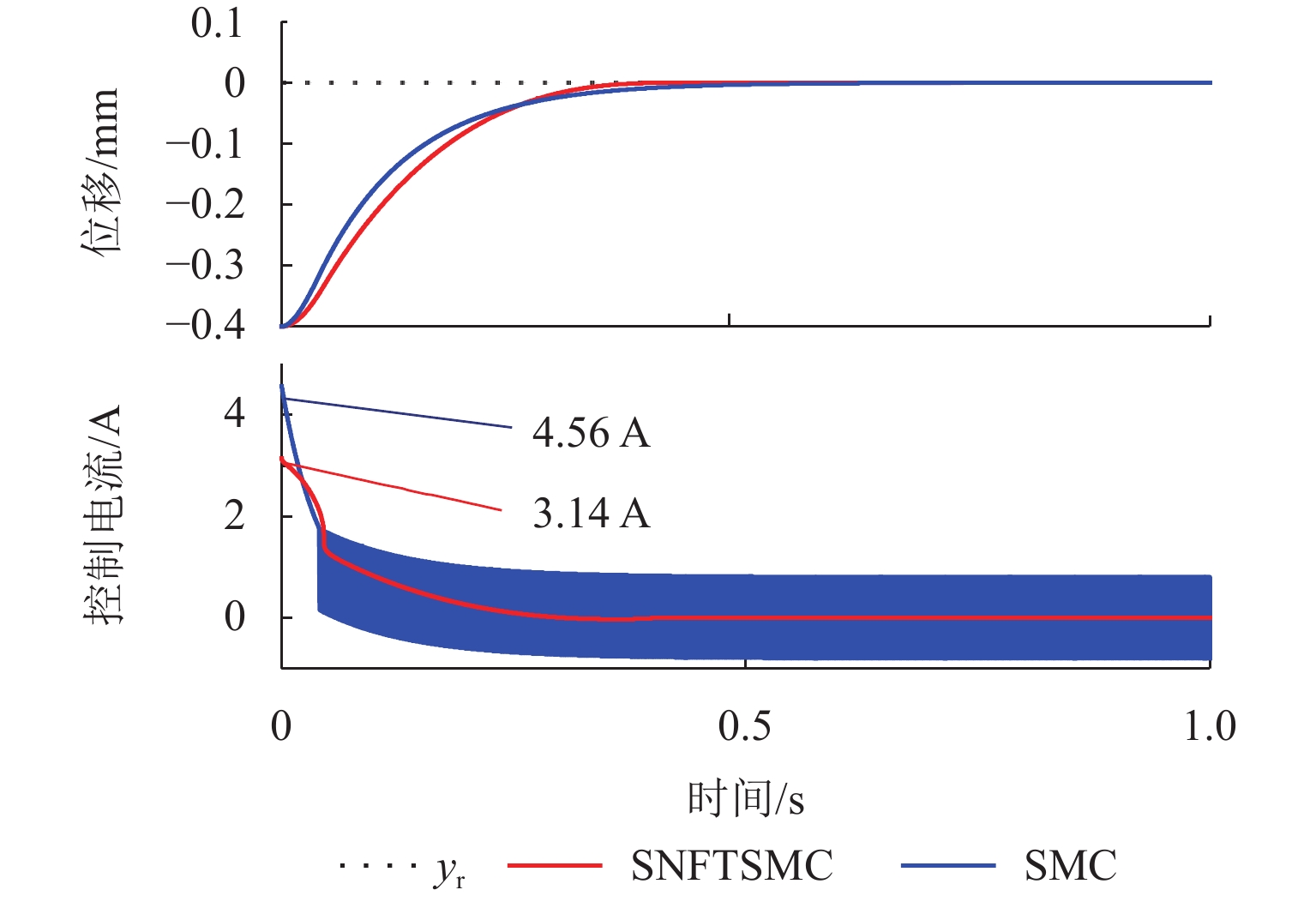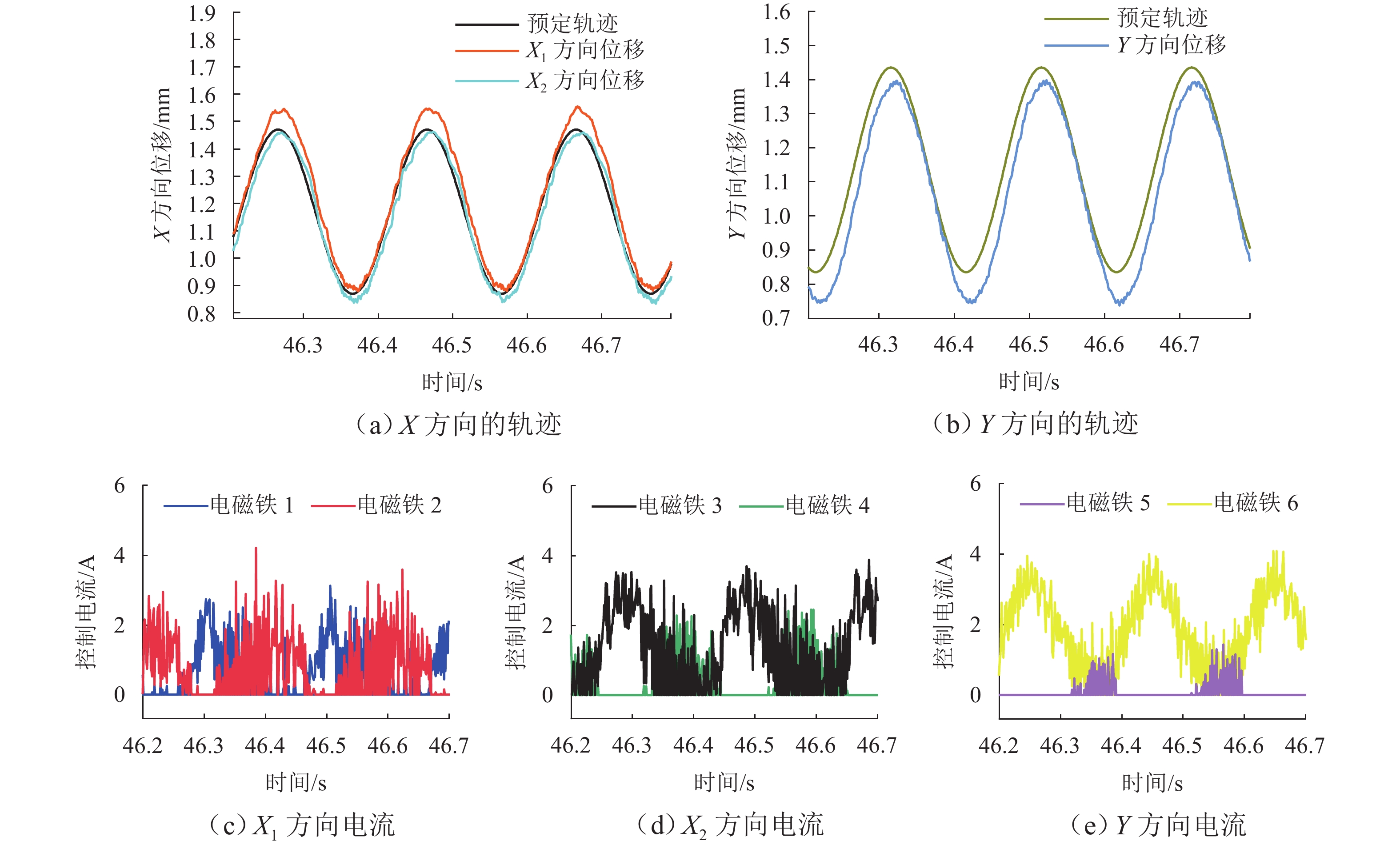 ResultsThe simulation results show that under the disturbance-free condition, the system can effectively realize the lateral trajectory tracking control function under PID, MPC, NMPC, and NMPC-ESO control strategies. The response speeds of the various controllers are relatively similar. The PID controller exhibits the largest overshoot, while MPC experiences some overshoot, though significantly smaller than that of PID. Both NMPC and NMPC-ESO have minimal overshoot, with their response curves closely resembling each other, indicating that ESO has no noticeable effect. Under external disturbance conditions, the addition of ESO significantly improves the anti-disturbance ability of NMPC. The lateral displacement fluctuations are minimal for NMPC-ESO, and the system recovery time is the shortest. When sensor measurement noise is introduced, the system can stably control within a range close to the target position under NMPC control, but there is still an error compared to the target position. Due to the excessive sensitivity of ESO to the noise, it overcompensates the deflection angle, leading to instability in the NMPC-ESO control after ESO’s application. To address this issue, an EKF is introduced to suppress the impact of internal noise on ESO’s disturbance estimation. Under both internal and external disturbance conditions, NMPC-ESO-EKF significantly improves the lateral trajectory tracking accuracy by 89.77% and greatly enhances the anti-disturbance ability, demonstrating the necessity of incorporating EKF. The experimental results indicate that the error between the values filtered by EKF and the true values is very small. PID-EKF exhibits significant overshoot and oscillation under various operating conditions, which poses safety concerns in practical engineering applications. Under short-distance constant reference signals, compared to PID-EKF control, NMPC-ESO-EKF reduces the overshoot by 98.90% to 2.12 mm, with the shortest system settling time of 4.7 s, which is reduced by 47.78%. Under square wave reference signals, the trajectory tracking curves of MPC-EKF, NMPC-EKF, and NMPC-ESO-EKF are all relatively stable, with NMPC-ESO-EKF showing the smallest average overshoot and tracking error, improving performance by 93.77% and 36.13%, respectively, compared to PID-EKF. Under long-distance constant reference signals, larger overshoots are observed across all controllers. After applying continuous disturbances, each controller can make the system return to the stable target value. After stabilization, the input deflection angle fluctuates around −10° to continuously resist external disturbance; the displacement fluctuation amplitude of MPC-EKF is the largest, with the longest recovery time; the anti-disturbance ability of NMPC-ESO-EKF is optimal, with the fluctuation amplitude reduced by 34.51% and the recovery time shortened by 42.08% compared to PID-EKF.