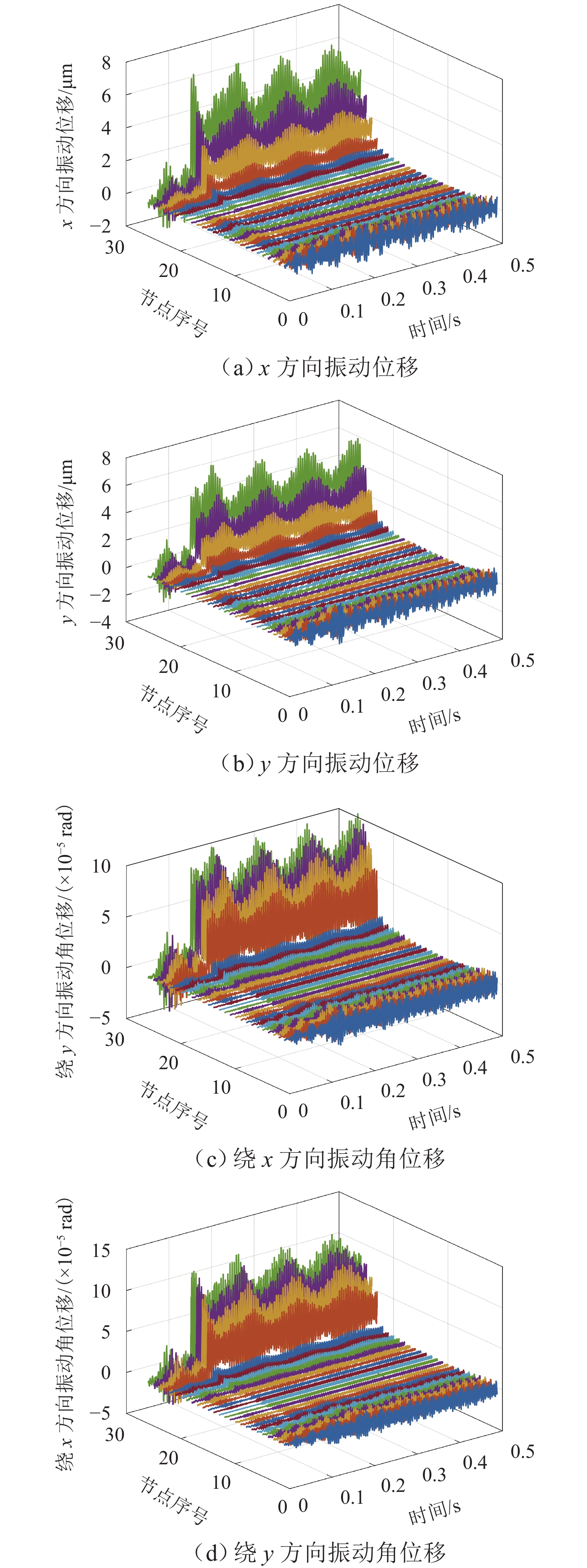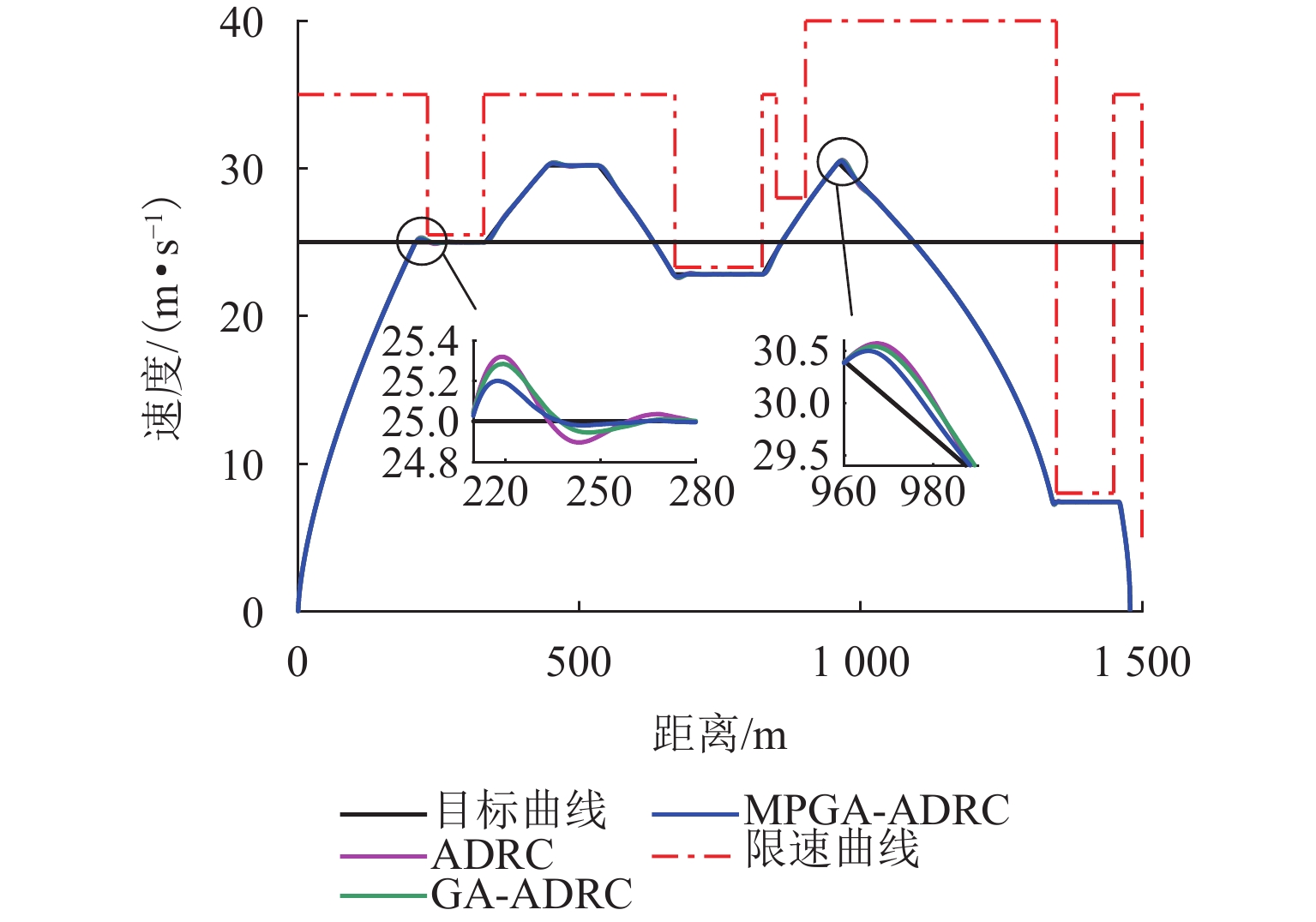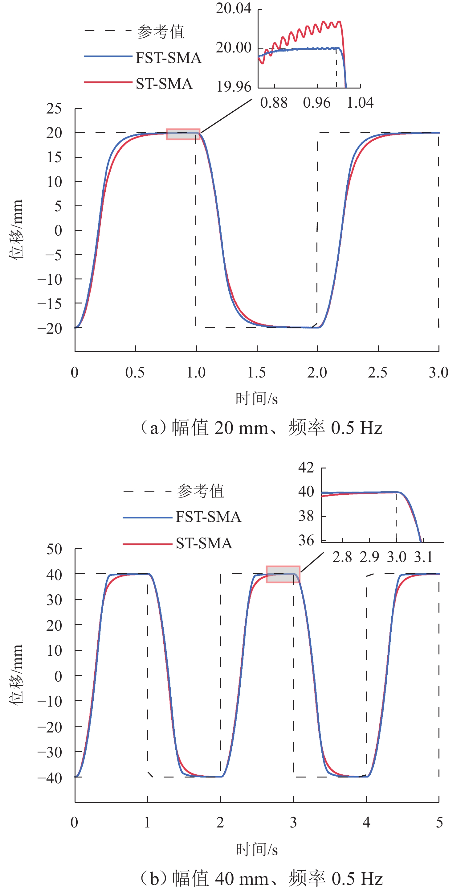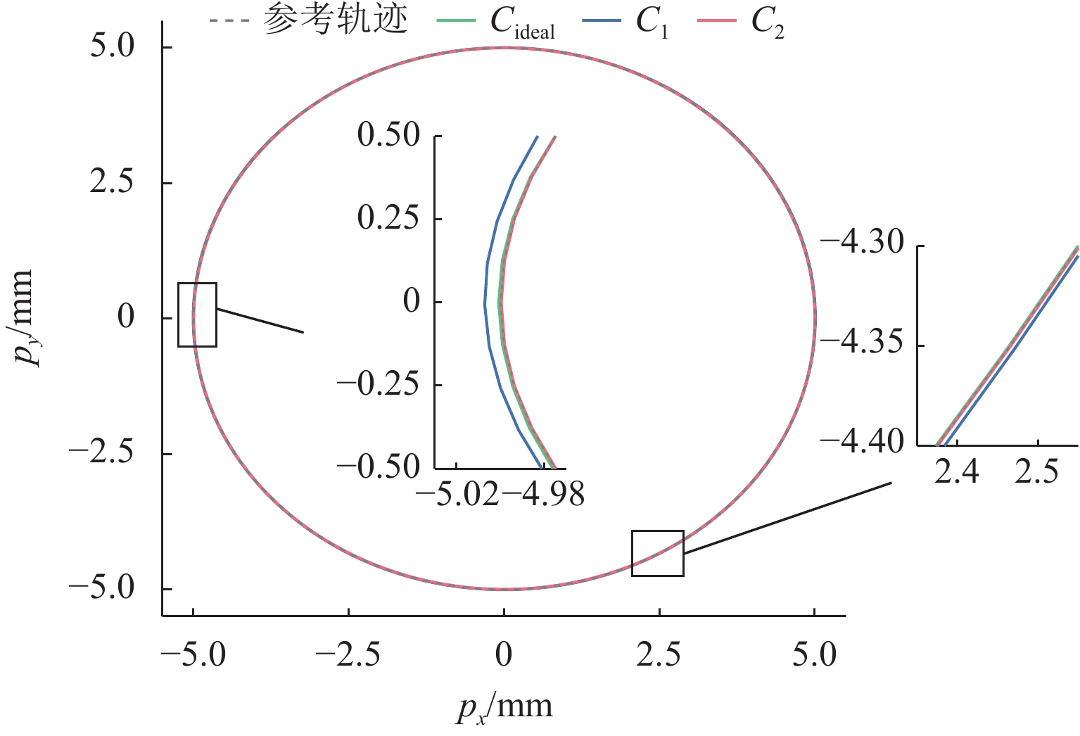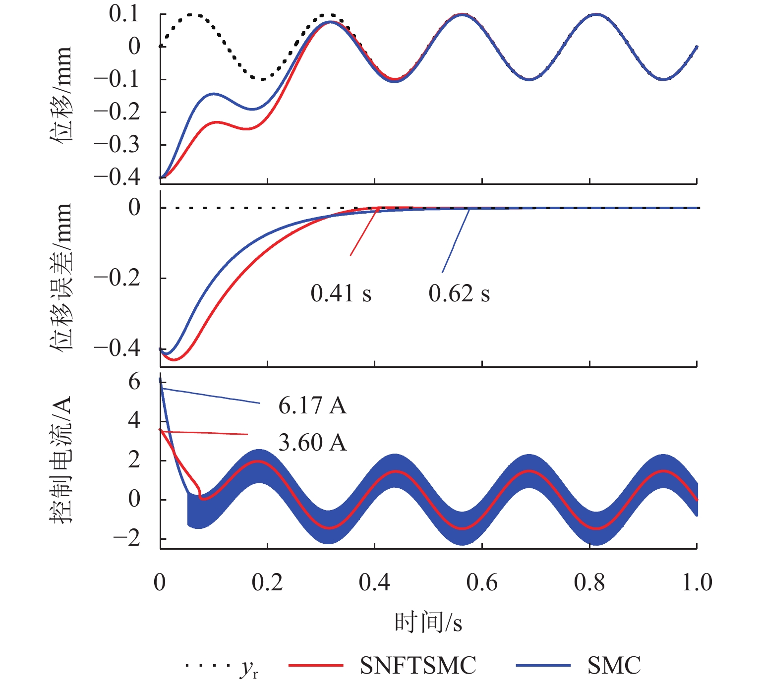 ResultsThe simulation results show that under the disturbance-free condition, the system can effectively realize the lateral trajectory tracking control function under PID, MPC, NMPC, and NMPC-ESO control strategies. The response speeds of the various controllers are relatively similar. The PID controller exhibits the largest overshoot, while MPC experiences some overshoot, though significantly smaller than that of PID. Both NMPC and NMPC-ESO have minimal overshoot, with their response curves closely resembling each other, indicating that ESO has no noticeable effect. Under external disturbance conditions, the addition of ESO significantly improves the anti-disturbance ability of NMPC. The lateral displacement fluctuations are minimal for NMPC-ESO, and the system recovery time is the shortest. When sensor measurement noise is introduced, the system can stably control within a range close to the target position under NMPC control, but there is still an error compared to the target position. Due to the excessive sensitivity of ESO to the noise, it overcompensates the deflection angle, leading to instability in the NMPC-ESO control after ESO’s application. To address this issue, an EKF is introduced to suppress the impact of internal noise on ESO’s disturbance estimation. Under both internal and external disturbance conditions, NMPC-ESO-EKF significantly improves the lateral trajectory tracking accuracy by 89.77% and greatly enhances the anti-disturbance ability, demonstrating the necessity of incorporating EKF. The experimental results indicate that the error between the values filtered by EKF and the true values is very small. PID-EKF exhibits significant overshoot and oscillation under various operating conditions, which poses safety concerns in practical engineering applications. Under short-distance constant reference signals, compared to PID-EKF control, NMPC-ESO-EKF reduces the overshoot by 98.90% to 2.12 mm, with the shortest system settling time of 4.7 s, which is reduced by 47.78%. Under square wave reference signals, the trajectory tracking curves of MPC-EKF, NMPC-EKF, and NMPC-ESO-EKF are all relatively stable, with NMPC-ESO-EKF showing the smallest average overshoot and tracking error, improving performance by 93.77% and 36.13%, respectively, compared to PID-EKF. Under long-distance constant reference signals, larger overshoots are observed across all controllers. After applying continuous disturbances, each controller can make the system return to the stable target value. After stabilization, the input deflection angle fluctuates around −10° to continuously resist external disturbance; the displacement fluctuation amplitude of MPC-EKF is the largest, with the longest recovery time; the anti-disturbance ability of NMPC-ESO-EKF is optimal, with the fluctuation amplitude reduced by 34.51% and the recovery time shortened by 42.08% compared to PID-EKF.