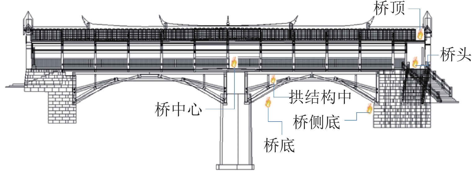Currently, most Min-Zhe timber arch lounge bridges suffer from the lack of detailed blueprint documentation, leading to unsatisfactory preservation effects and insufficient research on fire spread patterns and disaster prevention. To solve these problems, a digital reconstruction technology based on three-dimensional scanning and BIM parameterization was proposed to construct the digital twins of timber arch lounge bridges, and a BIM-fire dynamics simulator (FDS) was used to analyze the fire spread patterns and fire prevention strategies of such bridges. Firstly, the original point cloud model of Helong Bridge was obtained through on-site three-dimensional scanning, and after registration, denoising, and thinning processes, a BIM parametric digital twin was established to calculate its fire load density. Secondly, the IFC format was adopted to realize the interaction between BIM and FDS, and the fire digital twin of the timber arch lounge bridge was established. Simulation analysis was conducted through parameters such as heat release rate (HRR), fire spread phenomenon, visibility, temperature, and harmful gas concentration, and the fire spread patterns were derived by simulating and analyzing multiple typical fire source scenarios in FDS. Finally, fire prevention optimization strategies such as material flame-retardant treatment, bridge deck non-combustible transformation, and sprinkler system layout were discussed. The research results indicate that the fire load density of the timber arch lounge bridge is as high as 4 017.764 MJ/m2, far exceeding that of typical Chinese and foreign buildings, thus posing an extremely high fire risk. Among multiple typical fire source scenarios, excluding HRR mutation values, the HRR peaks of the arch structure and bridge bottom working conditions are stable at 100 MW and 95 MW, respectively. The HRR peaks of the bridge center and bridge head working conditions are stable at 88 MW and 70 MW, respectively. The HRR of the bridge side bottom and bridge top working conditions does not reach the peak within 1 000 seconds, with maximum values of 55 MW and 22 MW. Therefore, the fire risk of ignition under the bridge is the highest, followed by ignition on the bridge deck, while the fire risks of roof ignition and ignition at the bridge side bottom are relatively low. Through fire simulation and quantitative analysis of multiple fire parameters, it is confirmed that the three fire prevention measures can delay the fire spread of timber arch lounge bridges, and the upper and lower fire compartments, wood flame retardancy, and sprinkler systems reduce the HRR peak by 23 MW, 39 MW, and 63 MW, respectively. The research results can serve as the basis for information storage, quantitative analysis of fire spread, and preventive protection of timber arch lounge bridges and provide technical support for the long-term safe operation and maintenance of cultural heritage buildings.