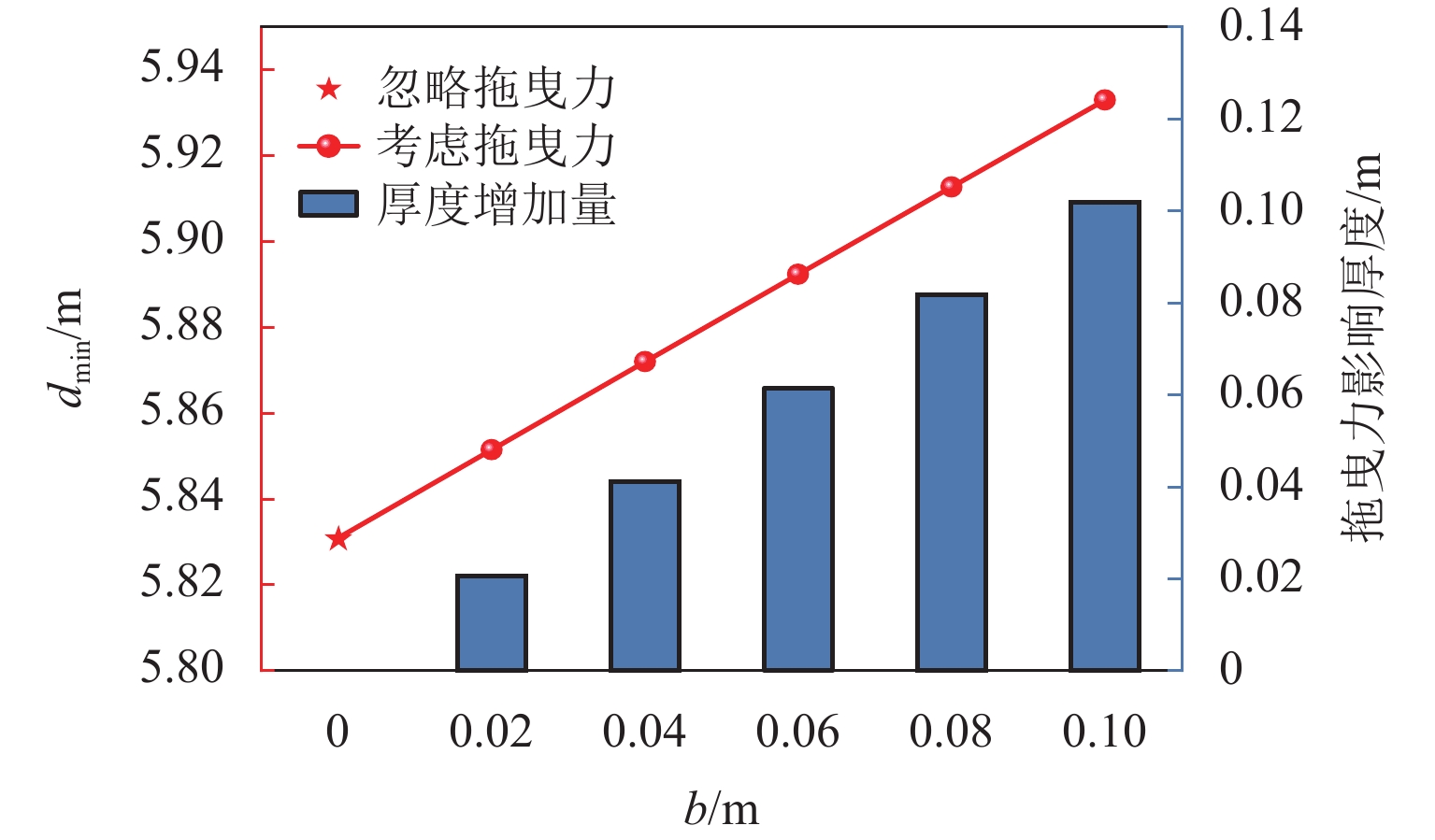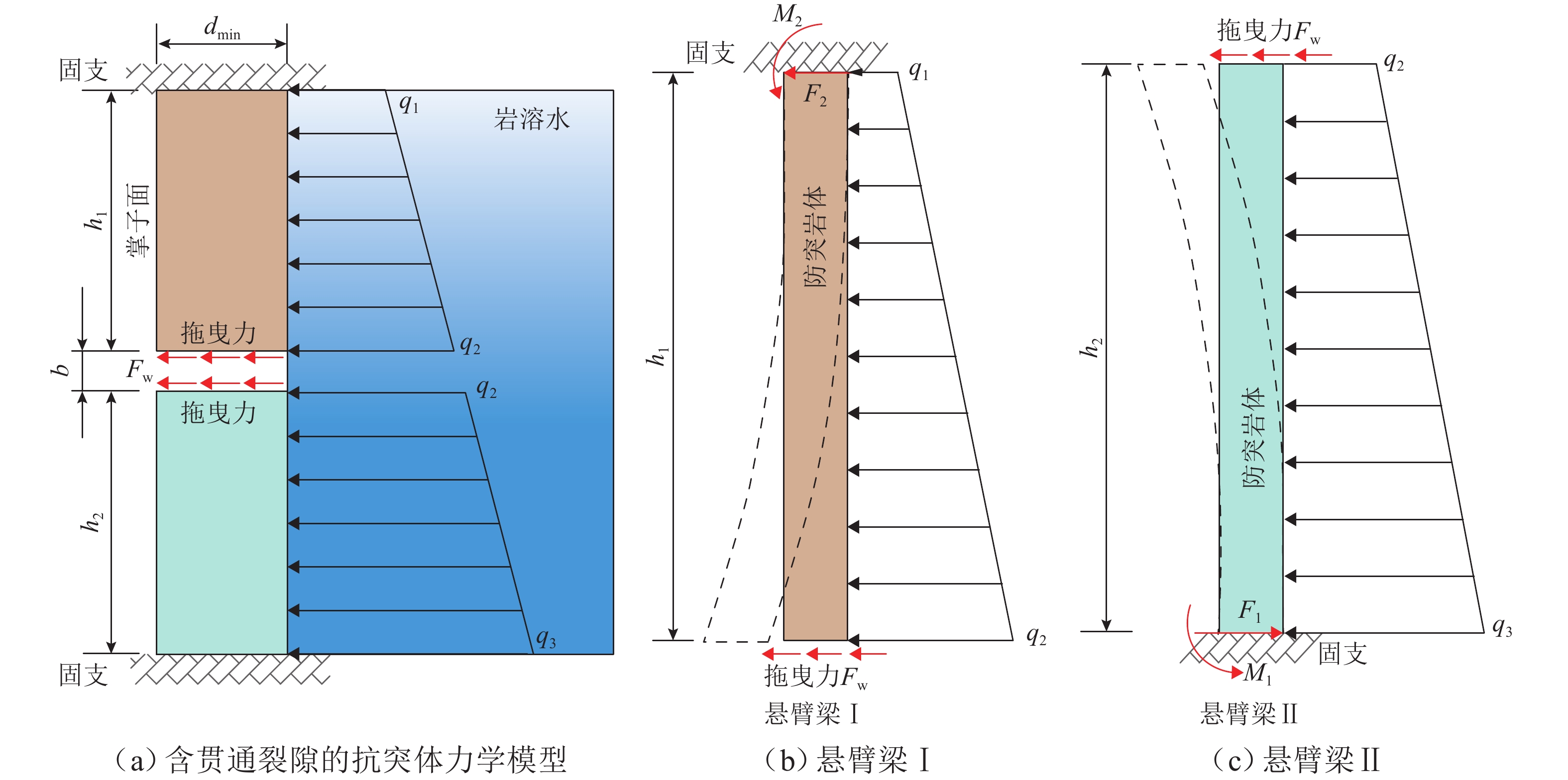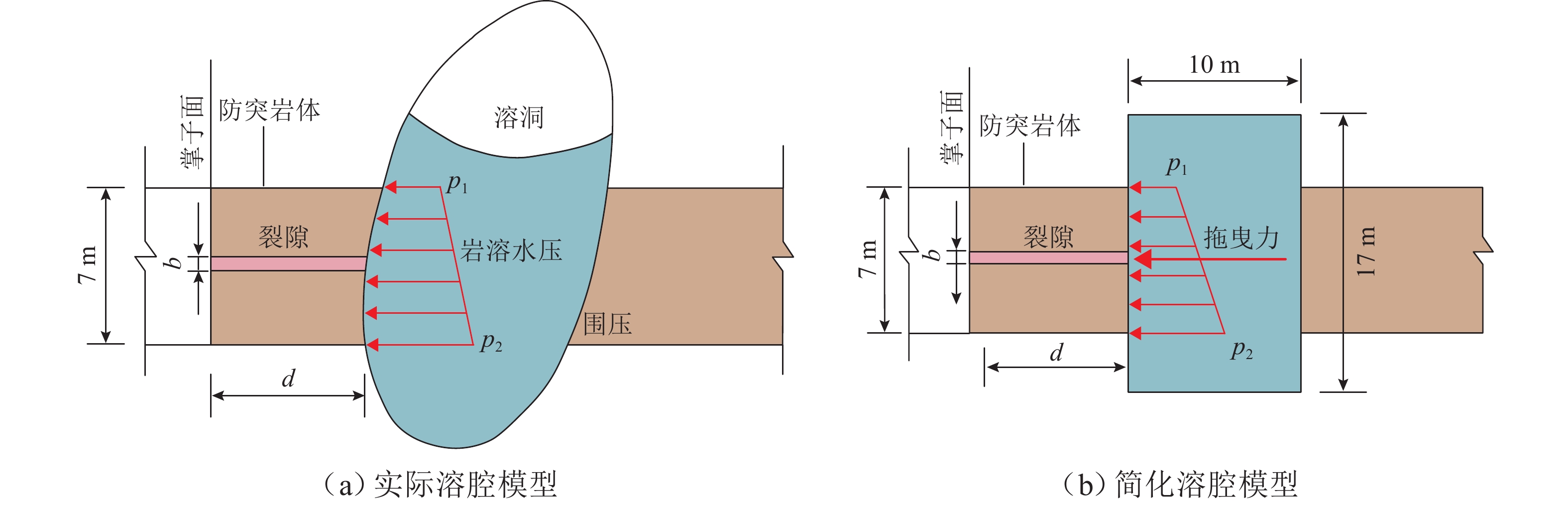 涌水突泥是岩溶隧道常见的地质灾害之一,对隧道施工安全和长期运营构成严重威胁,确保掌子面抗突体的安全性是防控涌水突泥灾害的关键. 本文围绕强渗流作用下掌子面抗突体的稳定性问题,构建隧道掌子面强渗流裂隙抗突体的力学分析模型;充分考虑水流在贯通裂隙壁面上产生的拖曳力效应,系统推导强渗流作用下岩溶隧道抗突体的最小安全厚度公式;结合参数敏感性分析和工程实例,采用有限差分软件FLAC3D进一步分析掌子面前方含贯通裂隙和富水溶腔下隧道开挖围岩的稳定性,深入探讨关键参数对抗突体稳定性的影响机制. 研究结果表明:裂隙开度的增大显著增强了拖曳力的作用效果;强渗流条件下,裂隙拖曳力对抗突体最小安全厚度具有显著的不利影响,且其影响程度随着裂隙开度的增加非线性增强;在不同位置分布,裂隙对最小安全厚度的影响有显著差异,存在一个临界过渡点(悬臂梁Ⅰ、Ⅱ长度比= 5.07∶4.93),在该过渡点,裂隙上、下梁板发生同步破坏,进一步揭示了裂隙位置与结构失稳之间的内在关联. 研究成果可为岩溶隧道掌子面抗突体厚度设计、岩溶灾害治理(如注浆封堵、裂隙加固与渗流控制)以及施工期风险分级与监测预警指标选取提供理论依据与工程指导.