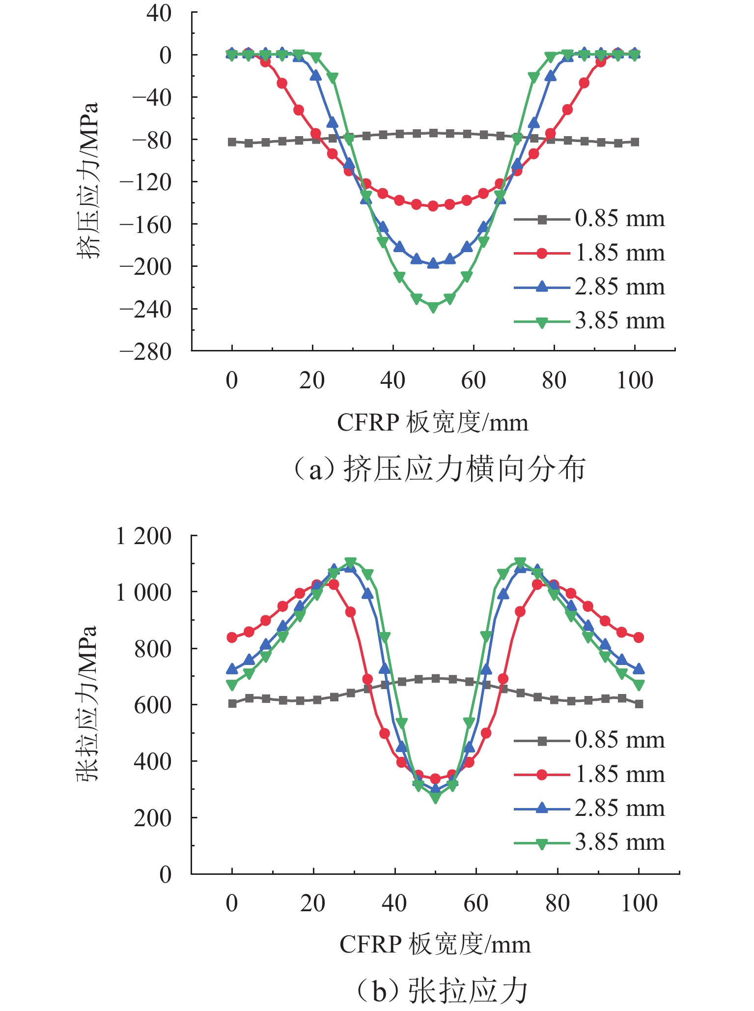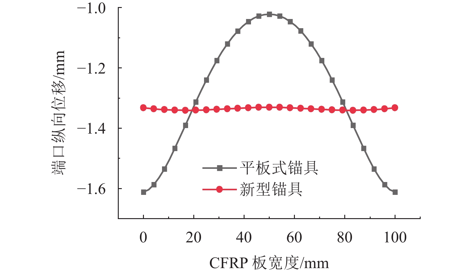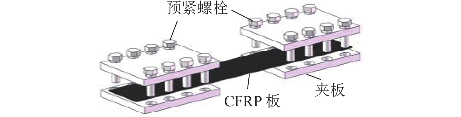 针对现有CFRP板锚固技术中挤压应力横向分布不均匀导致板材承拉后易撕裂破坏,难以控制螺栓预紧力的问题,本文研制了双曲面CFRP板锚具,其主要构造特征为外夹板设有横向圆弧面(可使CFRP板所受挤压应力横向分布较均匀),内夹板设有纵向圆弧面(可充分挤压锚固区中段,避免端口处剪切破坏);通过限位片控制外夹板挤压位移,以实现所需的预紧力锚固CFRP板;对6组新型锚具试件进行锚固性能试验,探究其受力机理;利用ANSYS有限元软件进行受力模拟,深入分析影响锚固性能的关键参数,同时与平板式锚具的受力性能展开对比. 研究表明:外夹板厚度是影响CFRP板挤压应力横向分布不均匀的主要因素,当外夹板厚度为27 mm时,CFRP板挤压应力横向分布较均匀,最大与最小压应力之差仅为9.3 MPa;内、外夹板的弧面设计优化了CFRP板挤压应力分布状态,同时减小了碳纤维间的应力差,使CFRP板的横向变形更同步;试件破坏状态为撕裂破坏,但新型锚具锚固效率系数可达104.16%.